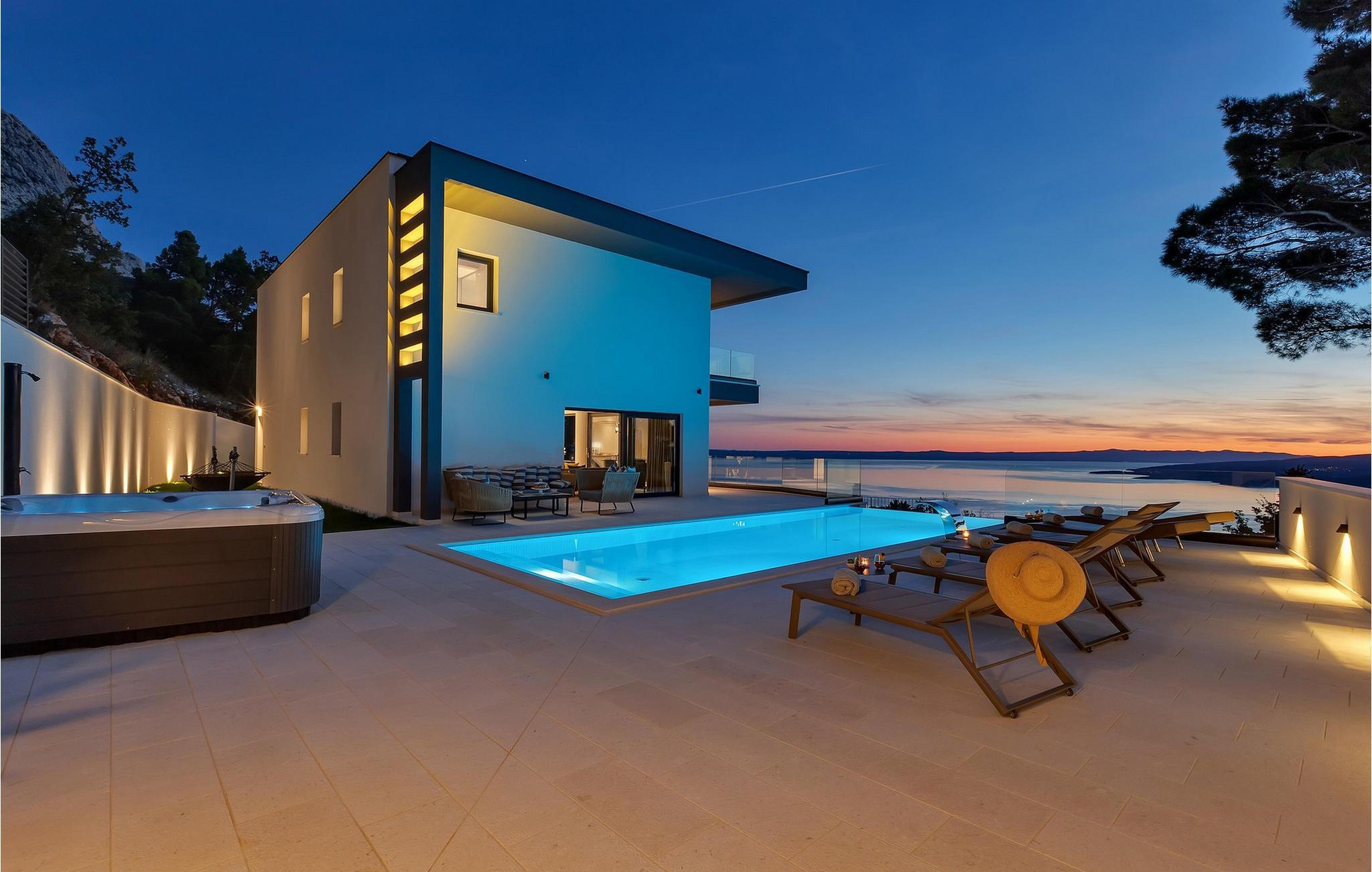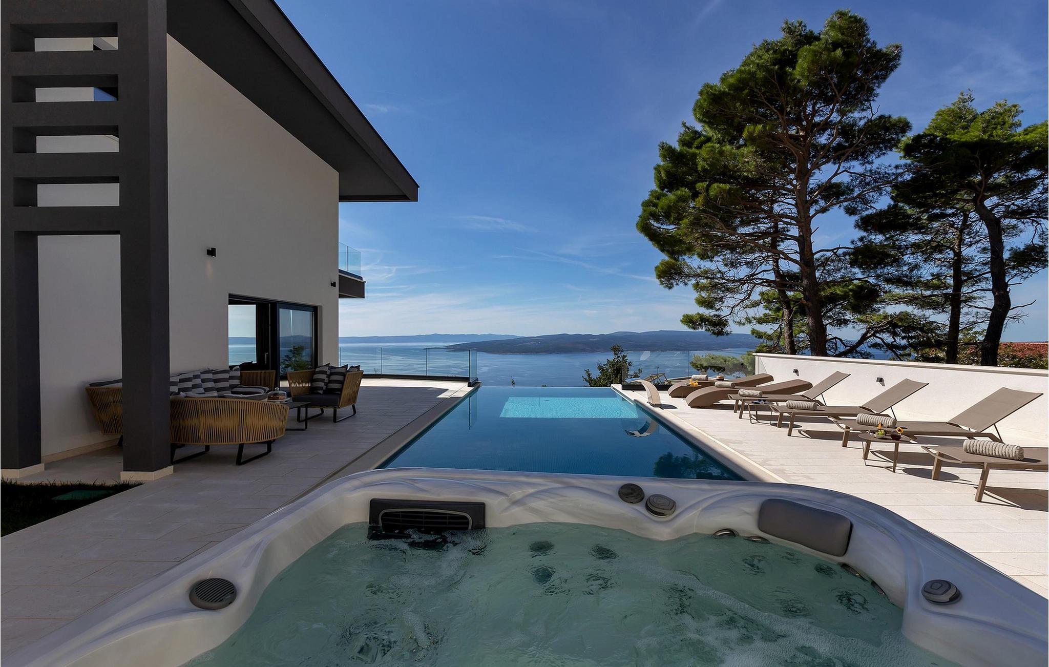 Erfrischen Sie sich im eleganten Pool oder lassen Sie den Blick über das endlose Blau des Meeres schweifen, während Sie sich auf einer der komfortablen Liegen entspannen. Am Abend verwandelt sich die Terrasse in einen magischen Ort: Schenken Sie sich ein Glas Wein ein und erleben Sie, wie die Sonne den Himmel in goldene und violette Töne taucht. Lassen Sie den Tag entspannt in geselliger Runde unterm Sternenhimmel bei einer gemeinsamen Mahlzeit und beim Geschichtenerzählen ausklingen.