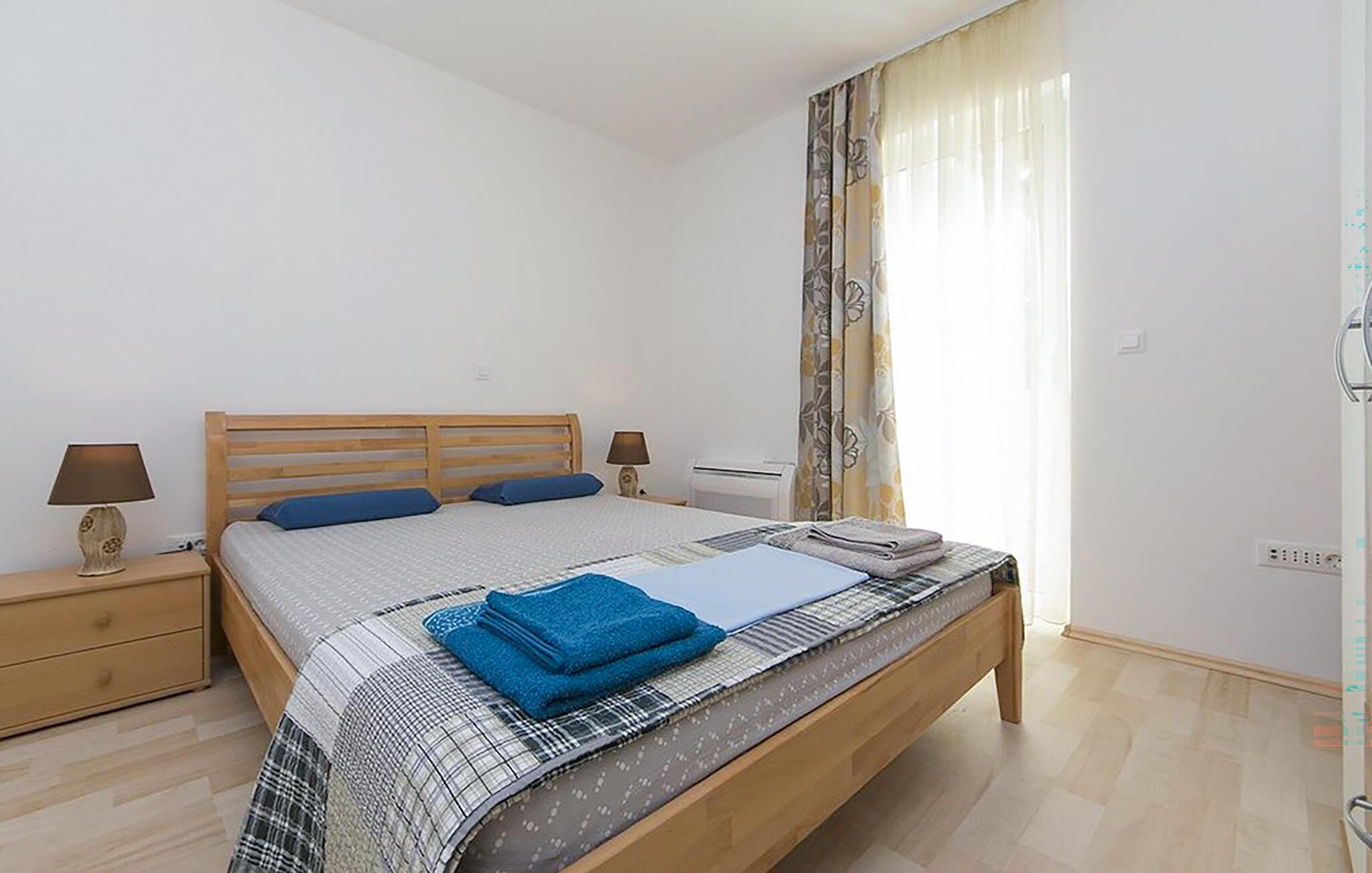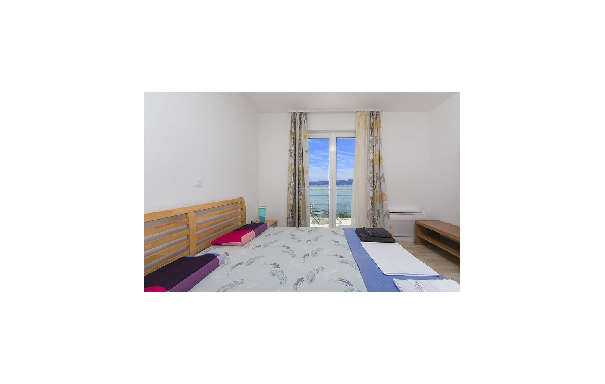 Lassen Sie sich beim Betreten Ihrer hellen Ferienwohnung sofort vom weiten Blick auf die Adria begeistern. Nehmen Sie im Wohnbereich auf dem Sofa Platz und genießen Sie das eindrucksvolle Panorama durch die großen Fenstertüren. Der offen gestaltete Raum verbindet Wohnen, Essen und Kochen auf harmonische Weise. Bereiten Sie in der kompakten, funktionalen Küche Ihre Mahlzeiten zu und decken Sie den Esstisch am Fenster, um mit direktem Meerblick zu speisen. Ziehen Sie sich abends in das Schlafzimmer zurück, öffnen Sie die Balkontür und lassen Sie die frische Meeresluft herein. Morgens wachen Sie mit dem wundervollen Meerblick auf.