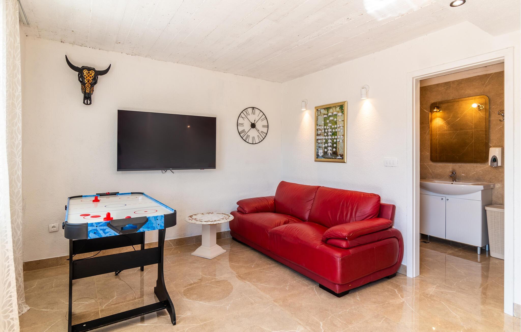 In Lokvicici empfängt Sie dieses schöne Ferienhaus, das das ideale zuhause für Sie und Ihre Familie und Ihren Vierbeiner ist. Die authentische Einrichtung mit dunklem Holz trägt zum charmanten Flair des Hauses bei uns lässt Sie darin gerne verweilen. Im Haus können Sie auf dem Stepper schwitzen oder auch Darts spielen. Im Außenbereich des Hauses können Sie entspannen, den gemauerten Ofen zum Zubereiten Ihrer Mahlzeiten nutzen und im gemütlichen Ambiente Ihre Abendessen im Kreise der Familie einnehmen. Erfrischen können Sie sich jederzeit im großen Pool, von dem Sie auch eine schöne Aussicht auf die Landschaft haben.
