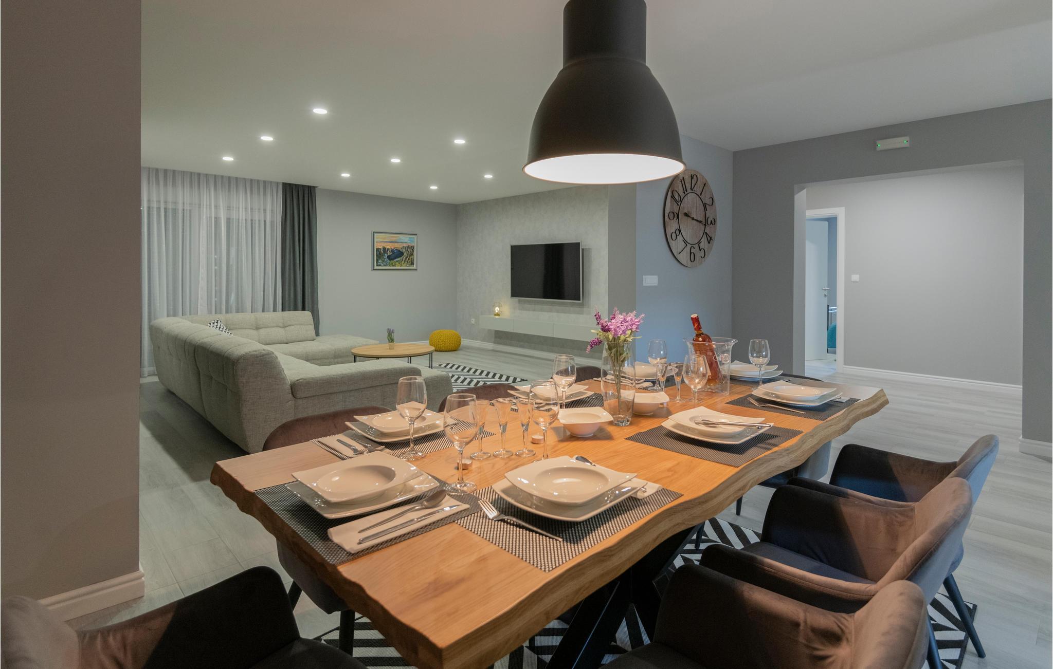 Ausgezeichnetes Ferienhaus liegt auf einem weitläufigen Grundstück, oberhalb der Stadt Imotski. Dieses Erdgeschosshaus bietet alles, was den Urlaub für Sie und Ihre Familie erholsam und gemütlich macht. Vor dem Haus befindet sich ein Swimmingpool mit Kinderbecken, die an heißen Sommertagen für die nötige Erfrischung sorgen. Gleich daneben steht Ihnen eine überdachte Terrasse mit Grill zur Verfügung. Freizeitausstattung wie Billard, Kicker, Tischtennis und Trainingsgeräte im Aufenthaltsraum sorgen für mehr Unterhaltung. Die Kleinsten Gäste können sich währenddessen am Spielplatz vergnügen. Die Lage des Hauses, unweit schöner Seen sowie Rad- und Wanderwege ist ideal für zusätzliche Aktivitäten und Spaziergänge. Besuchen Sie auch die Stadt Imotski, wo in den Sommermonaten viele Veranstaltungen stattfinden. Die Kiesstrände der Makarska Riviera sind etwa eine halbe Autostunde entfernt.