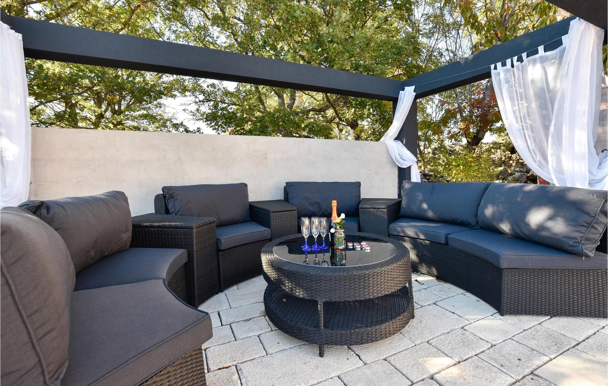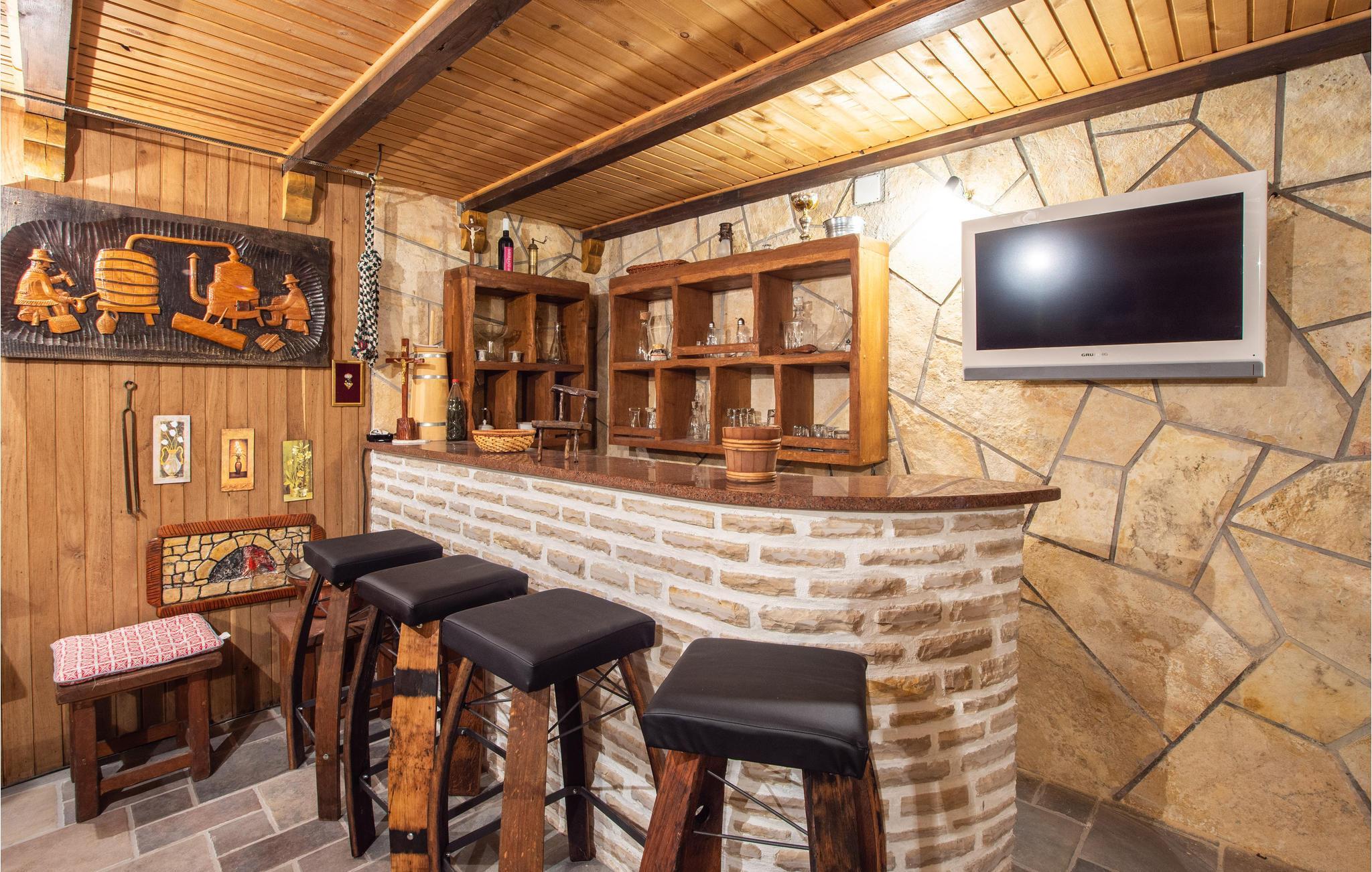 Die Schlafgelegenheiten teilen sich auf mehrere gemütliche Schlafzimmer auf. Wenn Sie Lust auf besonderes Beisammensein haben, besuchen Sie den urigen Tavernenbereich mit Weinfässern und Bar, oder die geräumige Terrasse mit magischer nächtlicher Beleuchtung. Komplette Entspannung verspricht auch ein heißes Bad mit Blick durchs Fenster auf die grüne Landschaft.