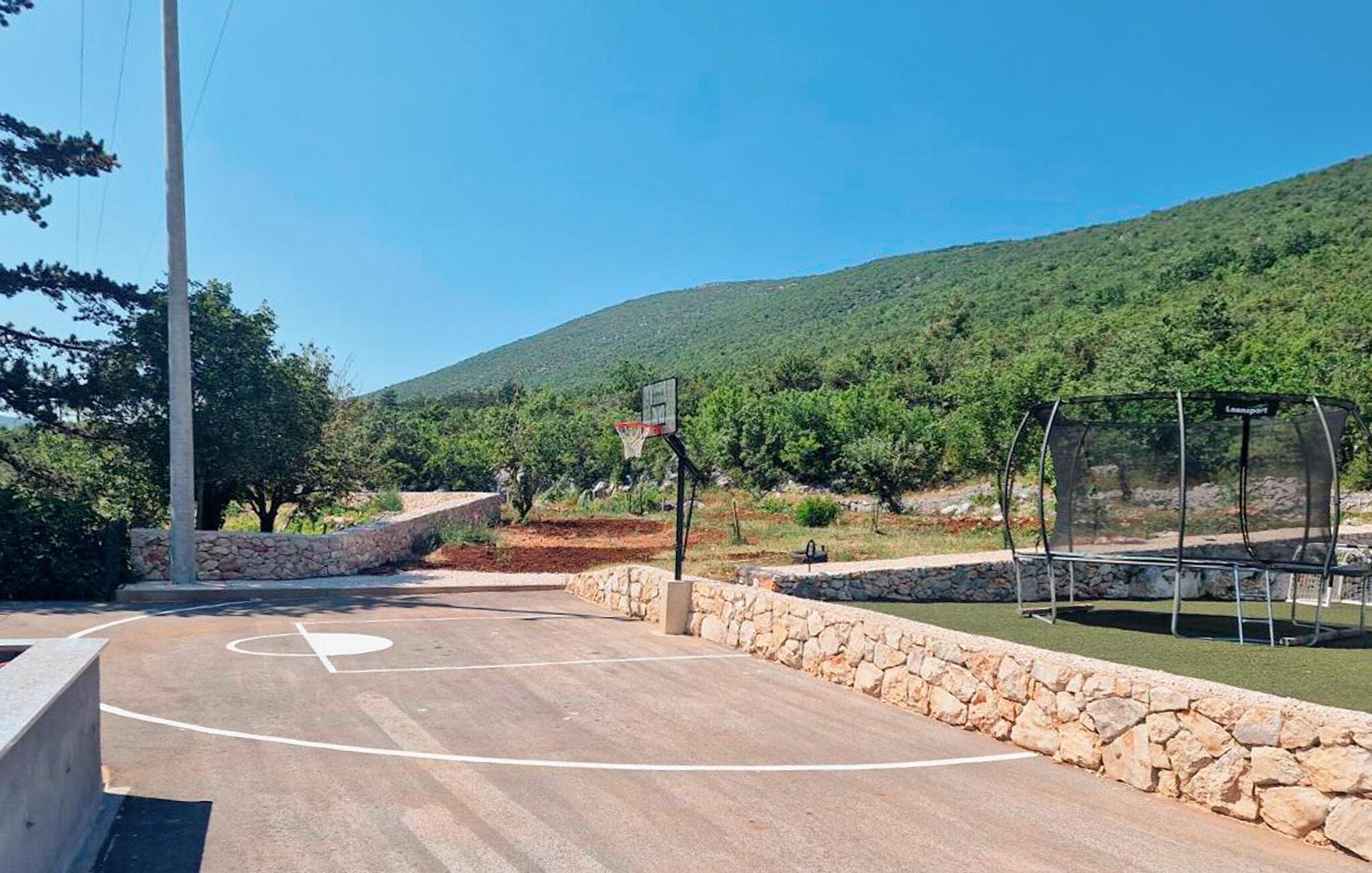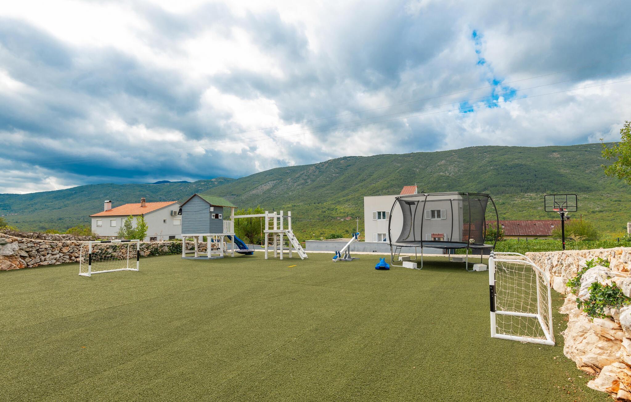 Sonnen Sie sich im windgeschützten Poolbereich Ihres Ferienhauses und feiern Sie hier die mediterranen Sommernächte beim Schlemmen am Grill. Wer es gerne romantisch mag, reserviert sich zum Sonnenuntergang ein Plätzchen mit Panoramablick im Whirlpool auf der sensationellen Dachterrasse. Gönnen Sie auch Ihren Kindern eine sorglose Auszeit beim Basketball- oder Fußballspielen, auf dem Trampolin oder im Spielhaus.