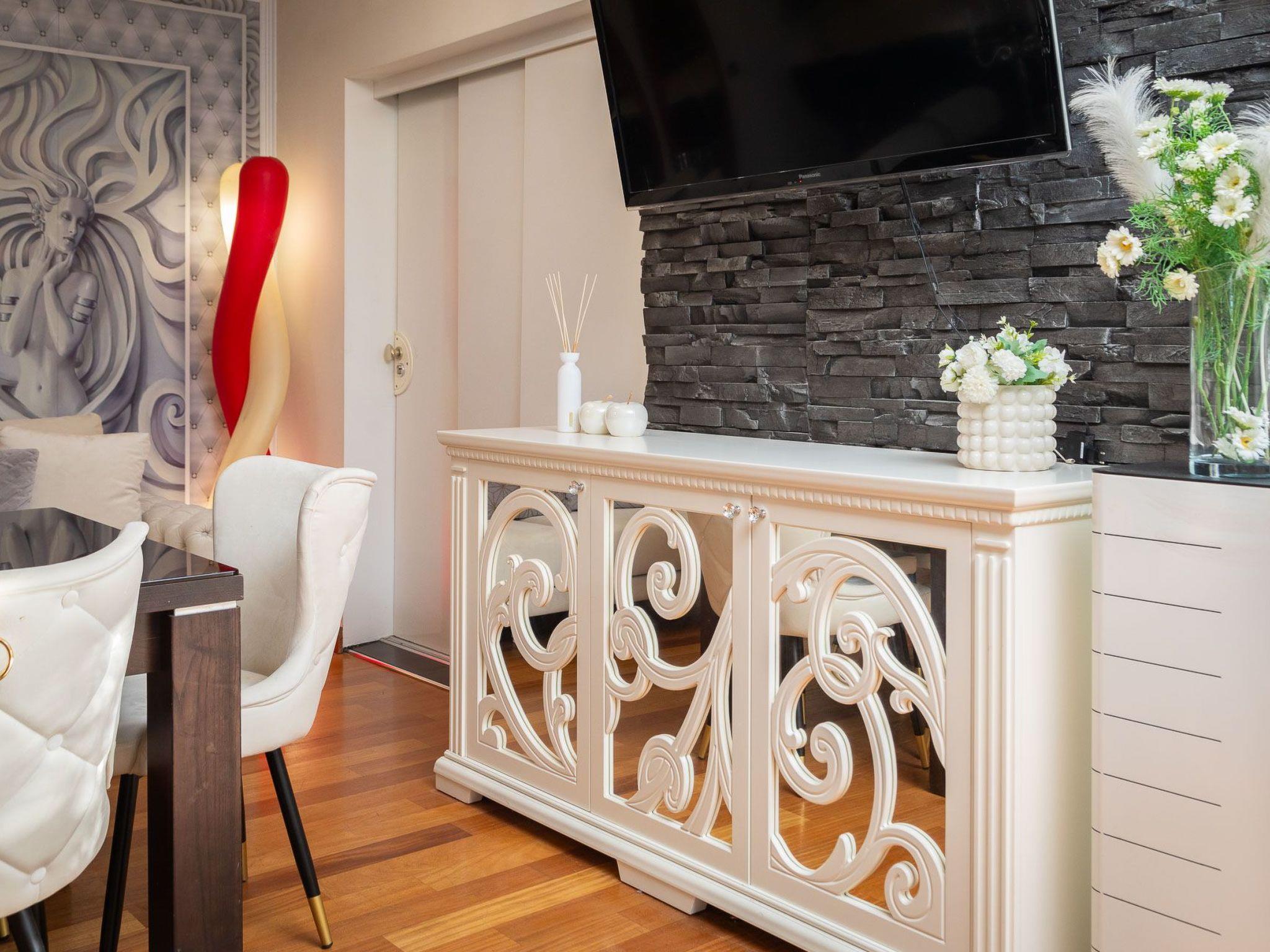 Inside, the apartment boasts two well-appointed bedrooms featuring comfortable bedding and efficient air conditioning, ensuring a restful sleep even on the warmest nights. Each room is meticulously designed to provide guests with the convenience and comfort they need. The living area is spacious and welcoming with a large corner and folding sofa, perfect for gathering and relaxing after a day of exploration. The inclusion of a Full HD TV adds an entertainment option for guests. The kitchen does not disappoint - equipped with a dishwasher, a 3-plate stove, an electric kettle, and a comprehensive set of kitchenware, it invites guests to prepare their meals with ease.
