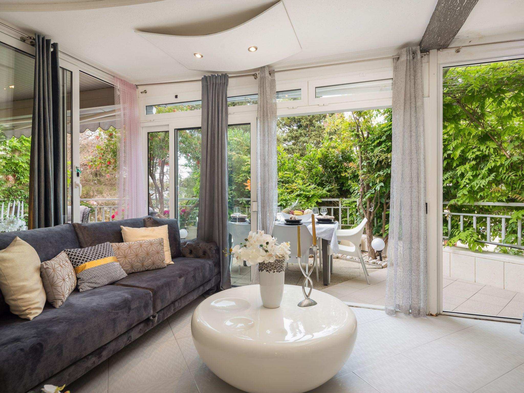 Inside, the apartment boasts a welcoming atmosphere with all the essentials for a relaxing holiday. Equipped with air conditioning throughout, guests can enjoy a comfortable climate regardless of the outdoor temperatures. The living area is designed for leisure and entertainment with a TV and plush seating that includes two sofa beds and two armchairs convertible into beds, ensuring ample space for all guests. The practicalities are covered with a washing machine for exclusive use, making longer stays worry-free. The small yet fully functional kitchen includes a 3-plate stove, mini oven, dishwasher, filter coffee machine, and an electric kettle, catering to all your culinary needs.