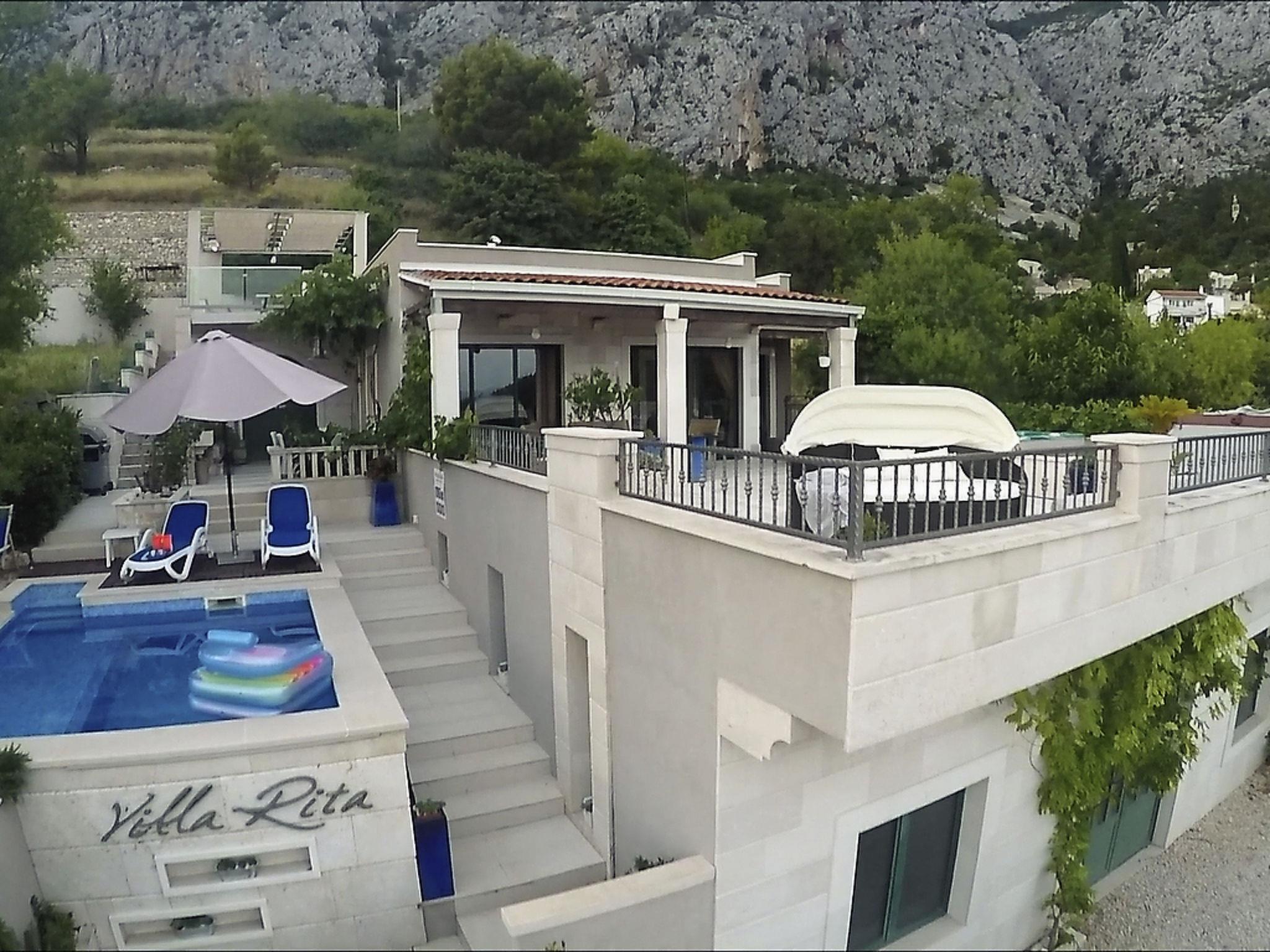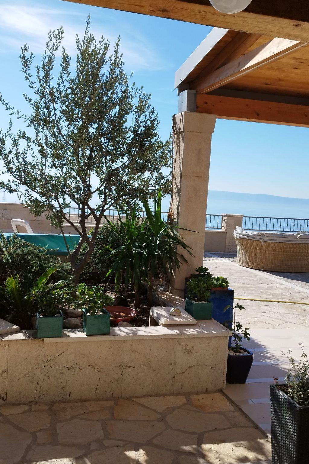 The 100m² furnished and partially roofed terrace affords a wonderful sea view to the south. To the north there is a breathtaking view of the Biokovo mountain massif with olive groves. There is a little swimming pool for relaxing, with loungers, a whirlpool and an outdoor sauna. The garden with its Mediterranean plants is also an ideal place to relax. The 700m² site is enclosed and so suitable for children and pets. Parking spaces are available.
