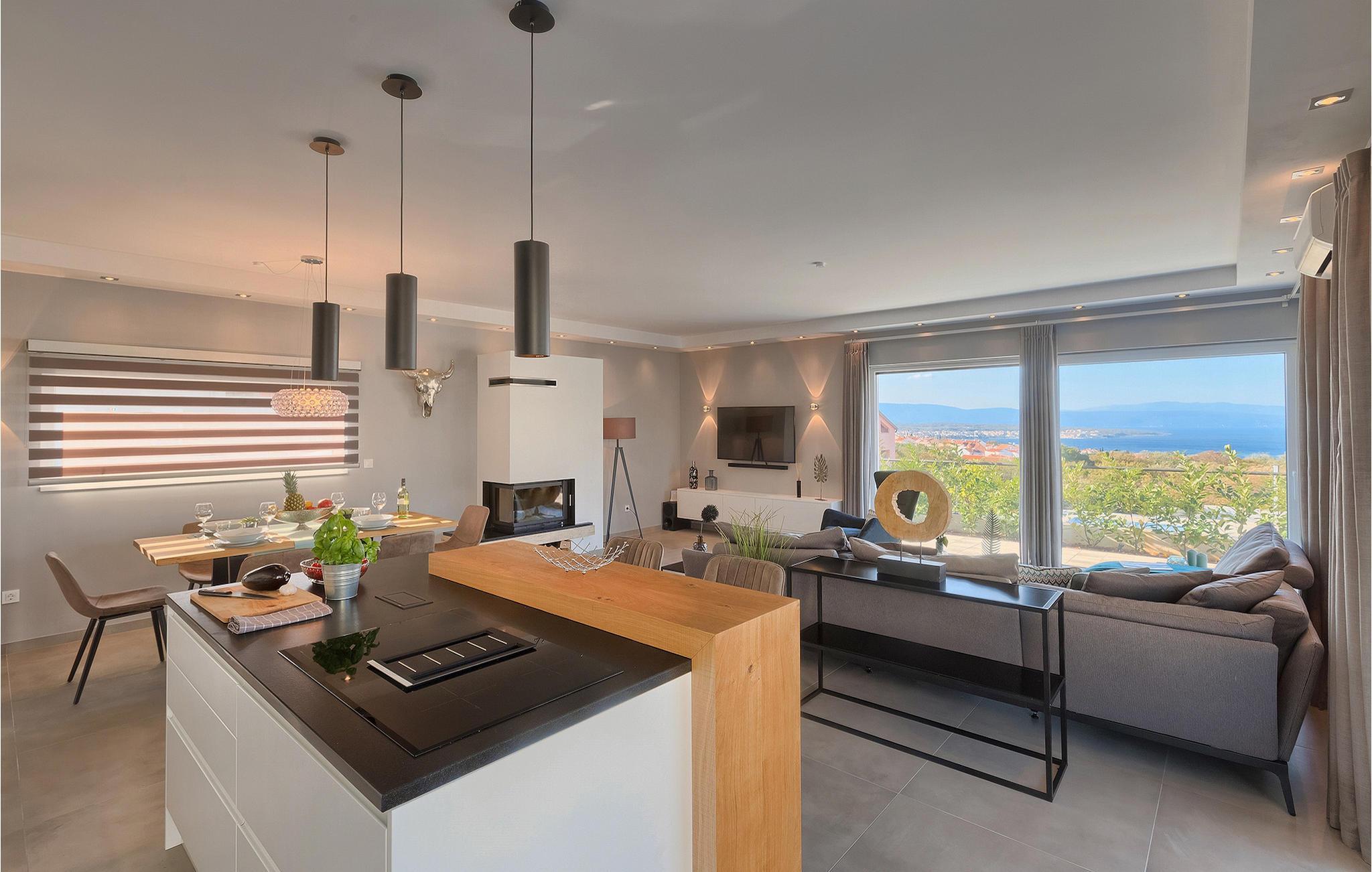 Zur Verfügung stehen Ihnen auch ein Gasgrill und ein überdachter Essbereich im Freien, wo Sie Ihre Kochkünste genießen und nebenbei einen wunderschönen Ausblick genießen können.Villa Good Vibes befindet sich in Malinska, einem bekannten Touristenziel auf der westlichen Küste der Insel Krk. Krk ist dank seiner guten Verbindung mit dem Festland leicht zu erreichen. Malinska können Sie mit unterschiedlichen Verkehrsmitteln erreichen, wie z.B. Auto, Bus, Schiff und Flugzeug. Der Flughafen von Rijeka ist ca. 10 km von Malinska entfernt wie auch die Krk-Brücke, die die Insel mit dem Festland verbindet. Malinska war einst der wichtigste Hafen der Insel und ein beliebtes Reiseziel der Wiener Aristokratie und ist bis heute eines der bekannten europäischen Reiseziele geblieben. Mildes, mediterranes Klima, zahlreiche Naturschönheiten und ein reiches Kulturerbe sind die bedeutenden Merkmale von Malinska. Dank der üppigen Vegetation und dem Mikroklima ist Malinska als Gesundheits- und Badeort bekannt geworden und während des Jahres finden zahlreiche Konzerte klassischer und traditioneller Musik statt. Malinska bietet zahlreiche Aktivitäten: Rad- und Wanderwege, viele davon wunderschön am Meer entlang, aber auch Wassersportaktivitäten wie Parasailing, Jet-Ski, Tretbootfahren und Tauchen. Erkunden Sie mit dem Boot herrliche Buchten oder machen Sie einen Ausflug auf die nahegelegene Insel Cres. Das gastronomische Angebot der Insel können Sie in zahlreichen Cafes und Restaurants genießen, während Geschäfte ebenfalls leicht zu erreichen sind.