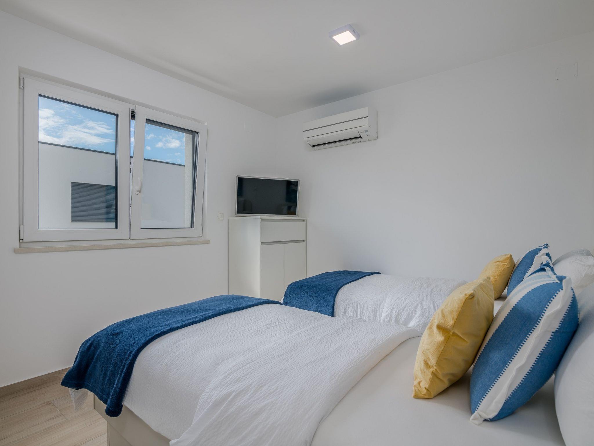 Ferienwohnung bietet Platz für 4 Gäste. Die Betten sind in Schlafzimmern, die es 2 gibt, innerhalb einer Gesamtfläche von 68m2, angeordnet. Die Gäste haben eine eigene Terrasse zur Verfügung, auf der sie in warmen Sommernächten genießen können. Das Apartment bietet Meerblick. IM PREIS INBEGRIFFEN: Kurtaxe, Endreinigung, Klimatisierung, Parkplatz, Internet. VERBINDLICHE ZUSÄTZLICHE KOSTEN: Aufzahlung für Kurzaufenthalte (prozentualer Zuschlag pro Nächtigungsanzahl: 30% - 1, 20% - 2, 10% - 3). Die Verfügbarkeit zusätzlicher Dienstleistungen in Ihrem reservierten Termin und die Preise derselben (falls nicht aufgeführt) müssen im Voraus überprüft werden. Zusätzliche Dienstleistungen die in der Zahlungsaufforderung nicht aufgeführt sind werden direkt beim Vermieter bezahlt, angenommen der Gast nutzt auch diese.