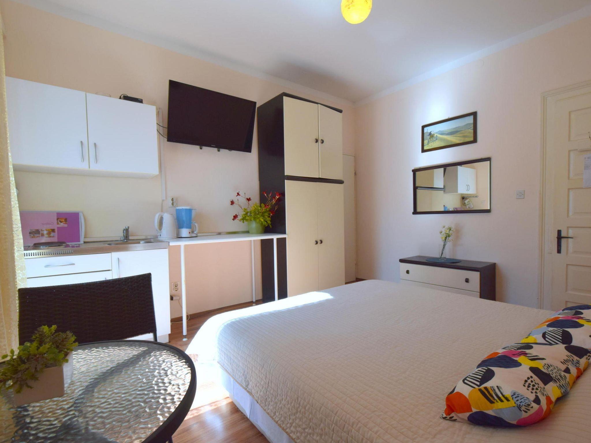 Studio bietet Platz für 2 Gäste. Die Betten sind in Schlafzimmern, die es 1 gibt, innerhalb einer Gesamtfläche von 20m2, angeordnet. Die Gäste haben einen eigenen Balkon zur Verfügung, auf der sie in warmen Sommernächten genießen können. Das Studio-Apartment bietet Meerblick. IM PREIS INBEGRIFFEN: Kurtaxe, Endreinigung, Klimatisierung, Parkplatz, Internet. Die Verfügbarkeit zusätzlicher Dienstleistungen in Ihrem reservierten Termin und die Preise derselben (falls nicht aufgeführt) müssen im Voraus überprüft werden. Zusätzliche Dienstleistungen die in der Zahlungsaufforderung nicht aufgeführt sind werden direkt beim Vermieter bezahlt, angenommen der Gast nutzt auch diese.