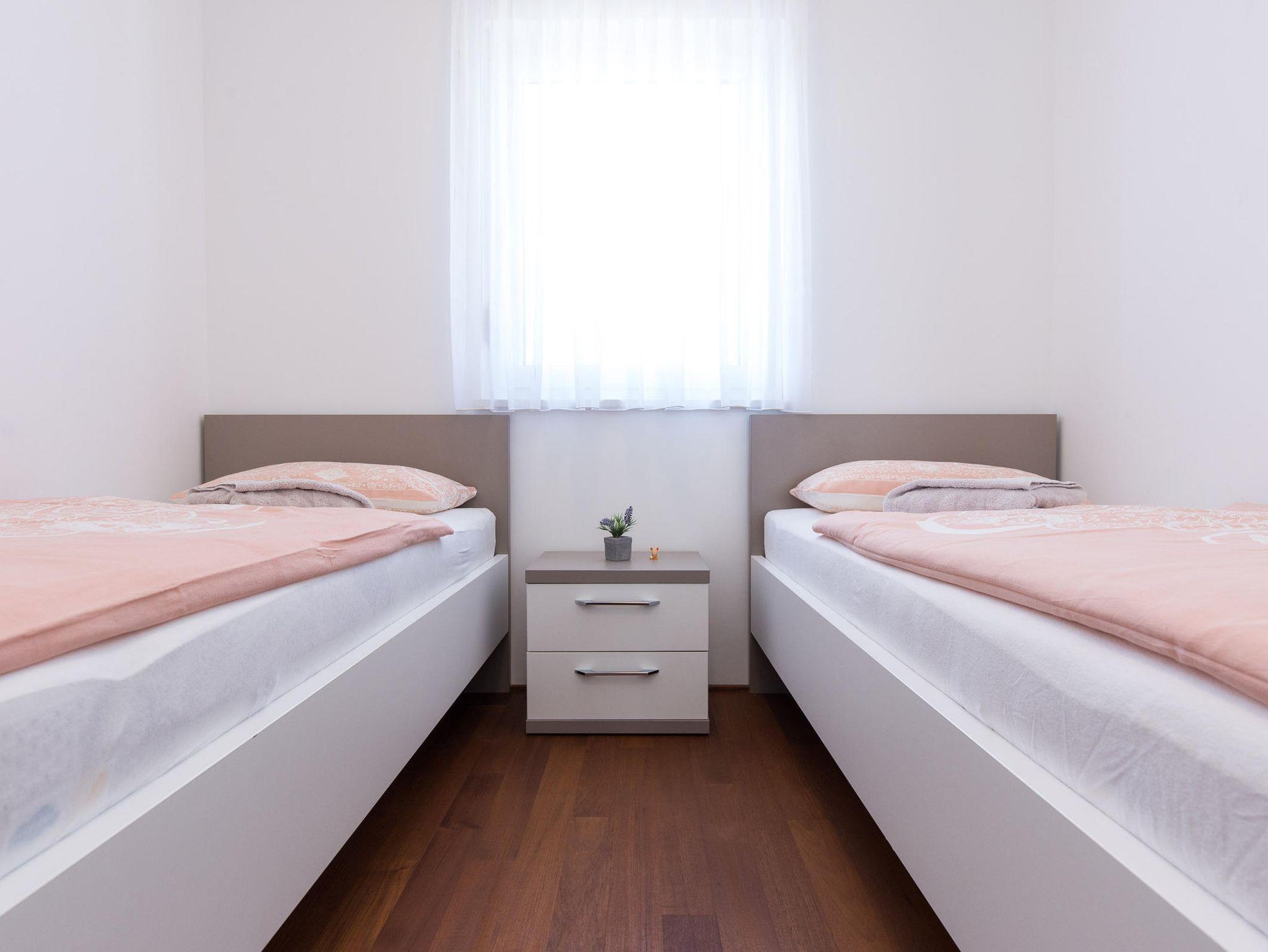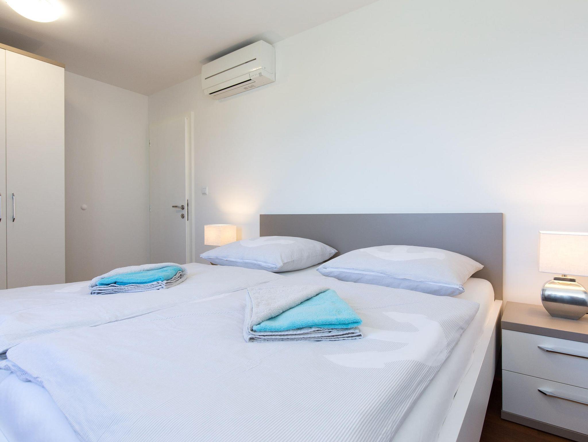 Ferienwohnung bietet Platz für 5 Gäste. Die Betten sind in Schlafzimmern, die es 2 gibt, und in Wohnzimmer, innerhalb einer Gesamtfläche von 64m2, angeordnet. Die Gäste haben eine eigene Terrasse zur Verfügung, auf der sie in warmen Sommernächten genießen können. Das Apartment bietet Meerblick. IM PREIS INBEGRIFFEN: Kurtaxe, Endreinigung, Klimatisierung, Internet. VERBINDLICHE ZUSÄTZLICHE KOSTEN: Aufzahlung für Kurzaufenthalte (prozentualer Zuschlag pro Nächtigungsanzahl: 30% - 1, 20% - 2, 10% - 3). Die Verfügbarkeit zusätzlicher Dienstleistungen in Ihrem reservierten Termin und die Preise derselben (falls nicht aufgeführt) müssen im Voraus überprüft werden. Zusätzliche Dienstleistungen die in der Zahlungsaufforderung nicht aufgeführt sind werden direkt beim Vermieter bezahlt, angenommen der Gast nutzt auch diese.