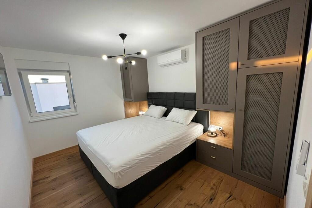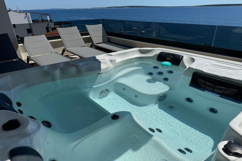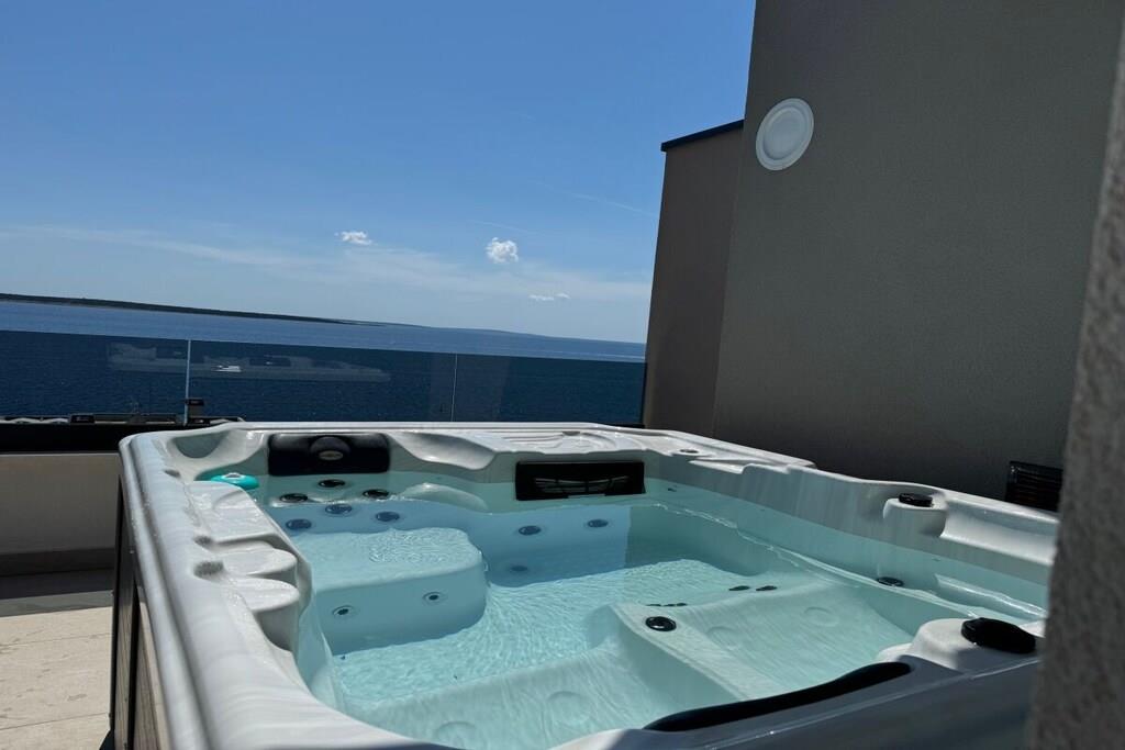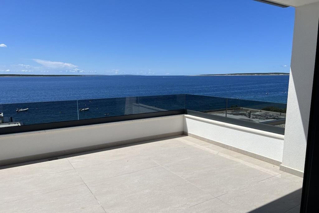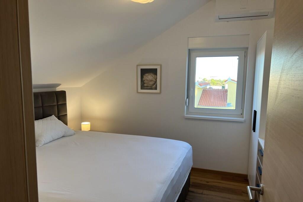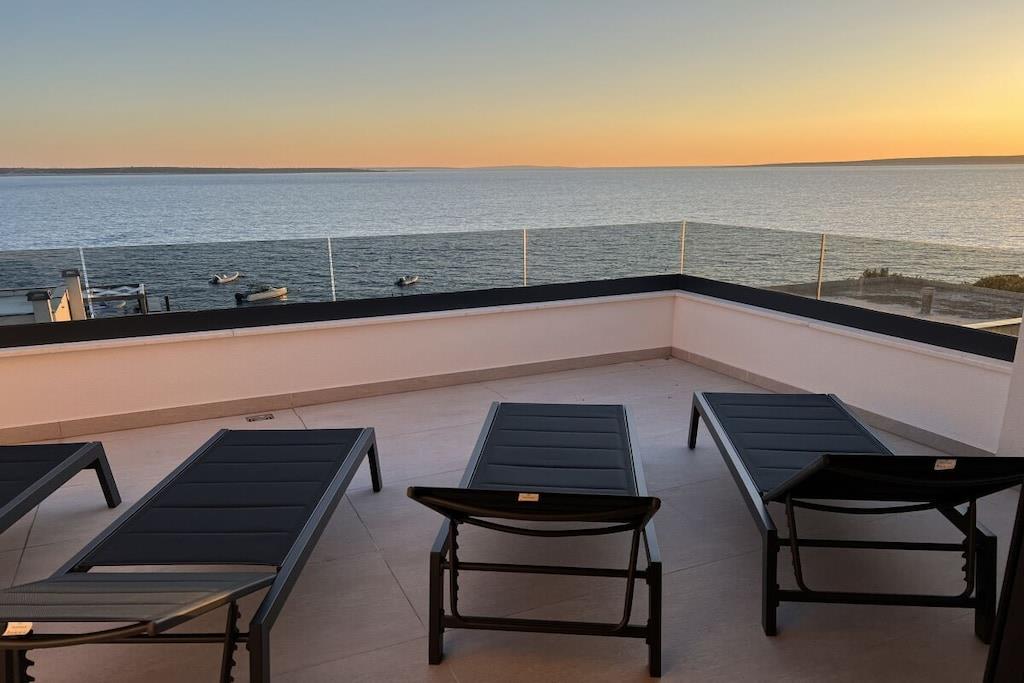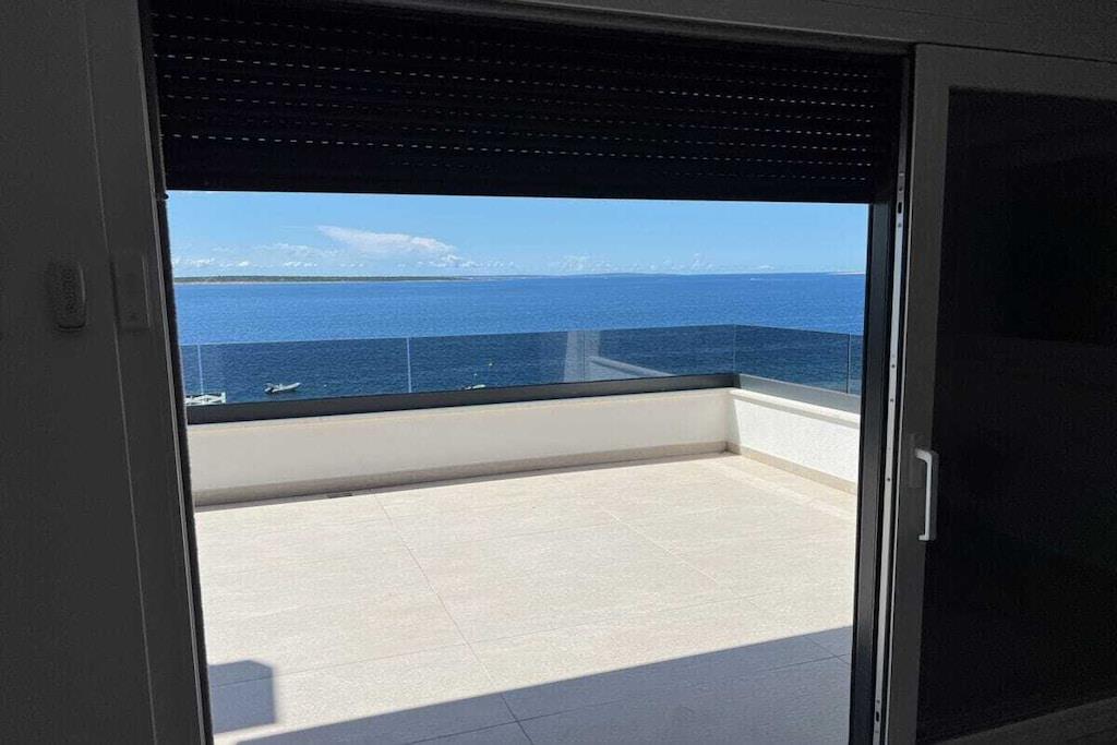 Luxurious two-story apartment of 135 m² on the island of Mandre in Pag, Croatia, for 4 to 6 people. Only 40 m from the sea and the beach. Fully equipped with top-of-the-line appliances, two bedrooms plus a gallery, a separate living room, two bathrooms, a room for exercise, a sunbathing area, and beautiful views of the sea and the islands in the distance. Four air conditioning units. The apartment is on the top floor and has an elevator. Everything is brand new. Two bedrooms plus a gallery. A whirlpool tub is on the upper terrace with a beautiful view. The kitchen is fully equipped, including a large refrigerator with ice maker and drinking water, a dishwasher, an induction cooktop with a range hood, a microwave, a coffee maker, and a toaster.