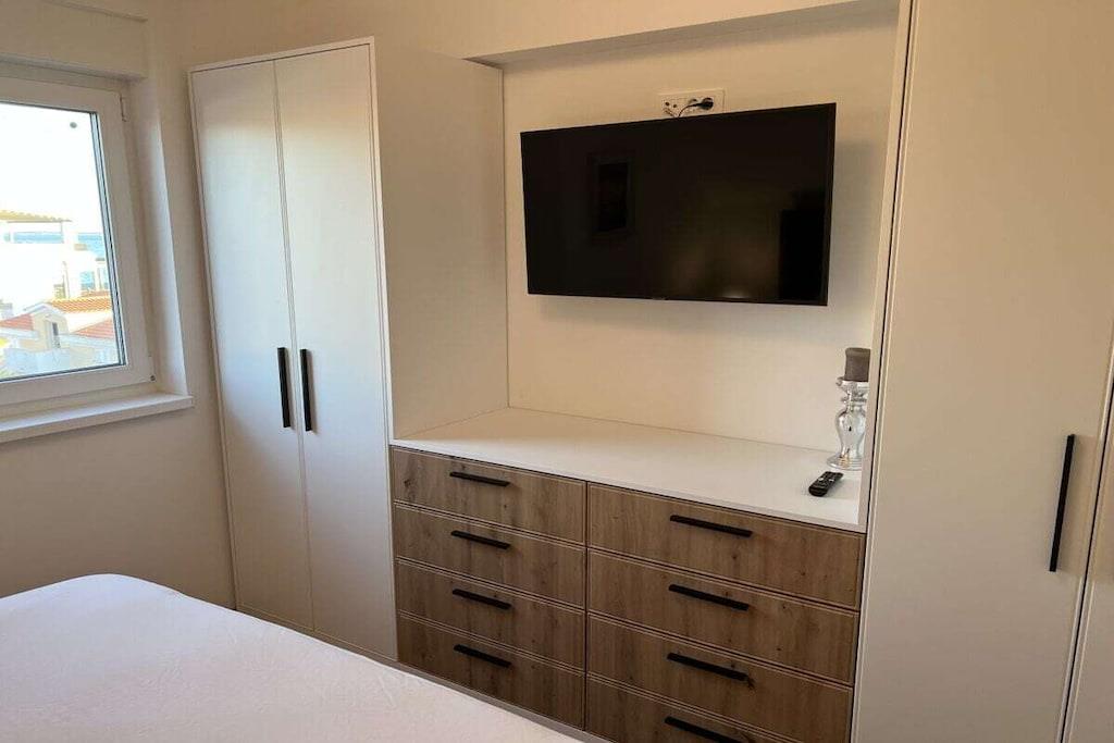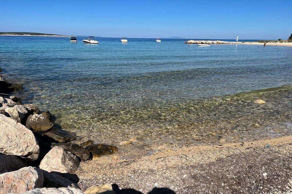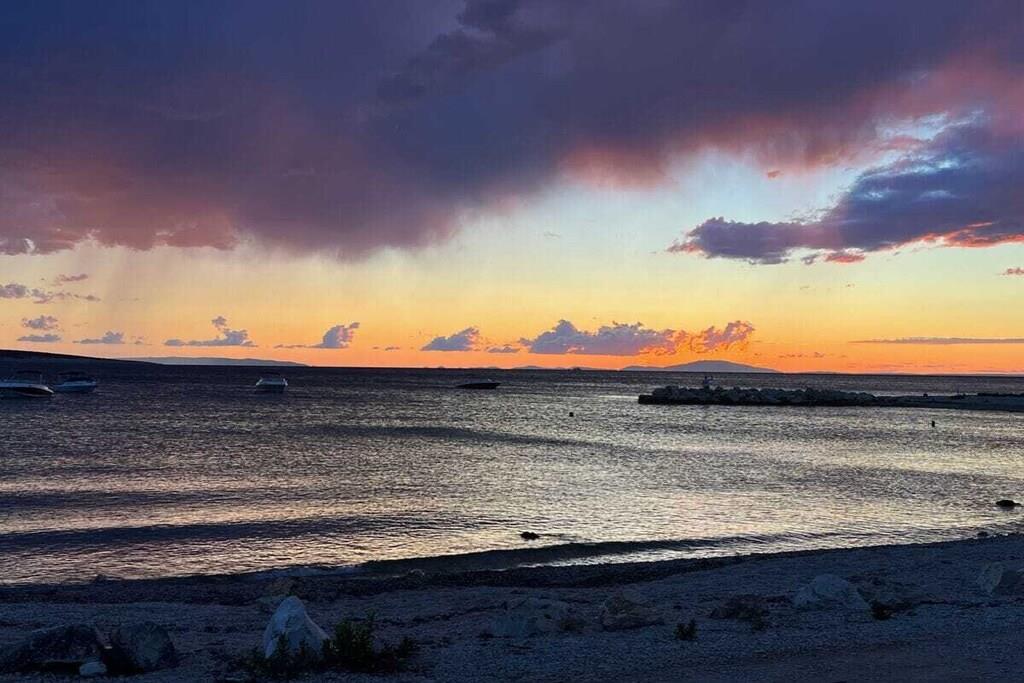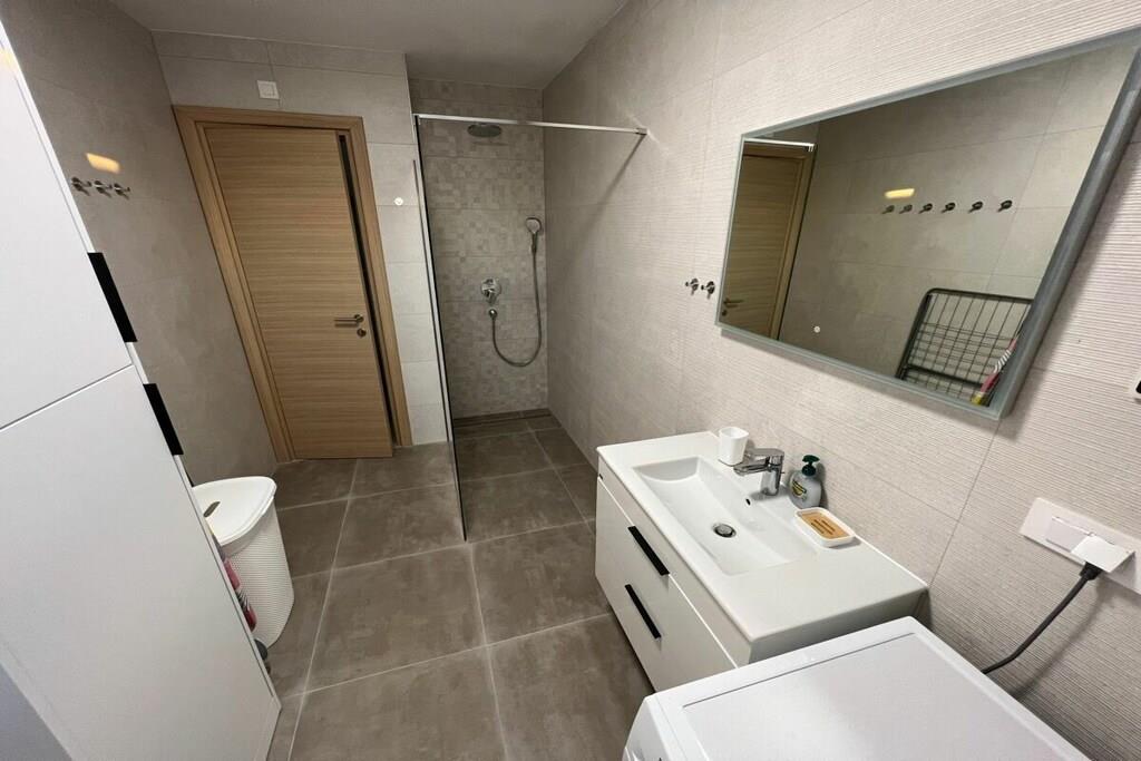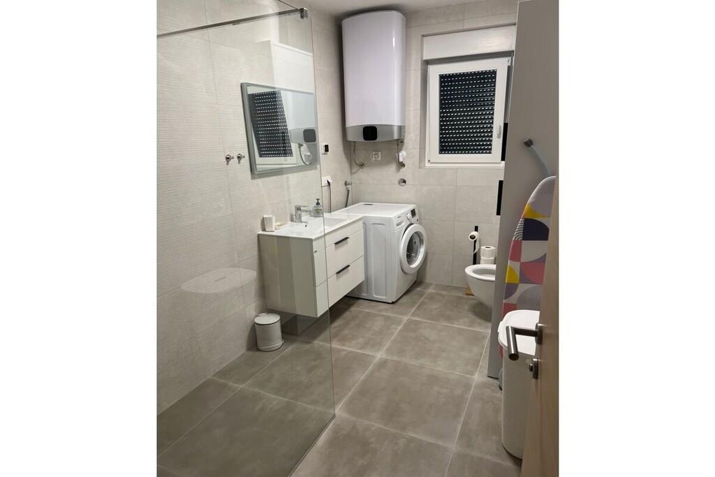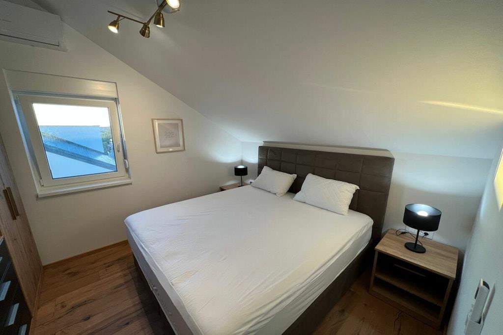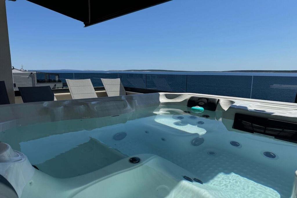 Luxurious two-story apartment of 135 m² on the island of Mandre in Pag, Croatia, for 4 to 6 people. Only 40 m from the sea and the beach. Fully equipped with top-of-the-line appliances, two bedrooms plus a gallery, a separate living room, two bathrooms, a room for exercise, a sunbathing area, and beautiful views of the sea and the islands in the distance. Four air conditioning units. The apartment is on the top floor and has an elevator. Everything is brand new. Two bedrooms plus a gallery. A whirlpool tub is on the upper terrace with a beautiful view. The kitchen is fully equipped, including a large refrigerator with ice maker and drinking water, a dishwasher, an induction cooktop with a range hood, a microwave, a coffee maker, and a toaster.