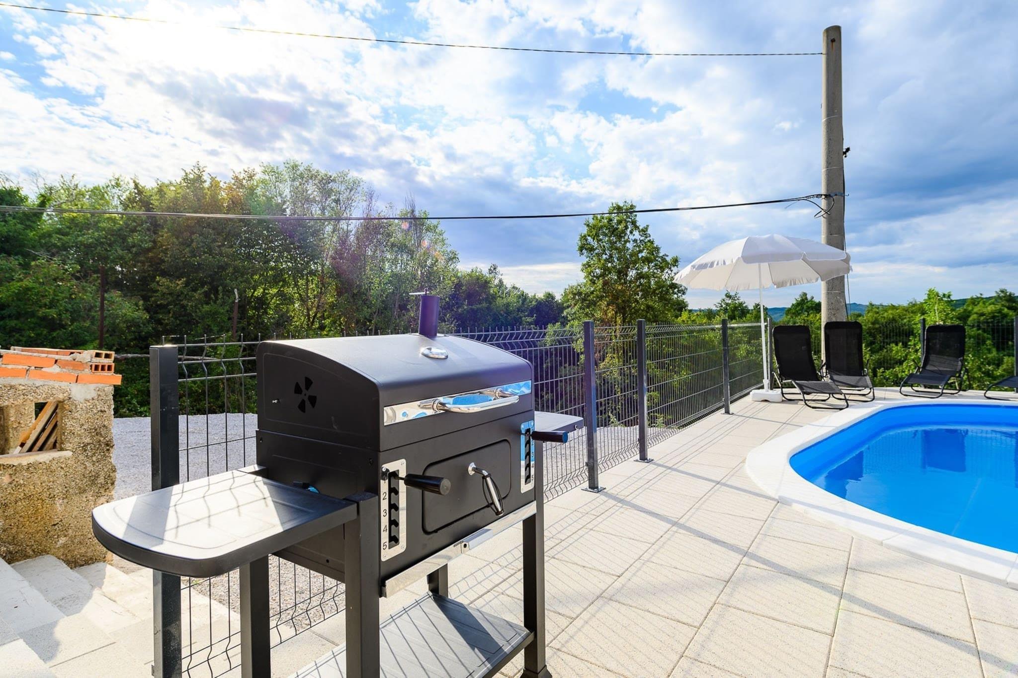 This cozy 3-bedroom apartment in Markoci offers a peaceful retreat for up to 8 guests (max. 6 adults). With 120 m² of space, it features a fully equipped kitchen, a private swimming pool, and a lush garden with outdoor furniture and a barbecue, perfect for relaxing or dining al fresco. Located in a quiet rural setting just 9 km from Labin and the beaches of Rabac, the apartment is close to essentials: a supermarket, bus stop, and restaurants are all within 1 km. The property includes a terrace, balcony, washing machine, air conditioning, satellite TV, and Wi-Fi. Open-air parking is available on-site. The kitchen is equipped with a gas/electric stove, fridge, freezer, microwave, oven, dishwasher, coffee machine, toaster, and all necessary cookware. A baby cot is available on request, making it ideal for families. Whether you're lounging by the pool or exploring Istria’s coast, this apartment offers comfort and convenience in a beautiful countryside setting.