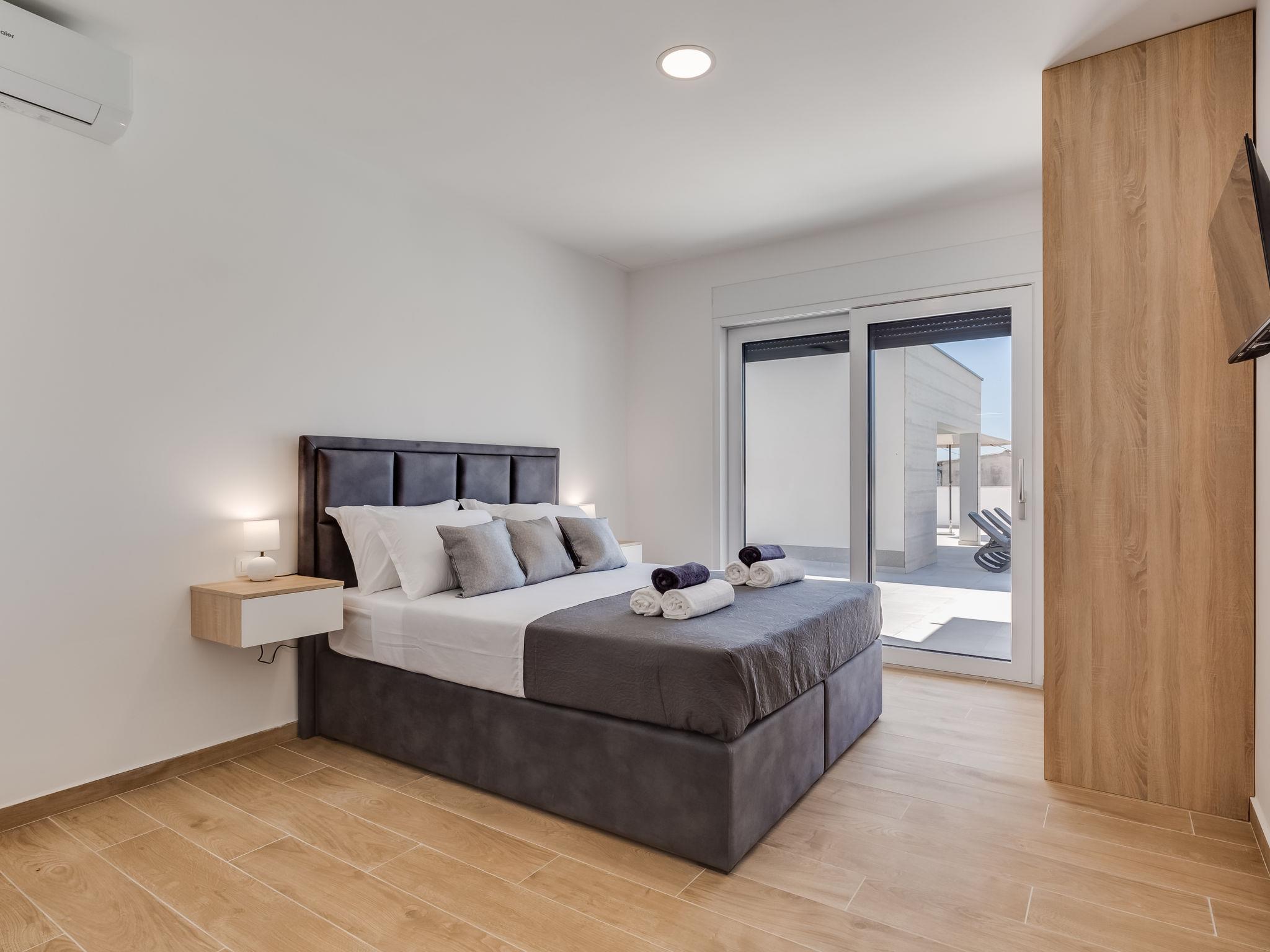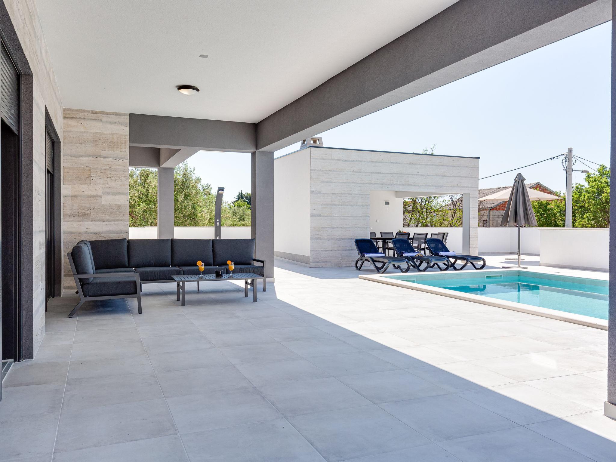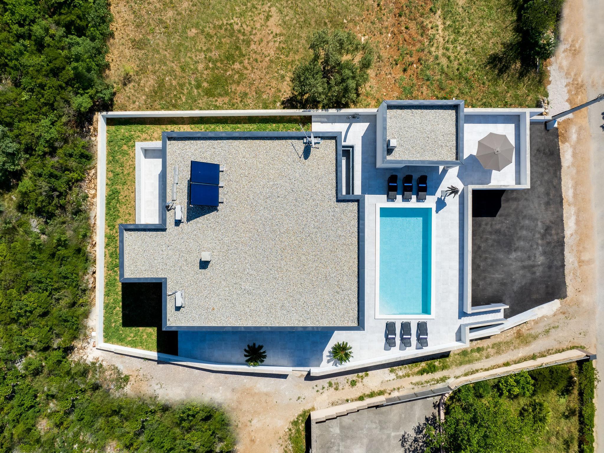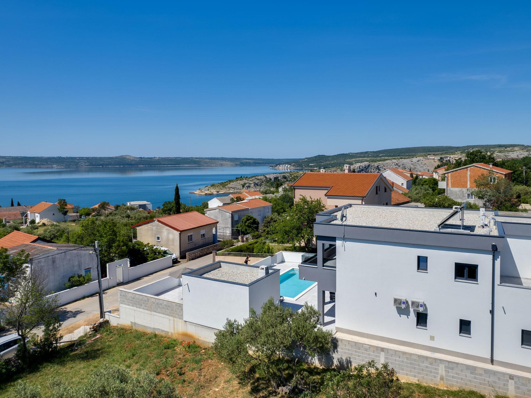 Modern villa "Solis", 2 storeys, built in 2024. 28 km from the centre of Zadare, in a sunny, elevated position, 400 m from the sea, 400 m from the beach, located by a road. Private: property 600 m2 (fenced), swimming pool angular (8 x 4 m, depth 150 cm, seasonal availability: 02.May. - 26.Sep.). Garden furniture, barbecue. In the house: internet access, washing machine. Parking at the house on the premises. Shop 100 m, restaurant 400 m, bus stop 900 m, pebble beach 500 m. Nearby attractions: NP Paklenica 17 km, rafting Zrmanja 35 km. Groups of teenagers on request only.
