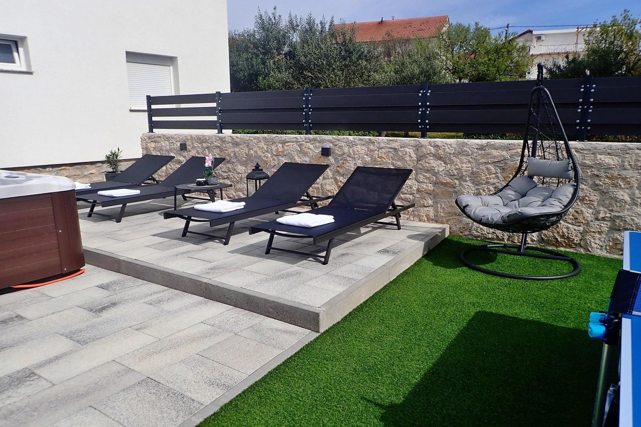 In Maslenica, in a quiet location and the perfect vacation spot for those who want to relax from the daily hustle and bustle. The apartment is equipped with many amenities, is surrounded by greenery and offers a sea view from the terrace. For cozy hours there is a grill in the garden with a covered seating area and an additional closed room. NEW in 2024: Whirlpool and sunbeds in the garden, table tennis plate. The place Maslenica is located on the Bay of Novigrad, between Starigrad Paklenica and Zadar. The Novigrad Sea is known for its fishing and shellfish farming. Above all, the popular mussels are bred here. They thrive best where the fresh water of the Zrmanja River flows into the sea and is very nutrient-rich. Highlights included: consumption-based energy costs, bed linen, towels, final cleaning, tourist tax, registration fee, WiFi. Activities nearby: boat trips and water sports with sea kayaks, Diving, snorkeling, canoe safaris and fishing are available nearby. Hiking, climbing and mountain biking in a beautiful setting is very possible in the Paklenica National Park. The 400 meter high cliffs, caves, grottos and bizarre rock formations make this landscape an outstanding natural experience. However, you will not only find a barren karst landscape here, because the steep rocky slopes are covered with dense and unusual pine forest due to the climate. Mobility : Not suitable for people with reduced mobility.