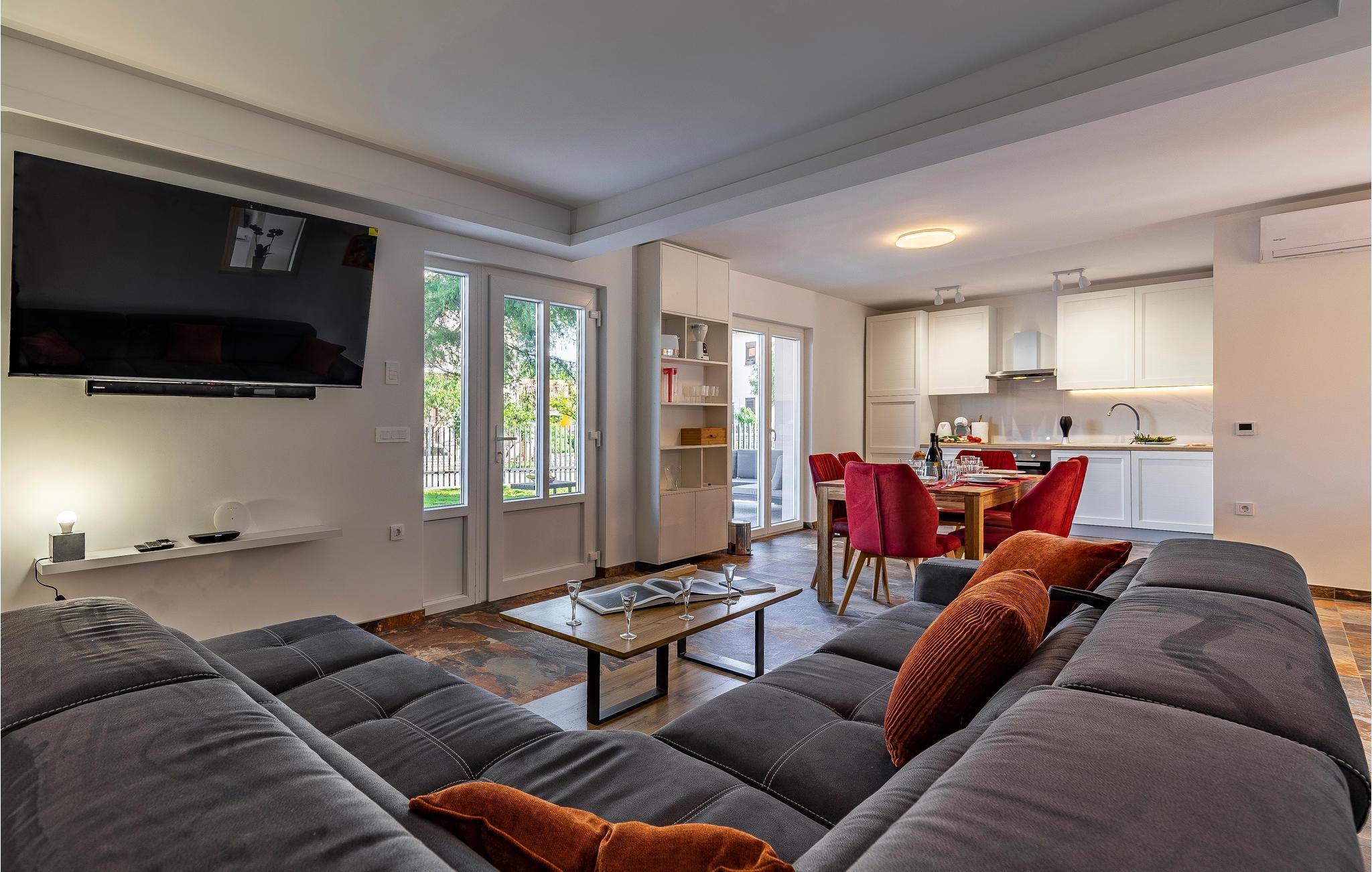 Kommen Sie nach Medulin in diese schöne Ferienwohnung und freuen Sie sich auf einen fantastischen Urlaub mit Sonne, Strand und Meer. Die moderne und luxuriöse Ausstattung bietet Ihnen alles, was Sie für eine entspannte Auszeit benötigen. Der natürliche Sammelpunkt ist die hübsche Wohnküche, in der Sie gemeinsam Ihre Mahlzeiten einnehmen und von der Sie aus auf den Außenbereich mit privatem Pool gelangen. Erfrischen Sie sich zwischendurch und sonnen Sie sich anschließend auf einer der Liegen. Am Abend können Sie ein leckeres Barbecue am Steingrill für Ihre Liebsten zubereiten.