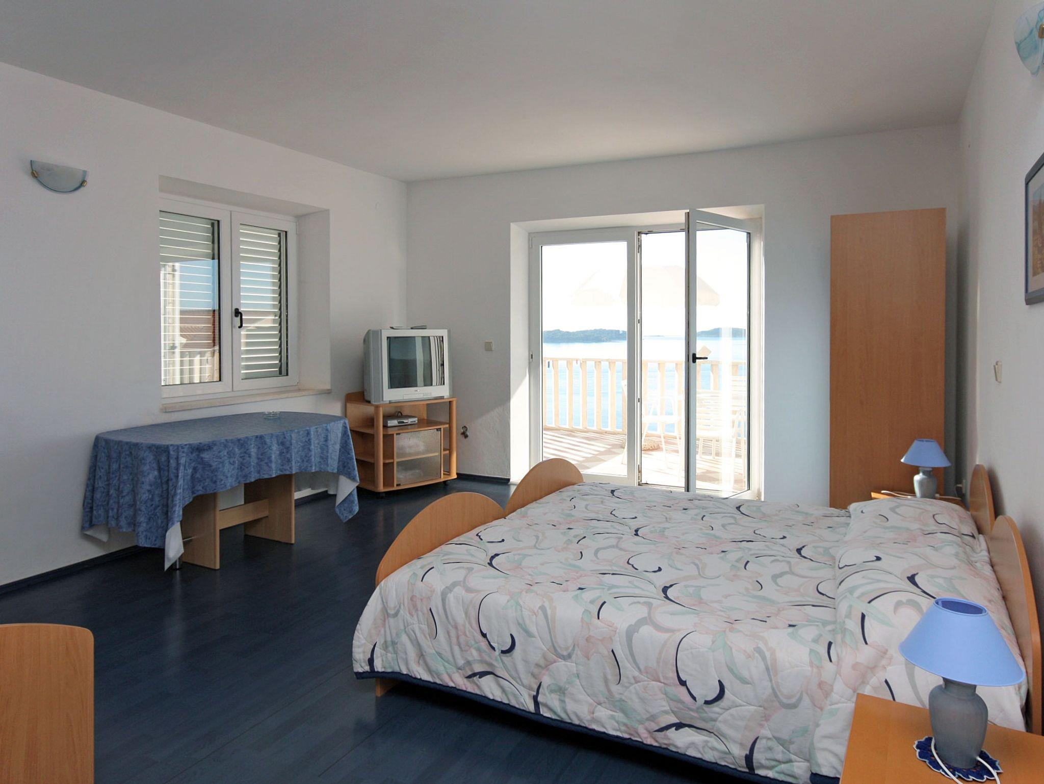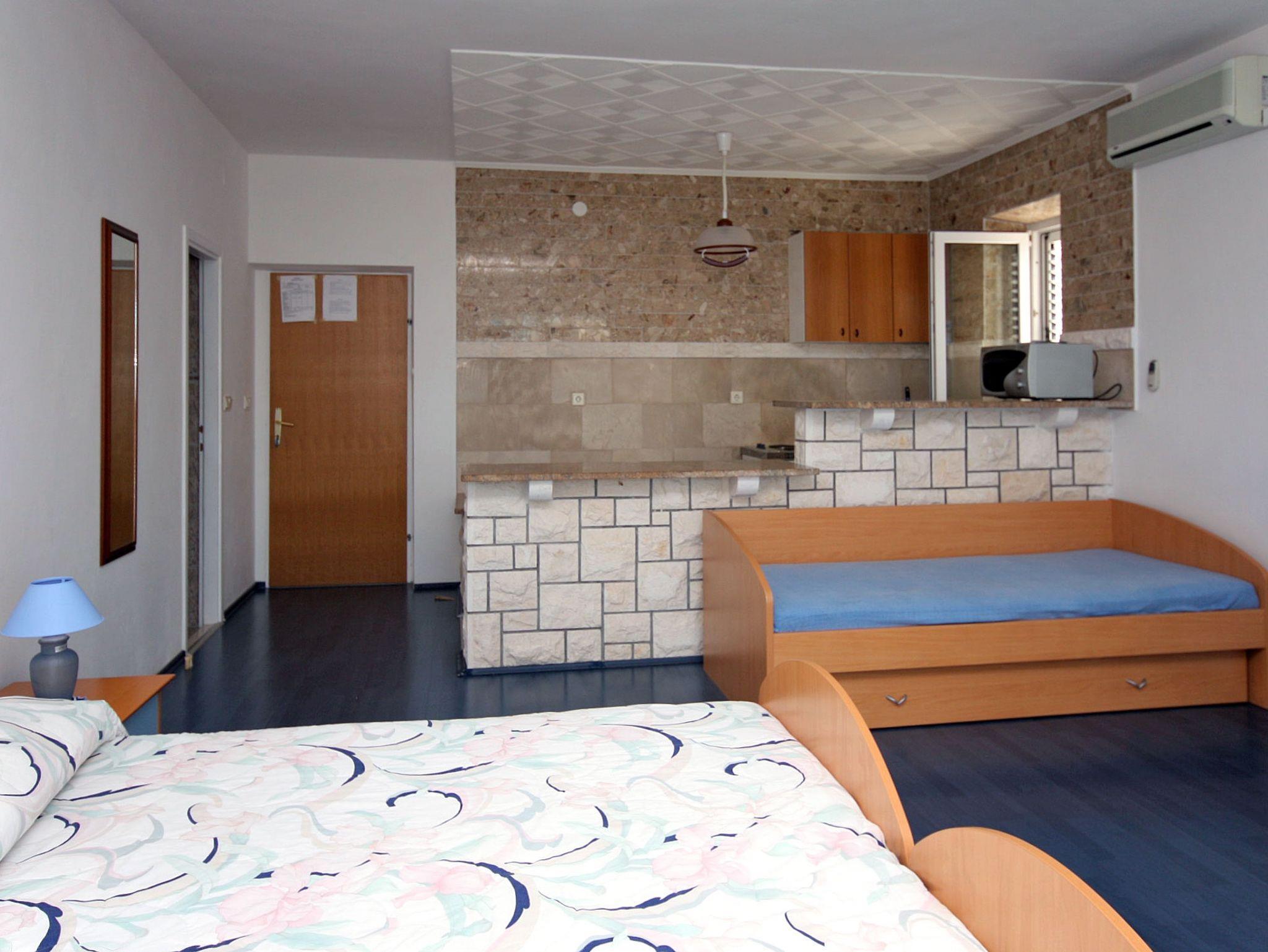 Studio bietet Platz für 4 Gäste. Die Betten sind in Schlafzimmern, die es 1 gibt, und in Esszimmer, innerhalb einer Gesamtfläche von 37m2, angeordnet. Die Gäste haben eine eigene Terrasse zur Verfügung, auf der sie in warmen Sommernächten genießen können. Das Studio-Apartment bietet Meerblick. Es ist erlaubt, Speisen auf dem Gemeinschafts-Grill vorzubereiten. Während ihres Aufenthalts können Gäste das gemeinsam zur Nutzung stehende Schwimmbad benutzen. IM PREIS INBEGRIFFEN: Kurtaxe, Endreinigung, Klimatisierung, Pool, Parkplatz, Internet, Kinderbett, Bügeleisen, Bügelbrett. VERBINDLICHE ZUSÄTZLICHE KOSTEN: Aufzahlung für Kurzaufenthalte (prozentualer Zuschlag pro Nächtigungsanzahl: 30% - 1, 20% - 2, 10% - 3). UNVERBINDLICHE ZUSÄTZLICHE KOSTEN: Wäschewaschen (7,00 € Waschen). Die Verfügbarkeit zusätzlicher Dienstleistungen in Ihrem reservierten Termin und die Preise derselben (falls nicht aufgeführt) müssen im Voraus überprüft werden. Zusätzliche Dienstleistungen die in der Zahlungsaufforderung nicht aufgeführt sind werden direkt beim Vermieter bezahlt, angenommen der Gast nutzt auch diese.