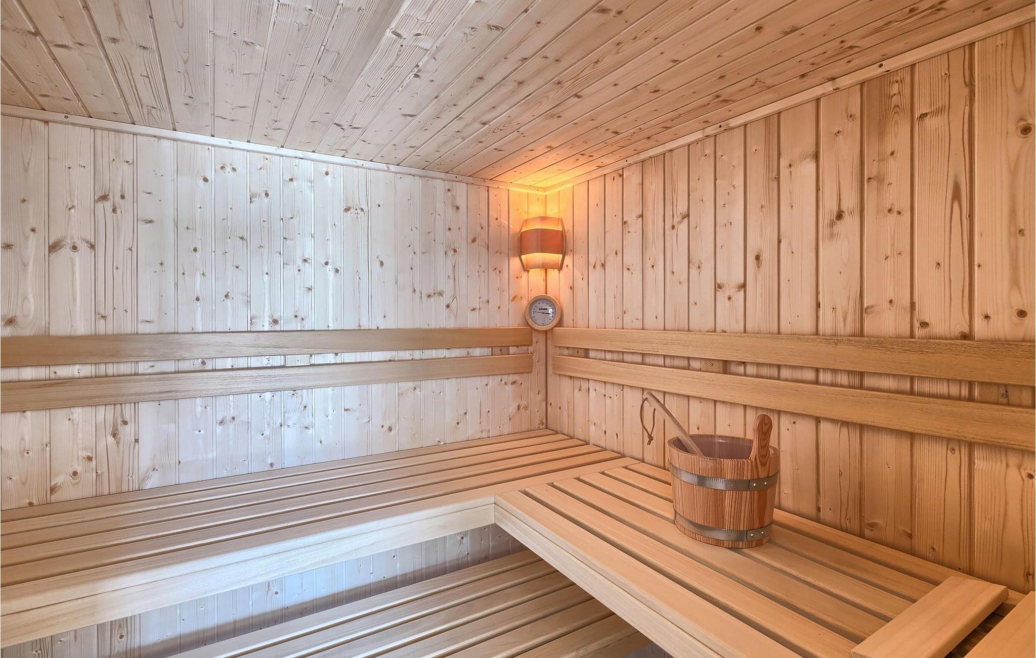 Im Erdgeschoss befindet sich ein helles Wohnzimmer sowie eine charmante Küche mit Essbereich. Ein paar Schritte weiter finden Sie einen Wellnessbereich mit Sauna und jacuzzi, in dem Sie entspannen und Ihren Urlaub in vollen Zügen genießen können. Auf der zweiten Etage befinden sich 3 Schlafzimmer mit jeweils einem eigenen Bad. Die Schlafzimmer sind mit Klimaanlage und TV ausgestattet.