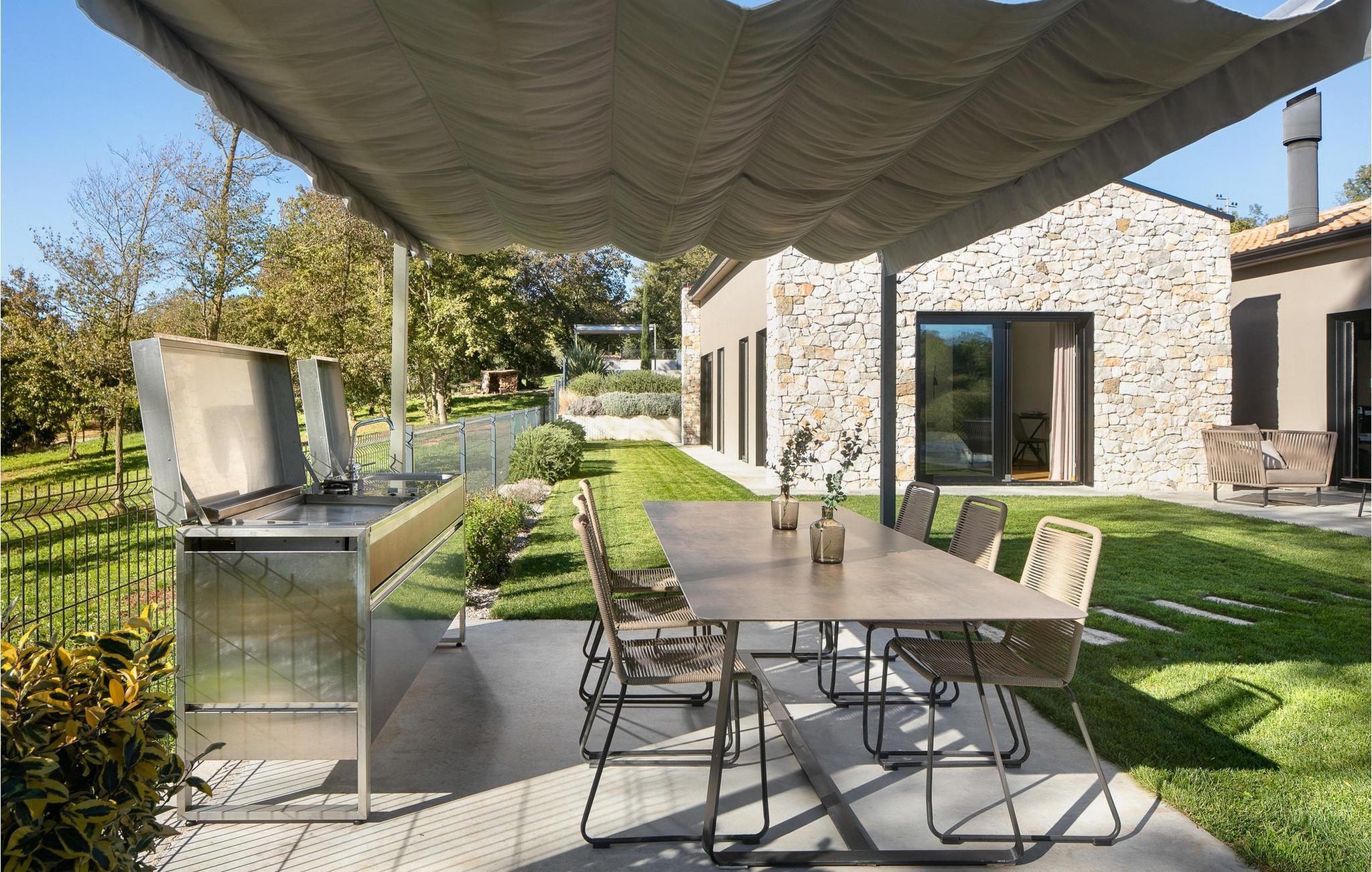 Die attraktive Villa Ulmus, eine modern gestaltete Villa mit für die Region Istrien erkennbaren Elementen, befindet sich in der Gemeinde Karojba, nur 7 km von der Stadt Motovun entfernt. Die Villa befindet sich auf einem Grundstück von 1.107 m2, reich an Grünflächen und umgeben von Natur, Weinbergen und kleinem Wald. Die Stadt Motovun ist eine der attraktivsten mittelalterlichen Städte Istriens. Die unberührten Landschaften der Stadt bieten zahlreiche Möglichkeiten für einen aktiven Urlaub und den Genuss der Früchte der Natur. Für einen aktiven Urlaub empfiehlt es sich, Fahrrad zu fahren, auf interessanten Stadtstraßen zu wandern, Paragliding zu spielen, Golf zu spielen, am Fluss Mirna zu angeln oder nach den berühmten istrischen Trüffeln zu suchen. Rund um Motovun gibt es Weinberge mit berühmten istrischen Weinsorten und in der Nähe gibt es zahlreiche hochwertige Tavernen und Restaurants, in denen Sie berühmte istrische Spezialitäten genießen können. In dieser Stadt finden viele interessante Veranstaltungen statt, von denen Ende Juli das berühmteste internationale Motovun-Filmfestival stattfindet, an dem renommierte Filmkünstler aus aller Welt teilnehmen. Dieses moderne, nach höchsten Baustandards erbaute, einstöckige Haus bietet Unterkunft für optimal 4 und maximal 6 Gäste. Die vollklimatisierte Villa verfügt über zwei Schlafzimmer und zwei moderne Badezimmer. Im Hauptschlafzimmer gibt es ein Doppelbett, im anderen Zimmer gibt es zwei Einzelbetten, die bei Bedarf zusammengestellt werden können. Für weitere zwei Personen gibt es Zustellbetten, die je nach Wunsch der Gäste in den Schlafzimmern oder im Wohnzimmer aufgestellt werden können. Der Innen- und Außenbereich der Villa ist direkt mit der Glaswand verbunden und von allen Räumen des Hauses aus besteht ein direkter Zugang zum Gartenbereich. Im wunderschönen grünen Garten befindet sich ein 36 m² großer Swimmingpool, der vor und nach der Saison beheizt ist. Außengrill, Gartenmöbel und Esstisch sowie vier Sonnenliegen bieten Ihnen die Möglichkeit, den Außenbereich der Villa zu genießen und zu entspannen. Im Außenbereich gibt es eine Kinderecke mit flachem Trampolin, Kinderspielhaus/Restaurant und Sandkasten. Für zusätzliche Inhalte und Unterhaltung sorgen außerdem drei Fernseher, Netflix und Fahrräder. Wenn Sie auf der Suche nach einem ruhigen Urlaub sind, in dem die Menschenzirkulation und der Verkehr in der gesamten Gegend minimal sind, bietet Ihnen die Ulmus-Villa genau das. Und wenn Sie Tagesausflüge in nahegelegene Städte unternehmen möchten; Motovun, Porec, Pula oder Rovinj sind einfach und schnell erreichbar. Haustiere sind in dieser Unterkunft nach Ermessen des Eigentümers oder gegen eine Gebühr gestattet.