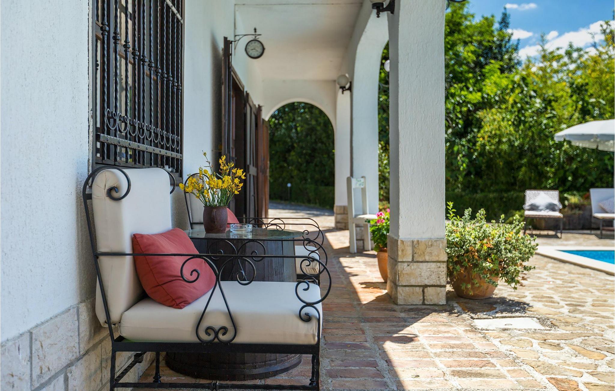 Die Umgebung des Hauses mit Olivenbäumen und einem kleinen Weingarten sorgen für vollständige Privatsphäre am Pool mit Steinterrasse. Ein überdachte Terrasse mit Grill ist perfekt zum Essen im Freien am Pool, wobei Sie die Sonnenuntergänge über dem Tal geniessen können.