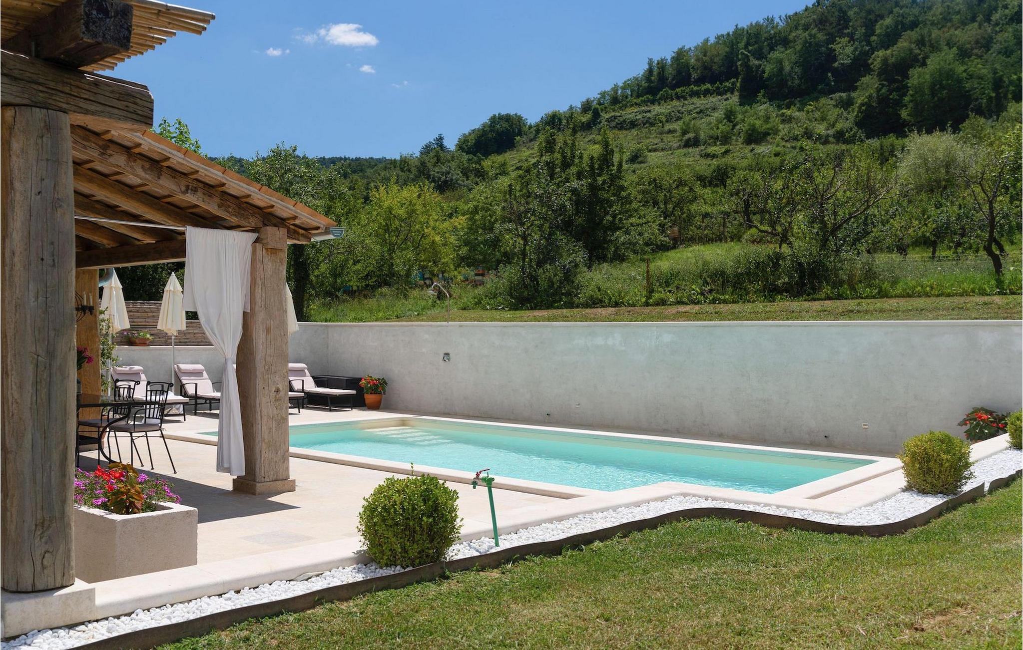 Klein, aber fein: Villa Flego bietet auf 70qm Wohnfläche Platz und Komfort für bis zu 4 Personen. Sie ist daher ideal für einen kleine Familien oder Pärchen, die Ruhe und Zurückgezogenheit in Zentralistrien suchen. Die Aufteilung der Räumlichkeiten ist praktisch und simpel. Im Erdgeschoss finden Sie einen offenen Wohn- und Essbereich mit Küche, wo Sie sich wie zu Hause fühlen können. Eine kleines WC vervollständigt das Erdgeschoss. Treppen führen Sie zu den 2 Schlafzimmern im ersten Stock, wo sich ebenfalls ein Badezimmer befindet. Alle Schlafzimmer sind klimatisiert und verfügen über einen Fernseher. Der Außenbereich der Villa ist nicht minder attraktiv. Vom Wohnbereich im Erdgeschoss gelangen Sie durch eine Glastür auf die einladende Terrasse mit bezaubernden Sitzbereich. Dort befindet sich auch eine Arbeitsfläche mit Spüle und ein Außenkamin, der an kühlen Nächten nicht nur eine behagliche Wärme erzeugt, sondern auch als Holzkohlengrill genutzt werden kann. Direkt daneben befinden sich der private Pool und die Sonnenliegen, die an schönen Sommertagen für Erholung sorgen. Können Sie sich vorstellen, sich dort zu entspannen und den Blick ins Grüne zu genießen? Ihr Traumurlaub ist nur einen Klick entfernt...Villa Flego befindet sich im idyllischen Ort Kaldir, das nur 8 km von dem mittlelalterlichen Städtchen Motovun entfernt ist. Motovun ist bekannt für seine Denkmäler und den spektakulären Blick auf die malerische Umgebung mit Hügeln, Weinbergen und das magische Mirna-Tal. Außerdem bietet sich Ihnen dort ein umfangreiches Angebot an Freizeitaktivitäten. Besuchen Sie lokale Feste oder das renommierte internationales Filmfestival. Zahlreiche Restaurants und Tavernen locken mit regionalen Spezialitäten wie z.B. hochwertiges Olivenöl, hausgemachten Käse und Schinken, Spitzenweine und natürlich Trüffel, für den die Region weltbekannt ist. Aktivurlauber dürfen sich über die zahlreichen Rad- und Wanderwege in der Region freuen. Natürlich müssen Sie ihren Urlaub nicht auf Zentralistrien begrenzen. Unternehmen Sie Tagesausflüge zu den Küstenstädten Pula, Rovinj und Porec oder zum Nationalpark Brijuni und kehren Sie nach einem ereignisreichen Tag in die zauberhafte Villa Flego zurück.