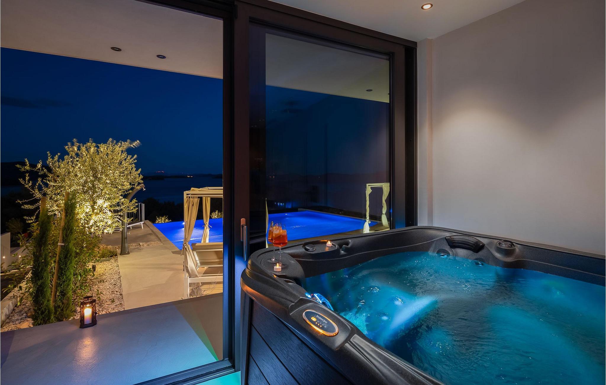 Genießen Sie entspannte Stunden auf der Terrasse und lassen Sie den Blick über das glitzernde Meer und die umliegenden Inseln schweifen. Ruhen Sie sich auf den eleganten Daybeds aus oder nehmen Sie ein herrliches Bad im Infinity-Pool. Verbringen Sie gesellige Momente am großen Esstisch im Freien und genießen Sie mediterrane Mahlzeiten unter dem weiten Himmel Dalmatiens.
