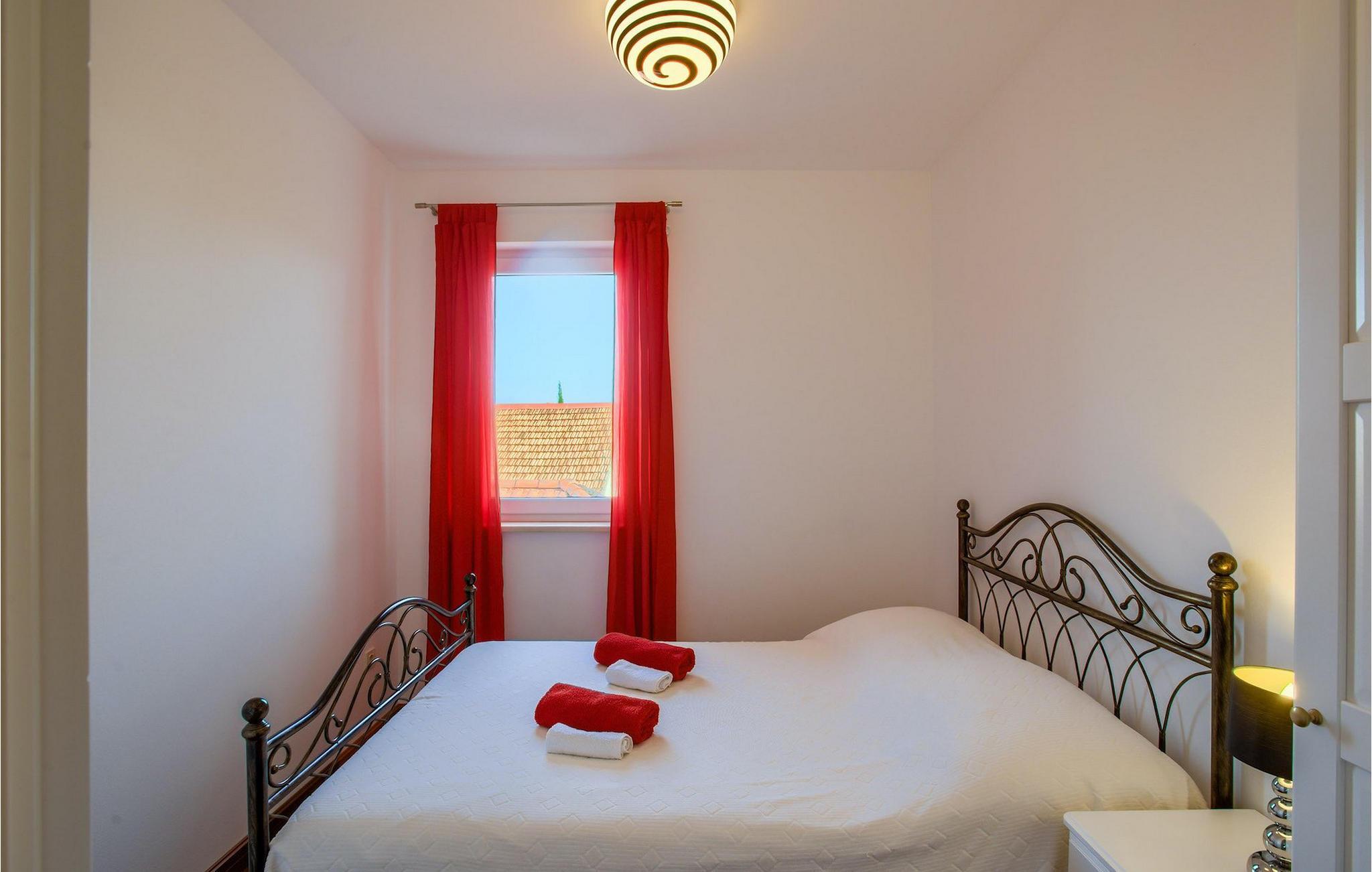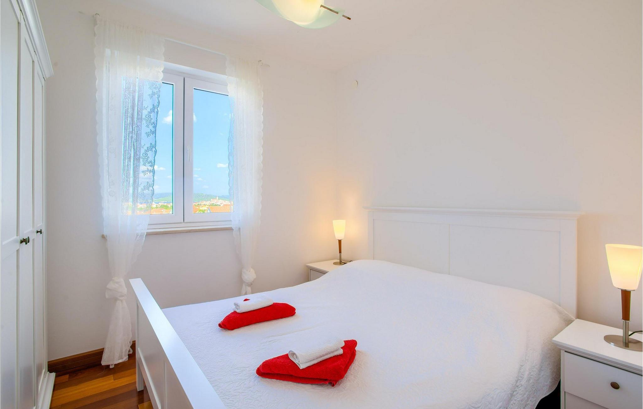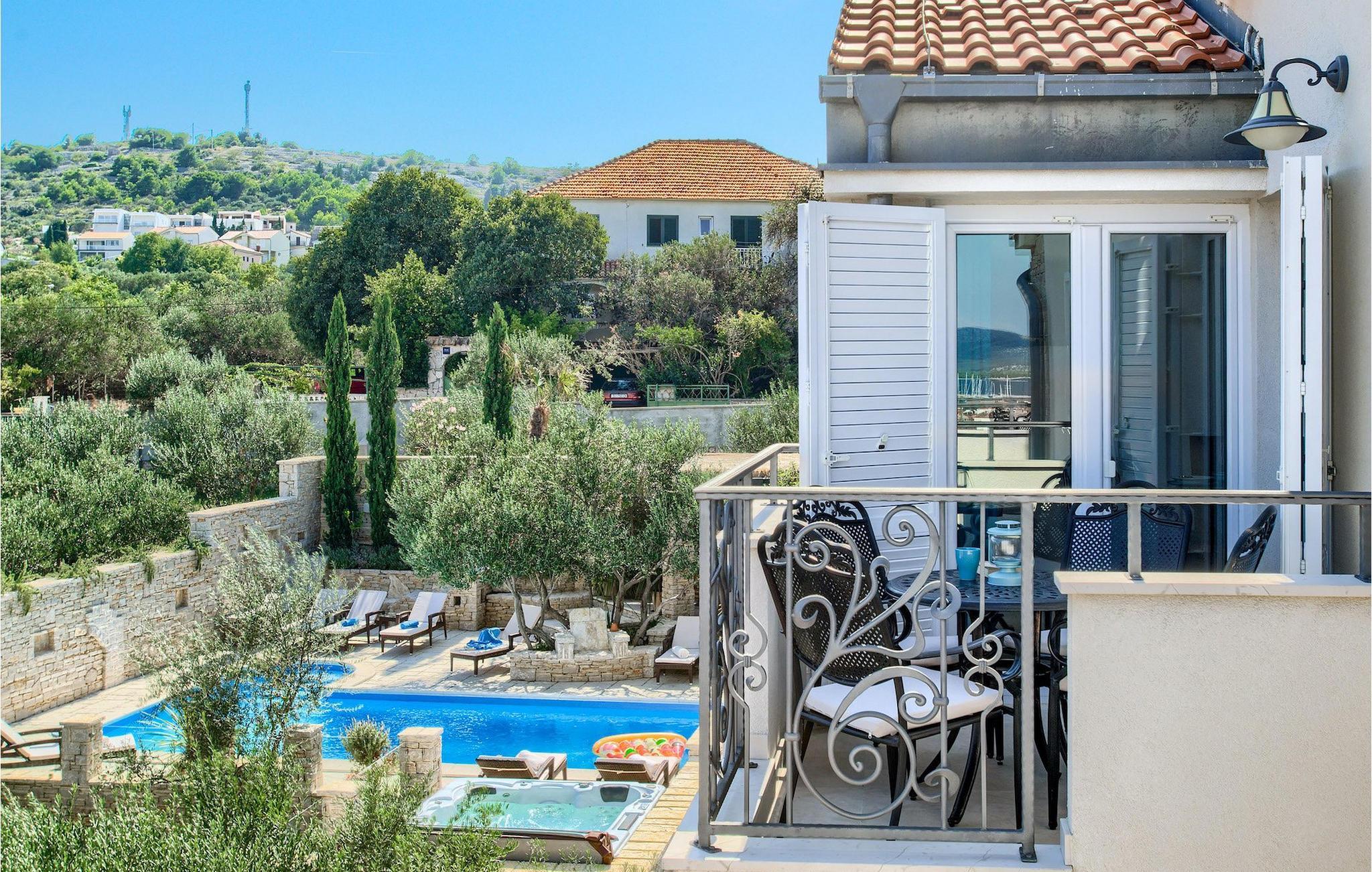 Atemberaubende Villa Kos Murter befindet sich auf der Insel Murter in Dalmatien und kann bis zu 18 Personen beherbergen. Die Villa besteht aus 6 Wohnungen, die zusammen vermietet werden. Die Wohnungen sind über 2 Etagen verteilt, wobei das Erdgeschoß nicht vermietet wird. Im ersten Stock sind 3 Wohnungen, jeweils mit 2 Schlafzimmern. Im zweiten Stock befinden sich 3 weitere Wohnungen, wovon eine Wohnung nur ein Schlafzimmer hat. Alle Wohnungen sind klimatisiert und mit einem Fernseher ausgestattet, haben eine eigene gut ausgestattete Küche und ein eigenes Badezimmer. Von jeder Wohnung können Sie die herrliche Aussicht auf die Umgebung und die kristallklare Adria genießen. Der Außenbereich ist auch beeindruckend. Zur Verfügung steht Ihnen ein mediterraner, schattiger Garten. Der einladende Pool ist ideal für warme, sonnige Tage. Falls Sie jedoch das Meer bevorzugen, befindet sich der nächste Strand nur 300m von der Villa. Ein zusätzlicher Hauch von Luxus sind der Jacuzzi und die traditionelle "konoba", wo die ganze Gruppe Zeit zusammen verbringen und im Freien essen kann.Die Insel Murter ist die größte und dem Land am nächste Insel auf dem Gebiet von Šibenik, von dem Land durch den engen Murter – Kanal getrennt, über den im Ort Tisno eine 12 m lange Zugbrücke gebaut wurde. Die Insel wird zum ersten Mal unter dem Namen Colentum erwähnt. Colentum war eine Stadt, die heute größtenteils unter der See liegt. Die Archäologen haben luxuriöse Gebäude, wahrscheinlich Villen mit herrlichem Meerblick, entdeckt. Man vermutet, dass Colentum am Anfang des 2. Jahrhunderts von Piraten niedergerissen wurde, und dass es im Erdbeben Schaden erlitten hat.