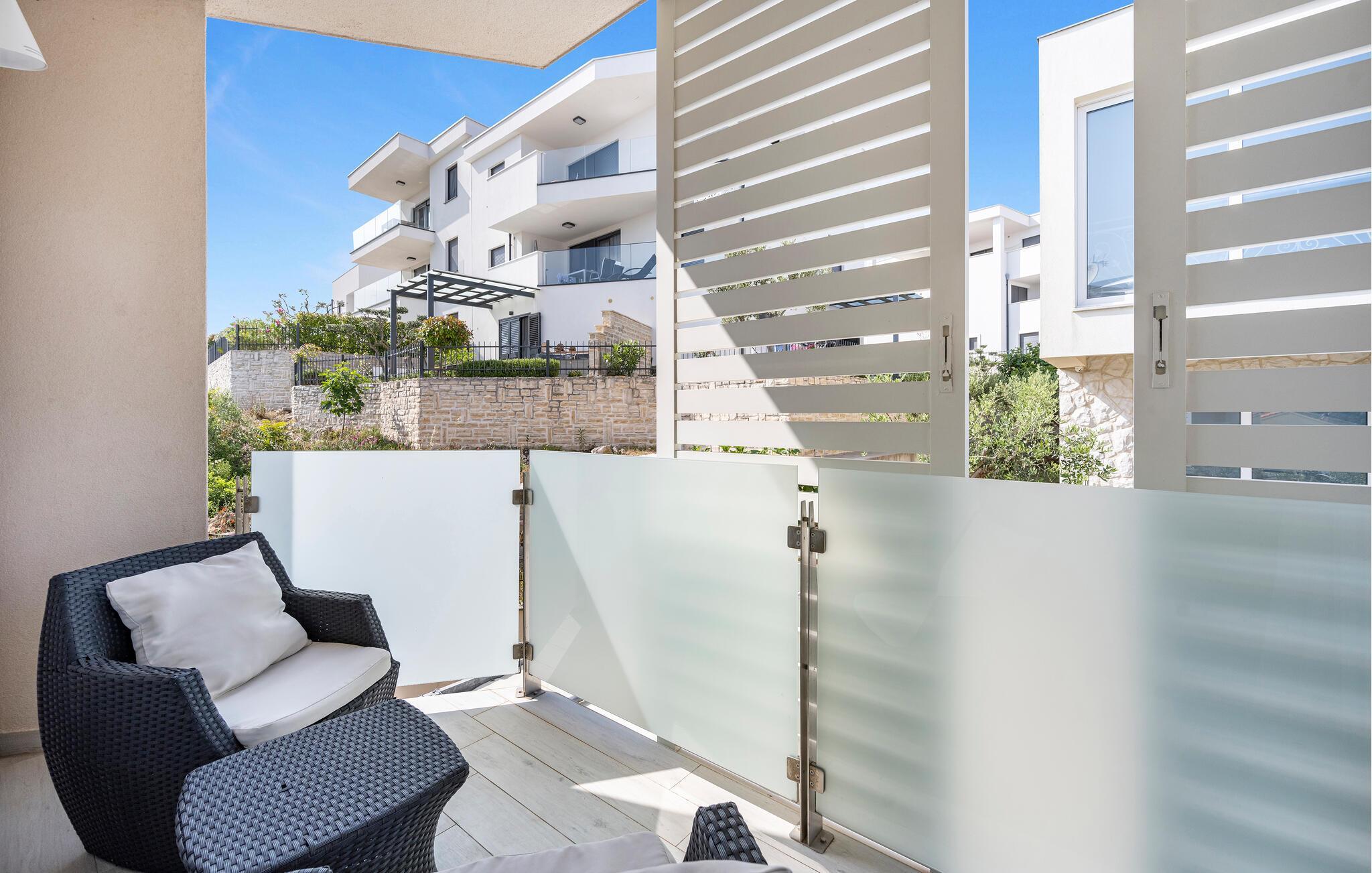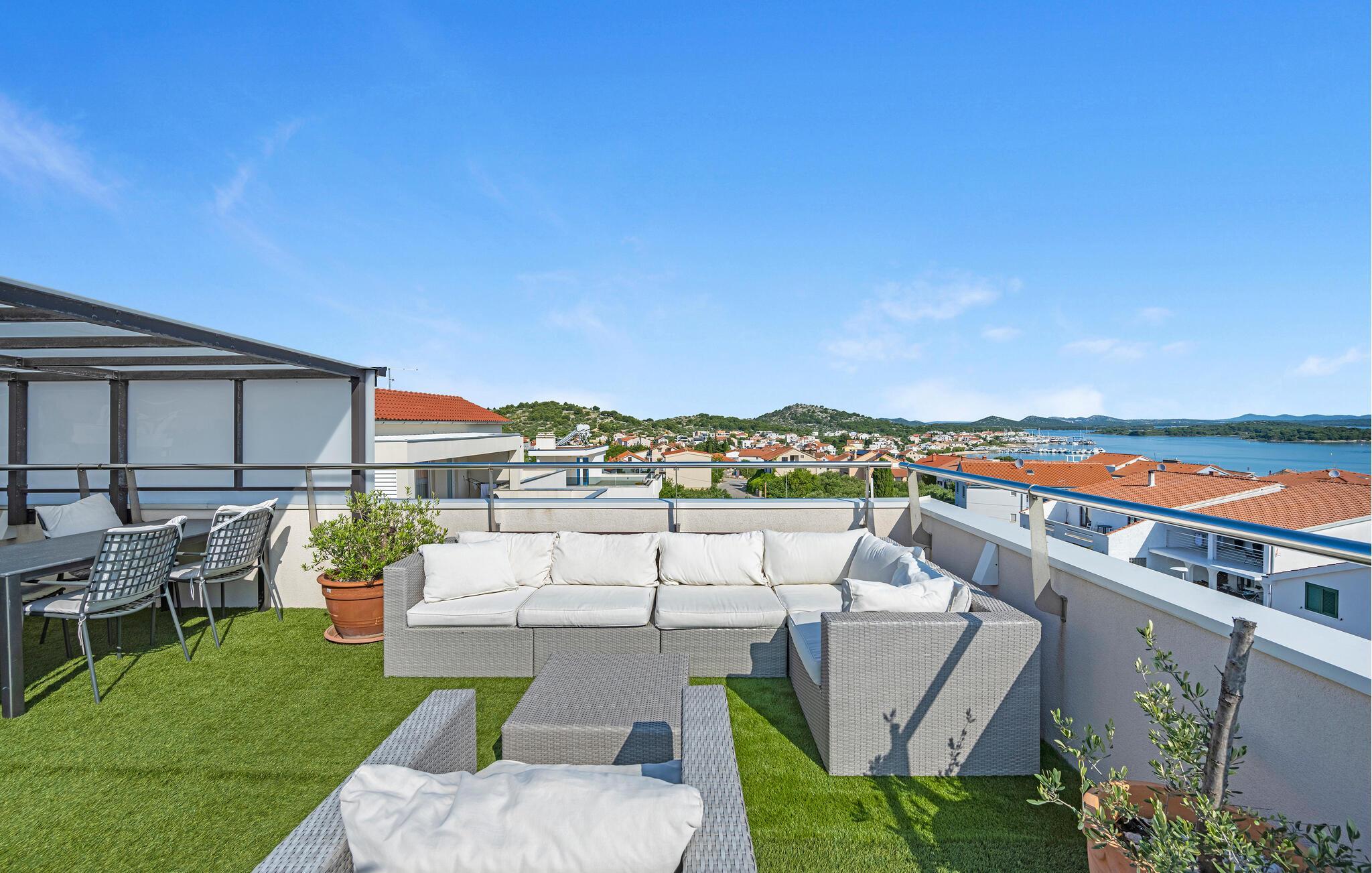 Der herrliche Gemeinschaftspool auf der Dachterrasse bietet Ihnen nicht nur angenehme Erfrischung an heißen Tagen, sondern auch einen fantastischen Blick auf die Adria. Genehmigen Sie sich hier einen Sundowner oder lassen Sie die mediterrane Atmosphäre auf dem Gemeinschaftsgrundstück bei einem Glas Wein auf sich wirken.
