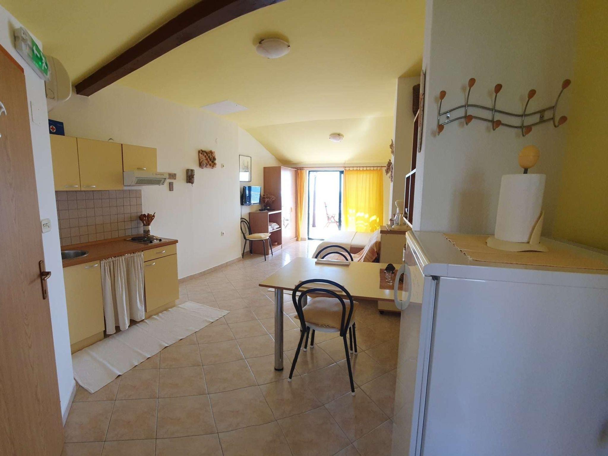 Studio bietet Platz für 3 Gäste. Die Betten sind in Schlafzimmern, die es 1 gibt, innerhalb einer Gesamtfläche von 35m2, angeordnet. Die Gäste haben eine eigene Terrasse zur Verfügung, auf der sie in warmen Sommernächten genießen können. Das Studio-Apartment bietet Meerblick. Es ist erlaubt, Speisen auf dem Gemeinschafts-Grill vorzubereiten. IM PREIS INBEGRIFFEN: Kurtaxe, Endreinigung, Klimatisierung, Parkplatz, Internet, Kinderbett, Bügeleisen, Bügelbrett, Föhn, Sonnenschirm. VERBINDLICHE ZUSÄTZLICHE KOSTEN: Aufzahlung für Kurzaufenthalte (prozentualer Zuschlag pro Nächtigungsanzahl: 30% - 1, 20% - 2, 10% - 3). Die Verfügbarkeit zusätzlicher Dienstleistungen in Ihrem reservierten Termin und die Preise derselben (falls nicht aufgeführt) müssen im Voraus überprüft werden. Zusätzliche Dienstleistungen die in der Zahlungsaufforderung nicht aufgeführt sind werden direkt beim Vermieter bezahlt, angenommen der Gast nutzt auch diese.