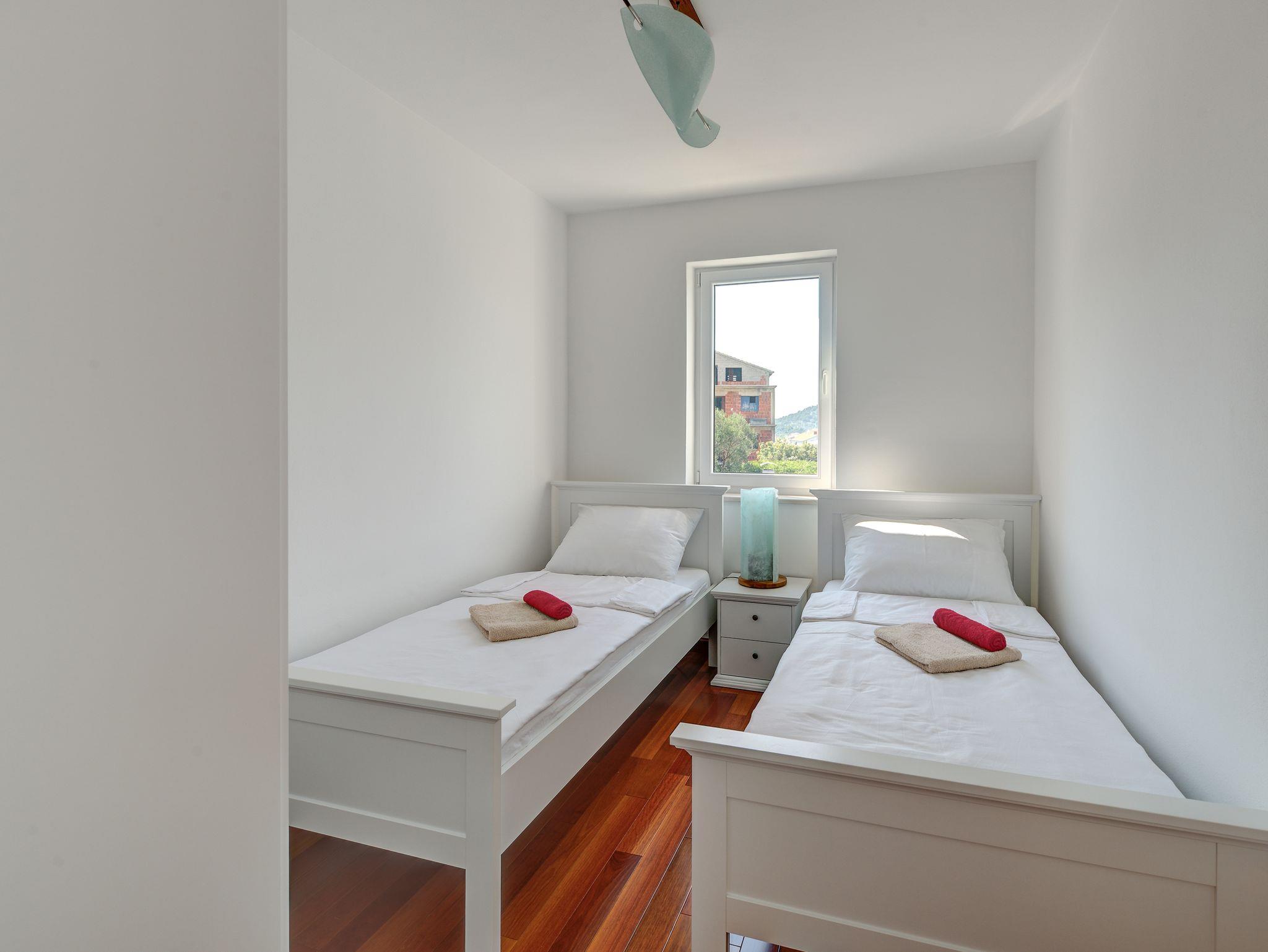 Ferienwohnung bietet Platz für 4 Gäste. Die Betten sind in Schlafzimmern, die es 2 gibt, innerhalb einer Gesamtfläche von 49m2, angeordnet. Die Gäste haben eine eigene Terrasse zur Verfügung, auf der sie in warmen Sommernächten genießen können. Das Apartment bietet Meerblick. Es ist erlaubt, Speisen auf dem Gemeinschafts-Grill vorzubereiten. Während ihres Aufenthalts können Gäste das gemeinsam zur Nutzung stehende Schwimmbad benutzen. In der Unterkunftseinheit besteht die Möglichkeit des Mitbringens von Haustieren gegen Aufpreis. In der gebuchten Unterkunftseinheit zahlt man am Ort ein Depositum ( der Preis ist an der Internetseite angeführt ). IM PREIS INBEGRIFFEN: Endreinigung, Klimatisierung, Pool, Parkplatz, Internet, Kinderbett, Föhn. VERBINDLICHE ZUSÄTZLICHE KOSTEN: Kurtaxe (Erwachsene 0,93 € - 2,00 € Nacht/Person, Kinderermäßigung 12 - 17 Jahre), Kaution (200,00 € Einmalzahlung), Aufzahlung für Kurzaufenthalte (prozentualer Zuschlag pro Nächtigungsanzahl: 30% - 1, 20% - 2, 10% - 3). UNVERBINDLICHE ZUSÄTZLICHE KOSTEN: Haustiere (10,00 € pro Nacht). Die Verfügbarkeit zusätzlicher Dienstleistungen in Ihrem reservierten Termin und die Preise derselben (falls nicht aufgeführt) müssen im Voraus überprüft werden. Zusätzliche Dienstleistungen die in der Zahlungsaufforderung nicht aufgeführt sind werden direkt beim Vermieter bezahlt, angenommen der Gast nutzt auch diese. Ermäßigung auf den Grundpreis: Gratistag 14=13 (bei einem Aufenthalt von 14 Tagen oder mehr erhalten Sie einen Gratistag für den Aufenthalt bis 31.12.26).