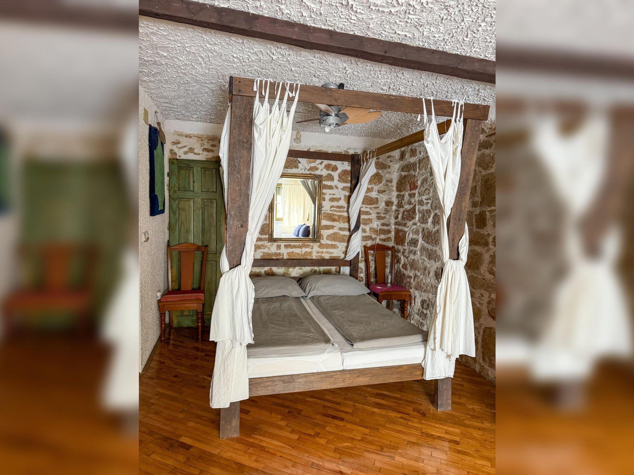 The interior of the studio has been carefully chosen to create a warm and welcoming ambience. In addition to the impressive four-poster bed, equipped with two ergonomic mattresses, you will find a functional, fully equipped kitchenette with basic cooking utensils, a historic wardrobe that tells its own story and a couch that can be converted into another comfortable sleeping area. Modern comfort is guaranteed by the air conditioning, WLAN and satellite TV, while the bathroom with shower, towels and WC leaves nothing to be desired.