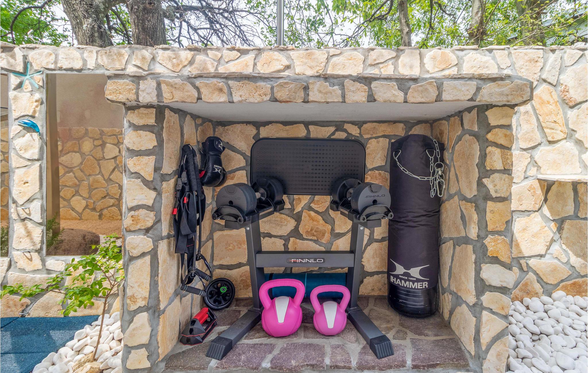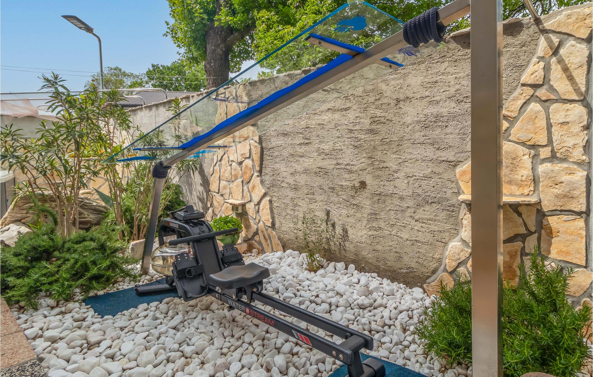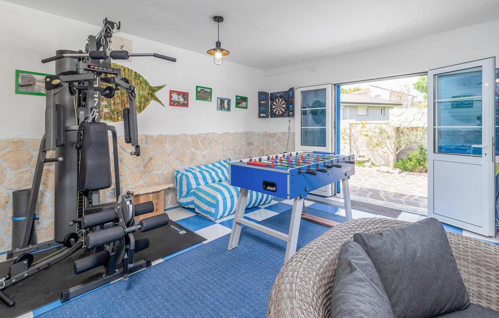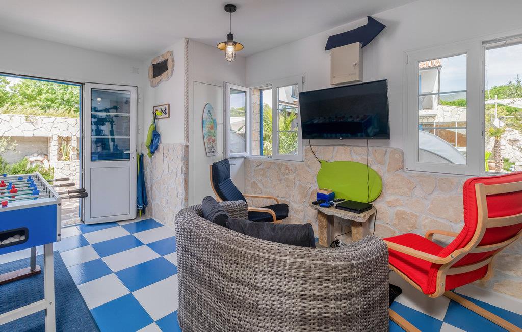Freuen Sie sich auf dieses einladende Feriendomizil für Ihre große Familie. Das Haus schmückt sich maritimen Flair, dass sich in der Farbgestaltung und liebevollen Dekoration widerspiegelt. Genießen Sie die offene Wohnraumgestaltung, wegen der Sie problemlos an den Gesprächen im ganzen Raum teilhaben können, während Sie kochen oder am Esstisch spielen. Auf zwei Etagen finden Sie in den Schlafzimmern mit privaten Badezimmern Ihre Ruhe und können sich am Abend im Spielzimmer beschäftigen. Auch Ihr Sportprogramm kommt im Urlaub nicht zu kurz. Sowohl im Haus als auch im Garten finden Sie viele Sportgeräte, die Sie zum Trainieren animieren. Duschen Sie sich danach ab und erfrischen sich im Pool, von dem Sie dem Grillmeister bei Zubereiten des Abendessens zuschauen können. Die Kleinsten in der Familie werden viel Zeit auf dem privaten Spielplatz verbringen, während die Älteren zu späterer Stunde ein Bad im Whirlpool genießen können.