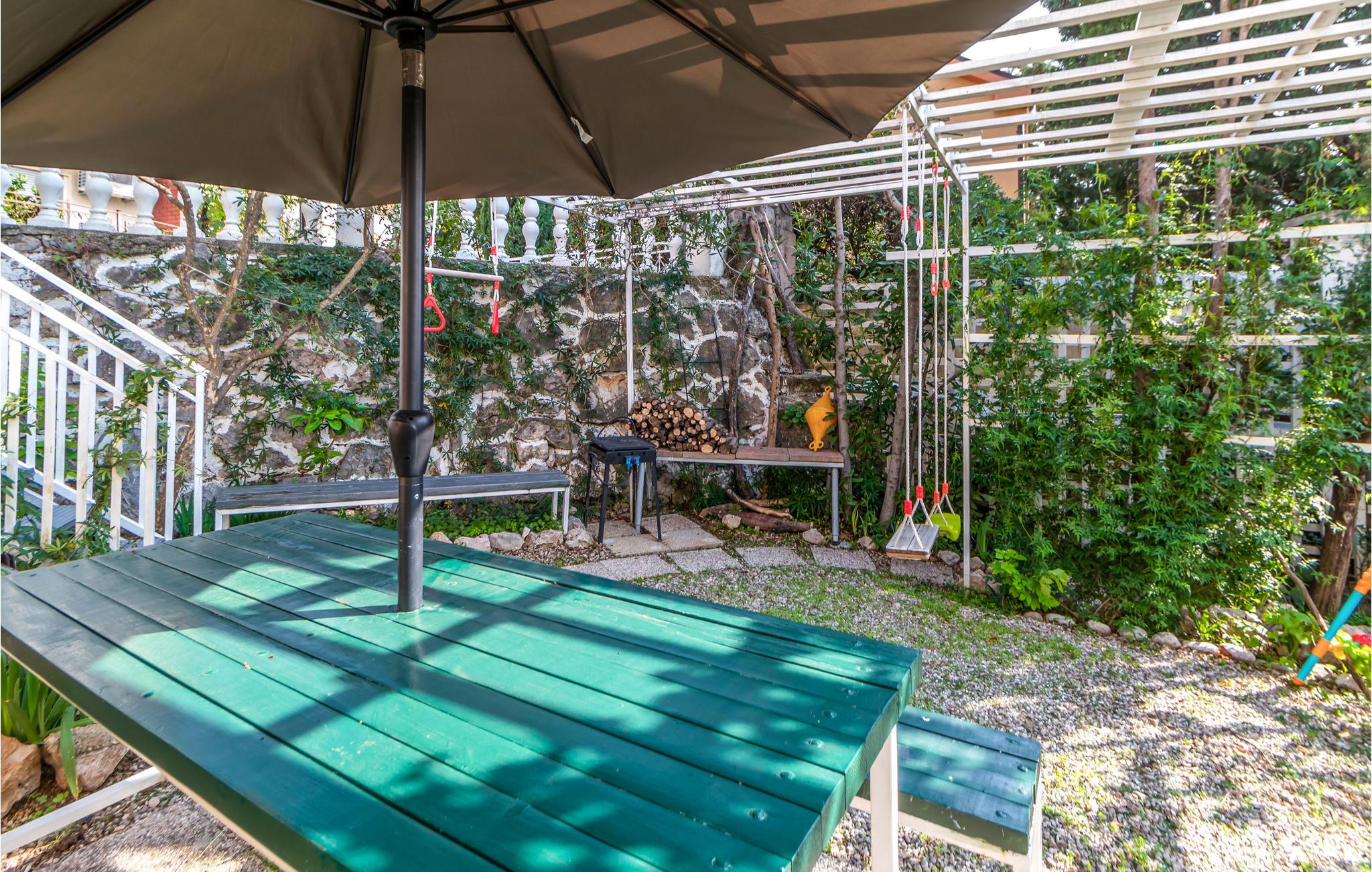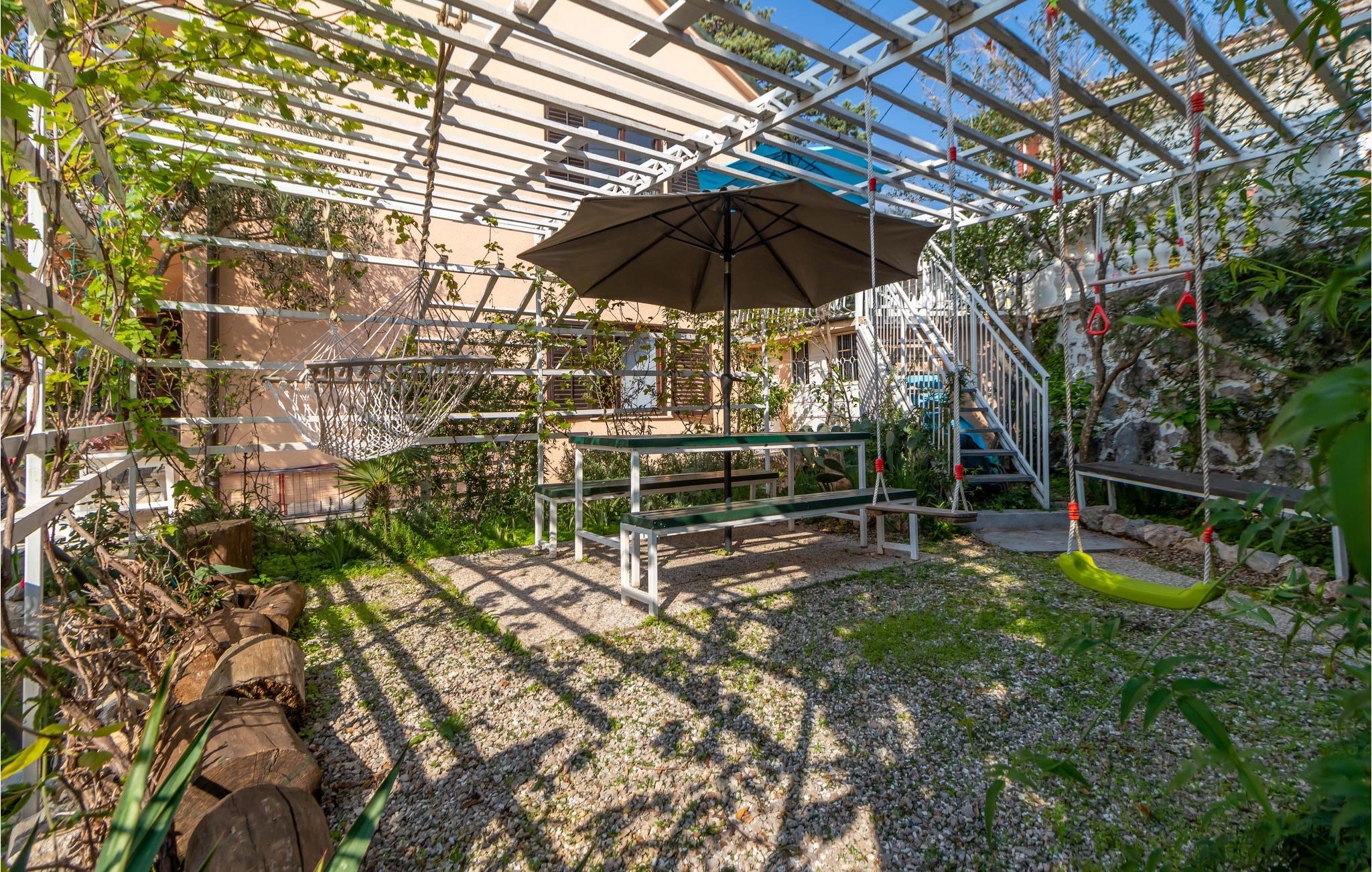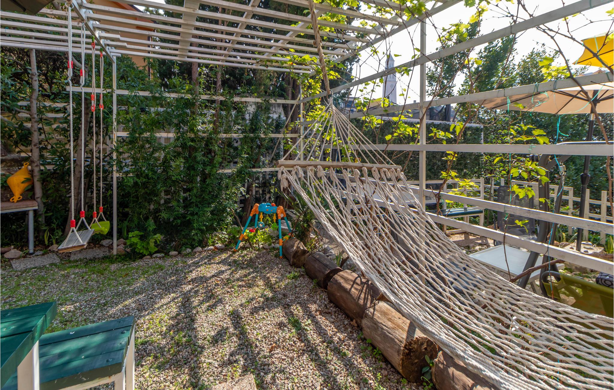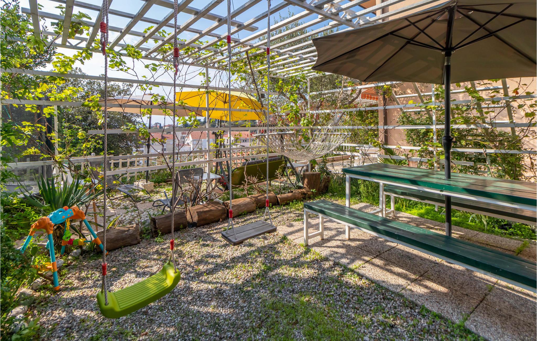 Ein weiterer Bereich, der Gemeinschaftsgarten, lädt Ihre Kinder zum Spielen, Springen und Schaukeln ein. Hier können Sie mit den anderen Gästen des Hauses in Kontakt kommen und Ihre Kinder können Urlaubsfreundschaften schließen.