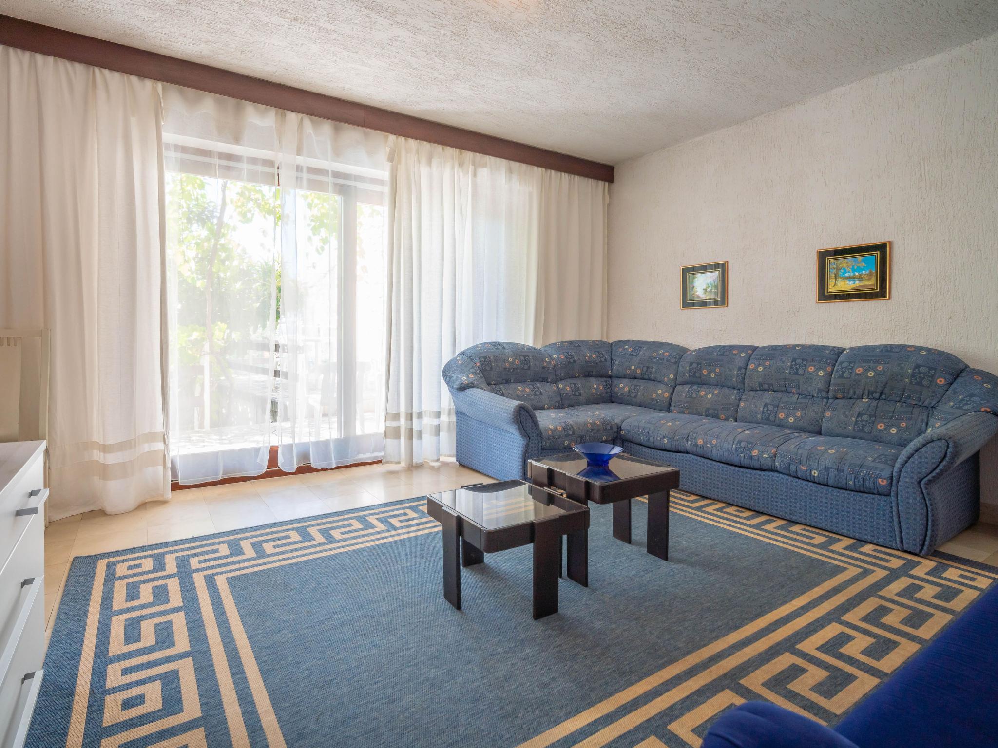 4-room semi-detached house 120 m2 on 2 levels, south facing position. Living room with 1 sofabed and satellite TV (flat screen), air conditioning. Exit to the terrace. Dining room. Exit to the terrace. 1 room with 1 french bed (160 cm, length 200 cm). Open kitchen (4 hot plates, oven). Shower/WC, double hand-basin. No heating option. Upper floor: 1 room with 1 french bed (160 cm, length 200 cm), air conditioning. Exit to the balcony. 1 room with 1 bed (90 cm, length 190 cm), 1 double bed (2 x 90 cm, length 190 cm), satellite TV (flat screen), air conditioning. Exit to the balcony. Dining room. Open kitchen (4 hot plates, oven). Bath/WC. Balcony 10 m2, terrace 25 m2 partly roofed. Terrace furniture, balcony furniture. View of the sea. Facilities: washing machine, baby cot. Internet (WiFi, free). Maximum 3 pets/ dogs allowed. Internet WiFi available only in the period 01.06.-30.09.