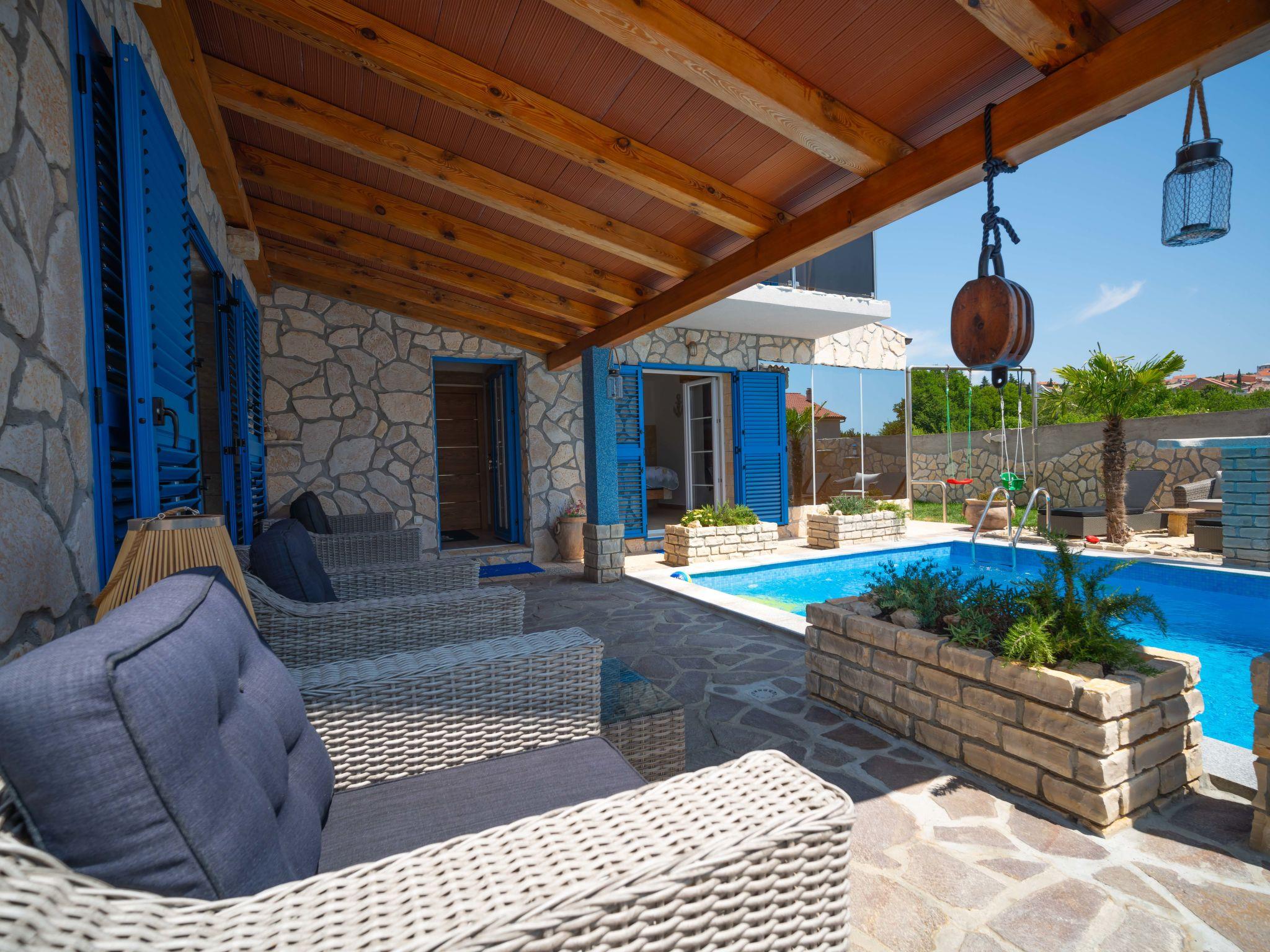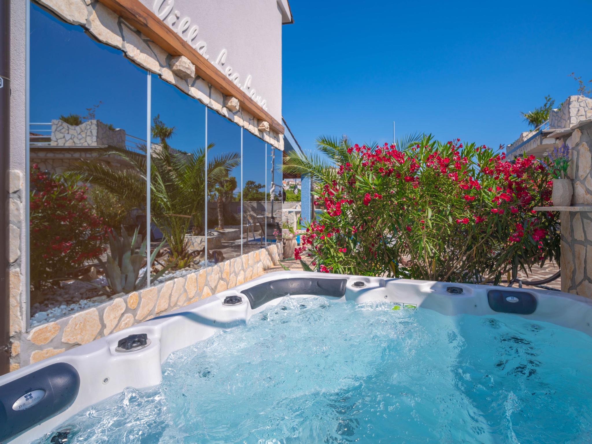 Villa "Lea Lana", 2 storeys. 500 m from the centre of Novi Vinodolski, in a quiet, sunny position, 700 m from the sea, 900 m from the beach. Private: property 1'000 m2 (fenced) with wildlife garden, swimming pool angular (7 x 4 m, depth 150 cm, seasonal availability: 01.May. - 15.Oct.) with internal staircase. WC in the pool area, outdoor shower, hot tub, pool house, table tennis, terrace (50 m2), garden furniture, barbecue, children's playground (slide, swing). In the house: internet access, table football, burglar alarm system, washing machine. Parking (for 3 cars) at the house on the premises. Shop, supermarket, restaurant 500 m, bus stop 1.4 km, pebble beach, public bathing area, concrete beach 900 m. Please note: suitable for families. Groups of teenagers on request only. By groups of young people double deposit is requested on arrival. Organizing a party is not allowed. Pool house arranged as a playroom (table football, darts, play station). Available: multifunctional exercise machine. Welcome drink and snack upon arrival.