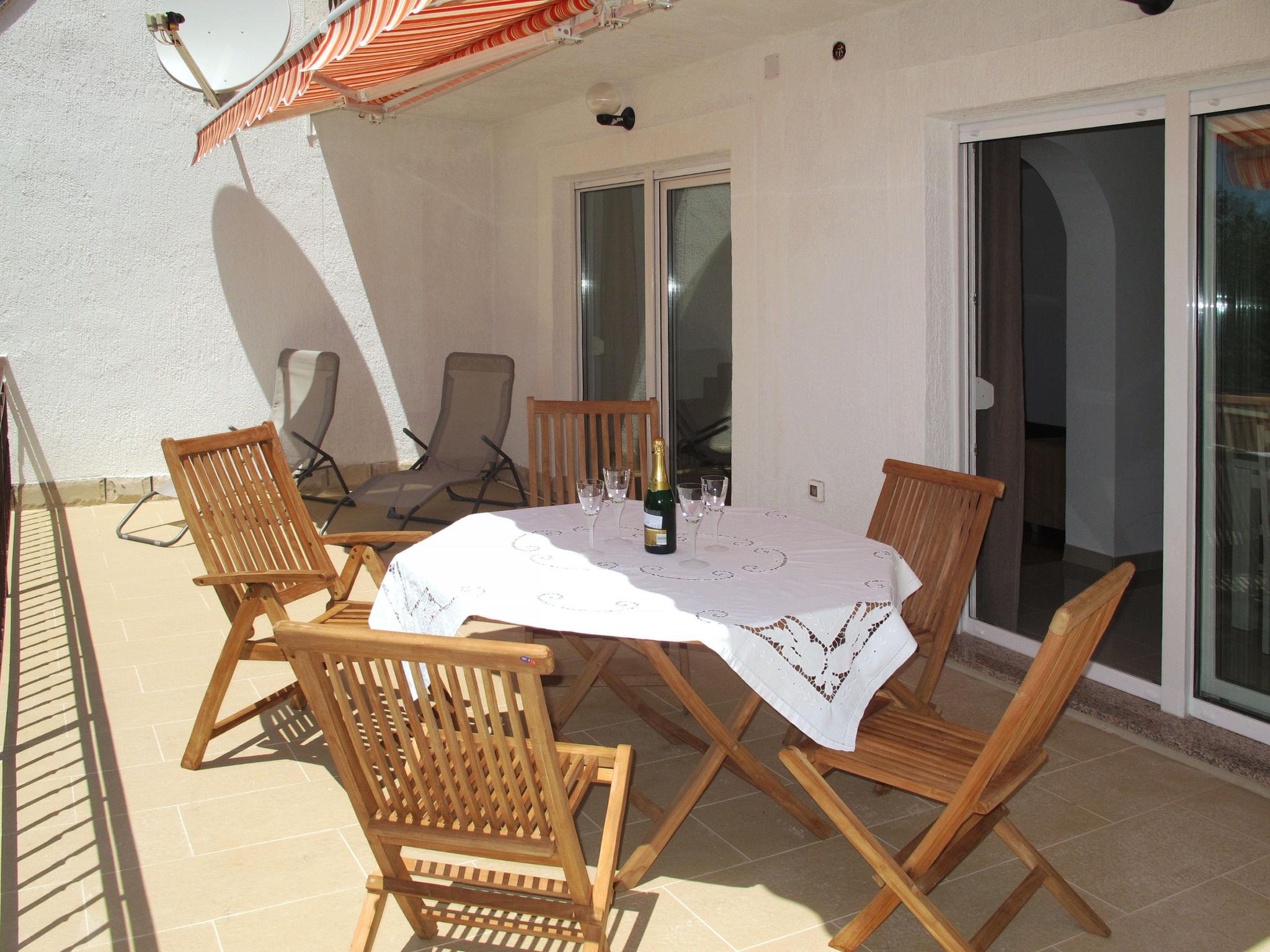 "Luka", 3-room apartment 75 m2, on the ground floor. Living/dining room with 1 sofabed (160 cm, length 200 cm), satellite TV and air conditioning. Exit to the terrace. 2 rooms, each room with 1 double bed (2 x 80 cm, length 200 cm). Open kitchen (oven, dishwasher, 4 gas rings, toaster, kettle, freezer, electric coffee machine). Shower/WC. Heating (extra), air-conditioning (extra). Terrace 22 m2. Terrace furniture, barbecue (portable), deck chairs. Facilities: washing machine, baby cot (extra). Internet (WiFi, free). Please note: non-smoking house. Maximum 1 pet/ dog allowed.