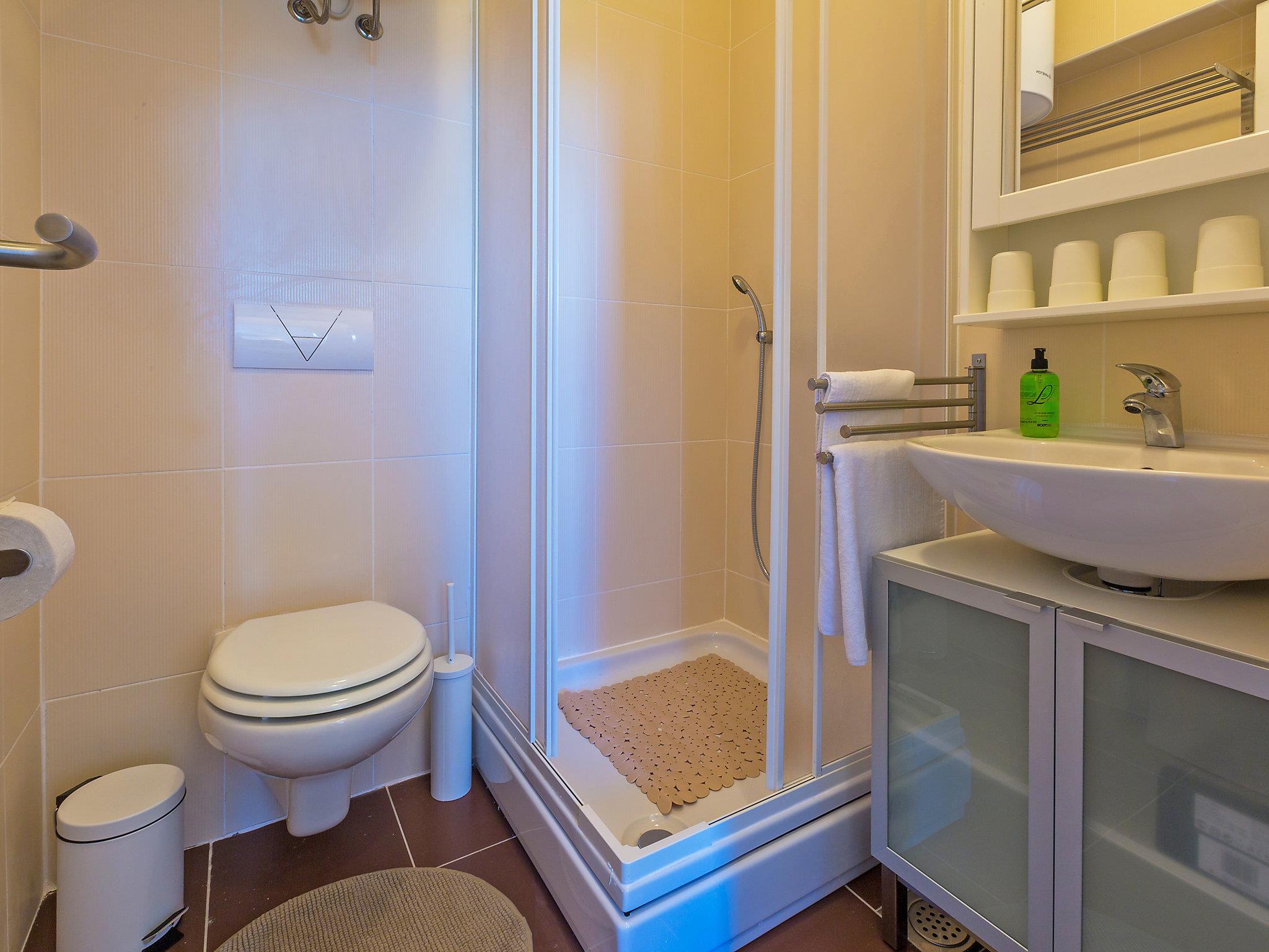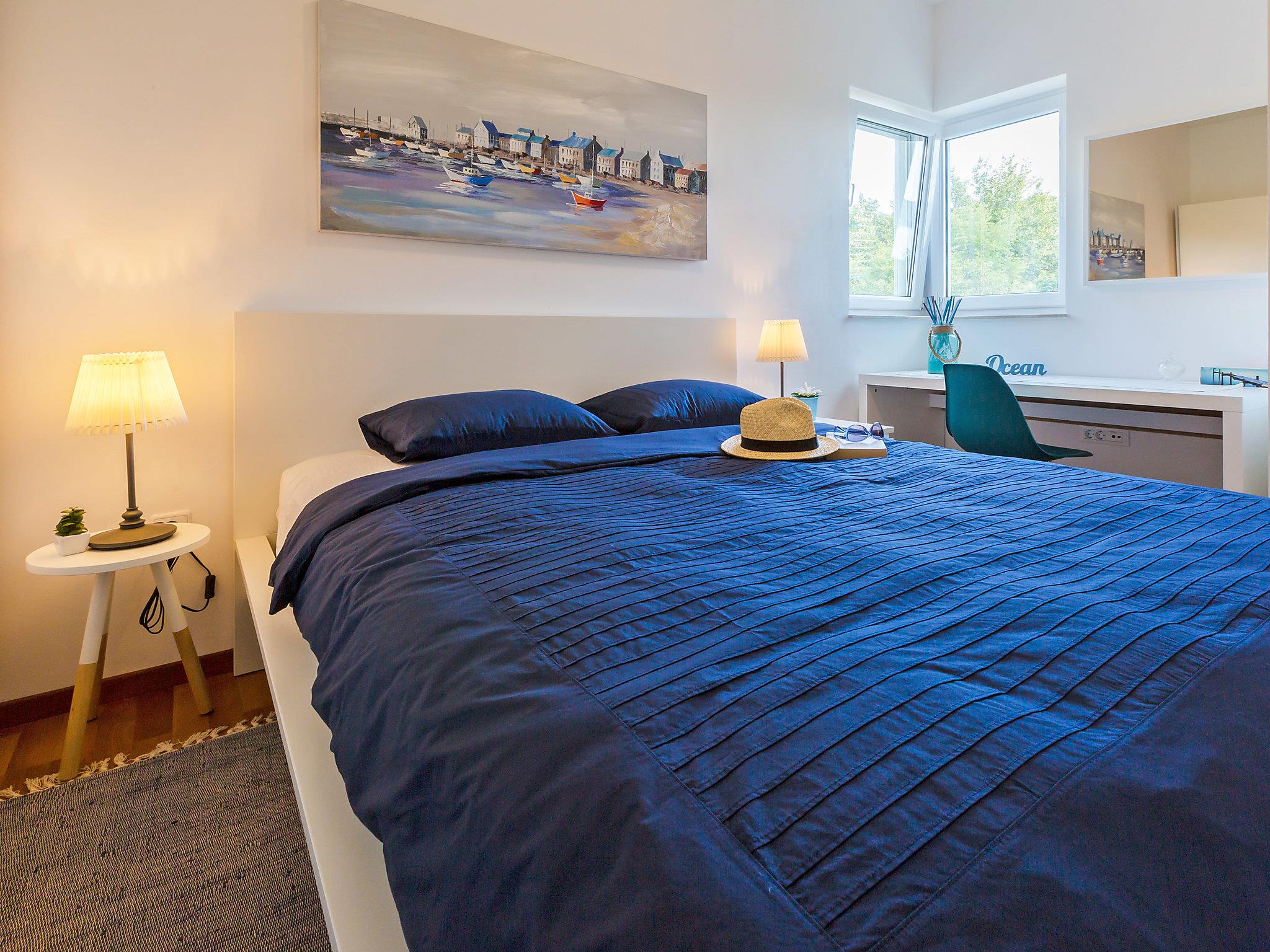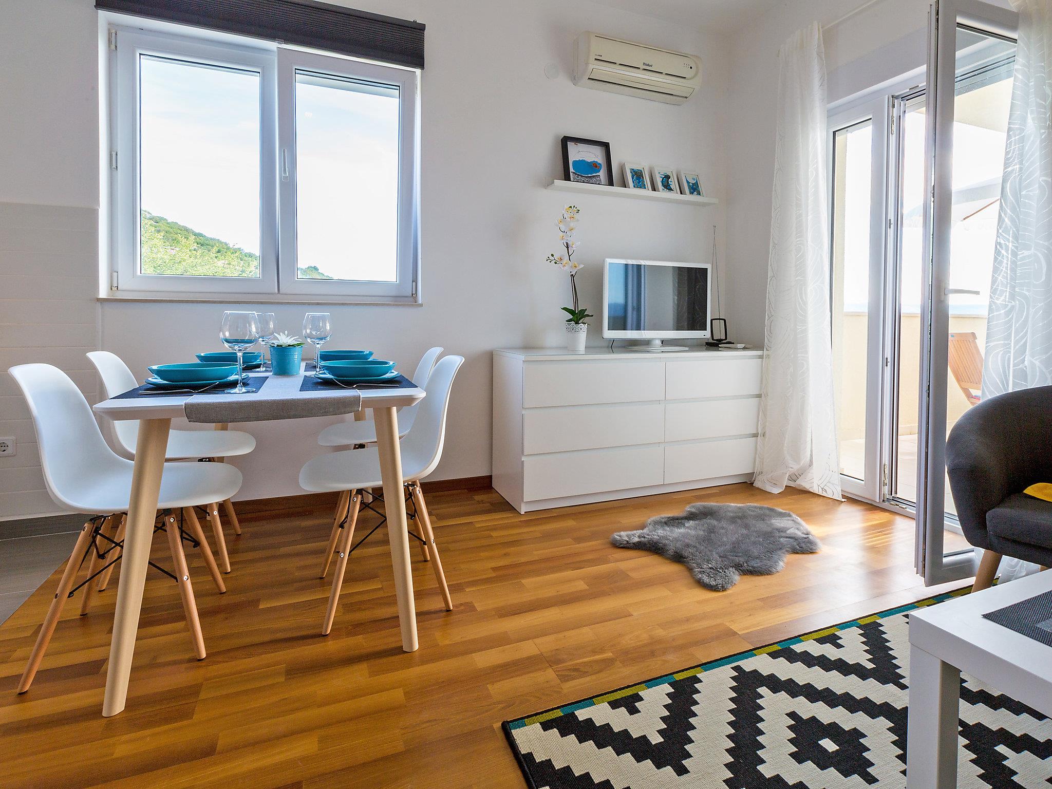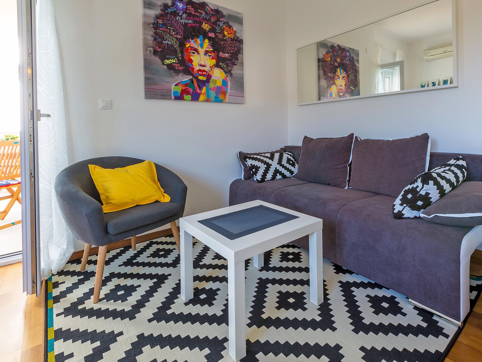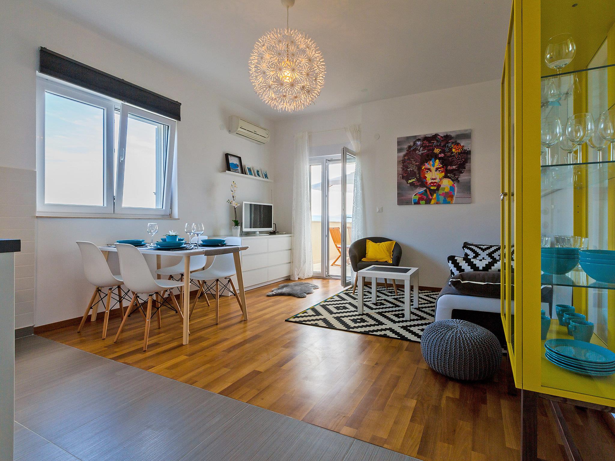 "Cvit 1", 3-room apartment 54 m2 on 1st floor, south facing position. Beautiful and modern furnishings: living/dining room 24 m2 with 1 double sofabed and satellite TV (flat screen), air conditioning. Exit to the balcony. 2 rooms, each room with 1 french bed (160 cm, length 200 cm). Open kitchen (oven, dishwasher, 4 ceramic glass hob hotplates, freezer, electric coffee machine). Shower/WC, sep. WC. No heating option. Balcony 8 m2. Balcony furniture. Beautiful view of the sea. Facilities: children's high chair, baby cot. Internet (WiFi, free). Parking (1 car). 2900022