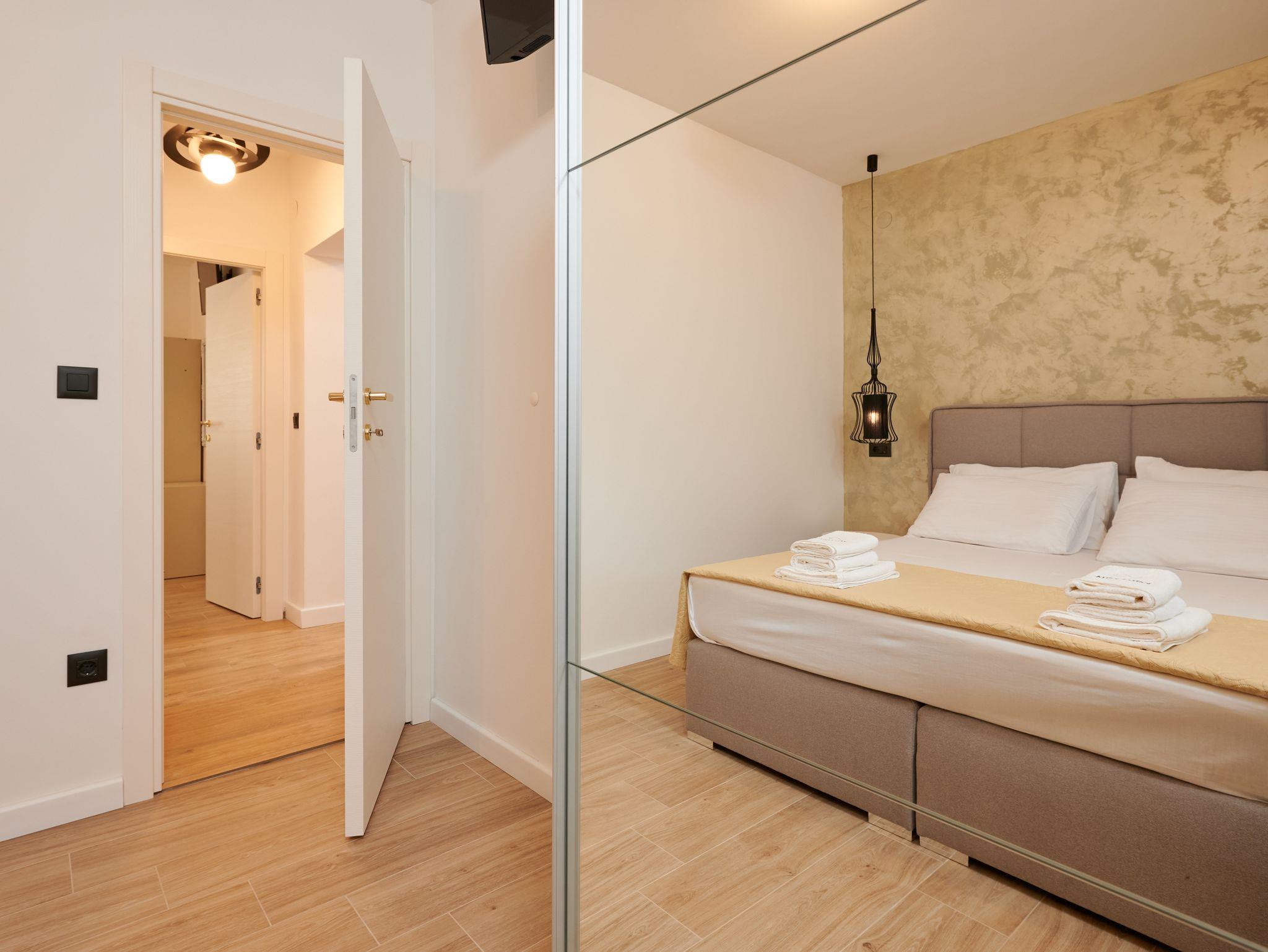 Ferienwohnung bietet Platz für 5 Gäste. Die Betten sind in Schlafzimmern, die es 2 gibt, und in Wohnzimmer, innerhalb einer Gesamtfläche von 73m2, angeordnet. Die Gäste haben eine eigene Terrasse zur Verfügung, auf der sie in warmen Sommernächten genießen können. Das Apartment bietet Meerblick. Es ist erlaubt, Speisen auf dem Gemeinschafts-Grill vorzubereiten. IM PREIS INBEGRIFFEN: Kurtaxe, Endreinigung, Klimatisierung, Parkplatz, Internet, Kinderbett, Bügeleisen, Bügelbrett, Föhn, Liegestühle. VERBINDLICHE ZUSÄTZLICHE KOSTEN: Aufzahlung für Kurzaufenthalte (prozentualer Zuschlag pro Nächtigungsanzahl: 30% - 1, 20% - 2, 10% - 3). Die Verfügbarkeit zusätzlicher Dienstleistungen in Ihrem reservierten Termin und die Preise derselben (falls nicht aufgeführt) müssen im Voraus überprüft werden. Zusätzliche Dienstleistungen die in der Zahlungsaufforderung nicht aufgeführt sind werden direkt beim Vermieter bezahlt, angenommen der Gast nutzt auch diese.