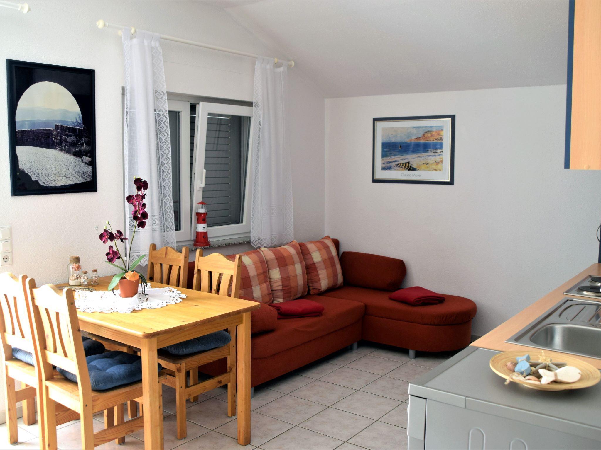 The 50m² holiday apartment is on the first floor. Two separate bedrooms provide all guests with plenty of space to retreat. The first is furnished with a kingsize bed (160 x 200cm), the second with two single beds. The hallway leads to the light living and dining room with a open-plan kitchen for self-catering, equipped with all the essential kitchen utensils, along with a coffee machine, dishwasher, microwave, oven, fridge, freezer, ceramic hob and toaster. A dining table, a sofa and satellite/cable TV, as well as a radio invite you to relax and enjoy sociable togetherness. The sofa can also be used as a bed (140 x 200cm) for one person. All the windows are fitted with fly screens. A modern shower room with a WC and hairdryer rounds off the accommodation.