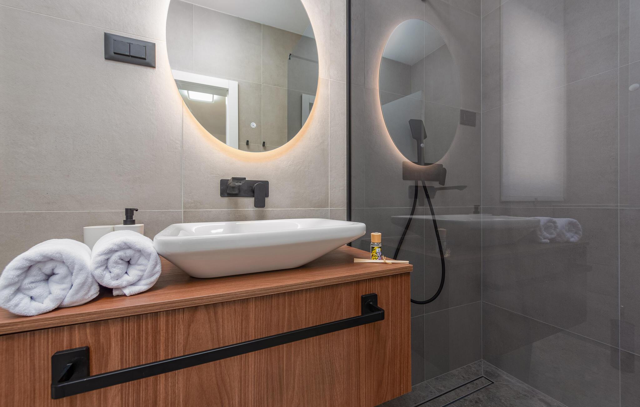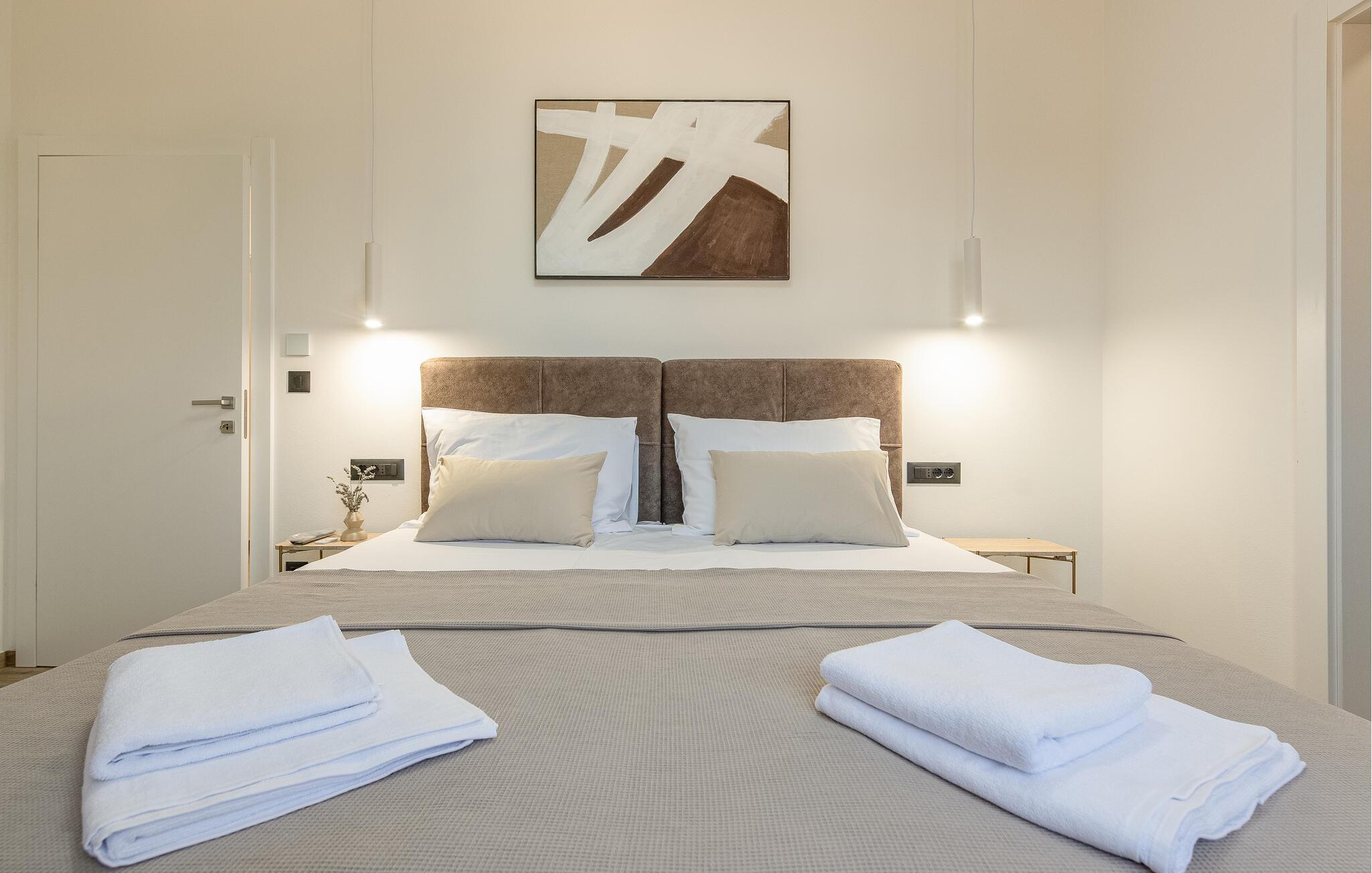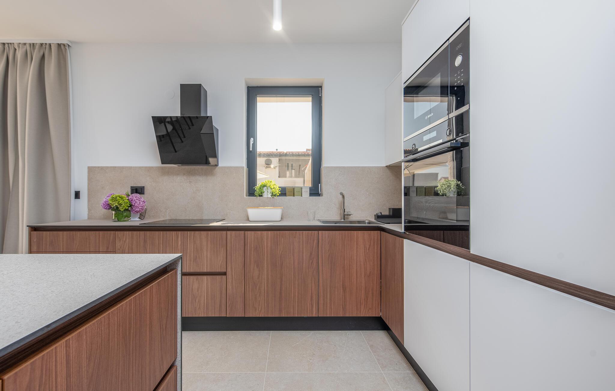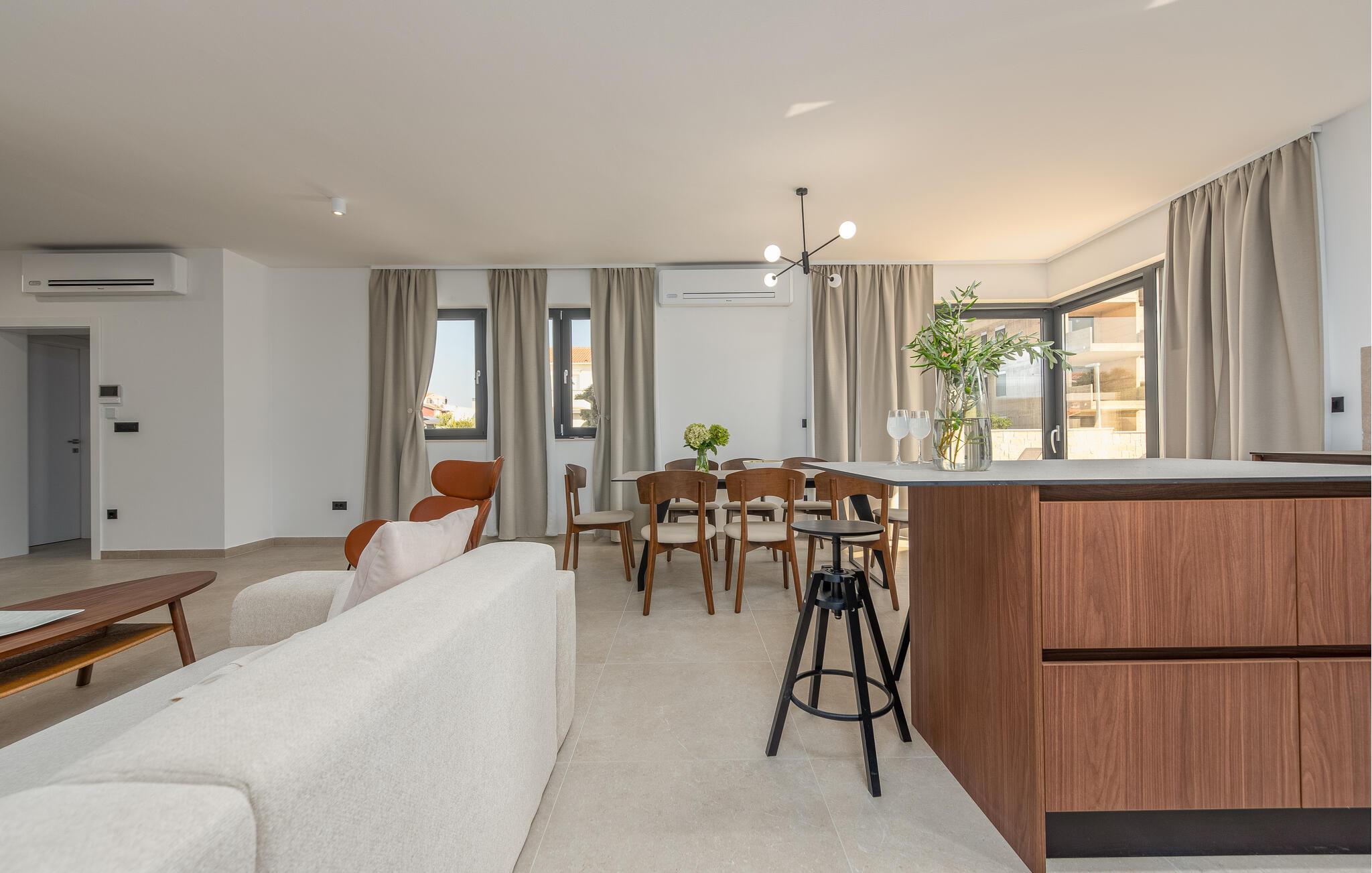Ihr Urlaub in diesem stilvollen Ferienhaus in Mandre verspricht Ihnen pure Entspannung. Das Haus besticht durch hochwertige Materialien und eine komfortable Ausstattung, die keine Wünsche offenlässt. Die moderne, geschmackvolle Einrichtung schafft eine einladende Atmosphäre, die sofort zum Wohlfühlen einlädt. Der großzügige Wohnbereich, mit Kaminofen, bietet viel Platz für Erholung und geselliges Beisammensein – perfekt für einen gelungenen Urlaub in Dalmatien.