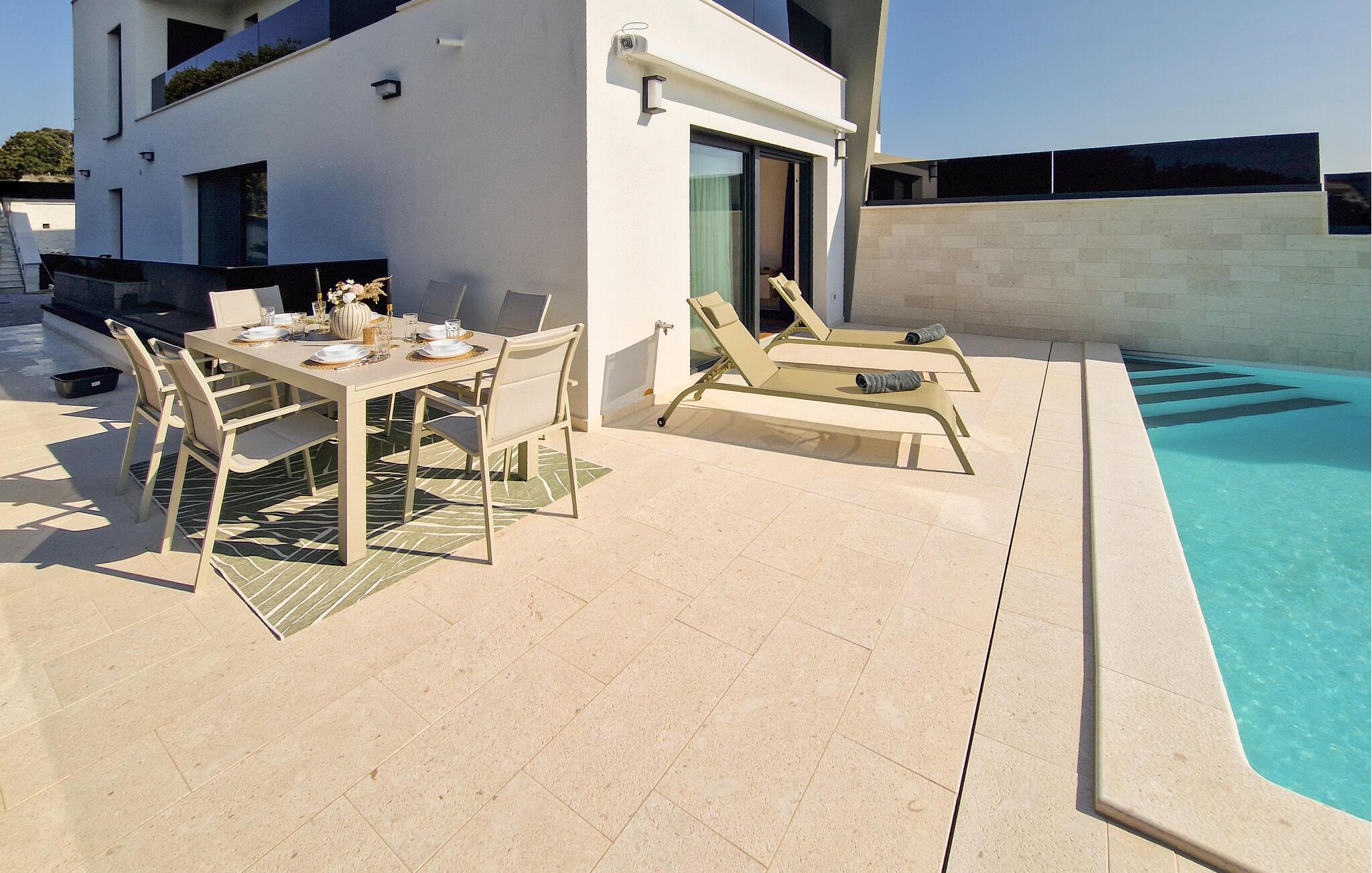 Verbringen Sie sonnige Stunden auf der weitläufigen Poolterrasse mit modernem Loungebereich. Schwimmen Sie im privaten Pool und entspannen Sie anschließend auf einer der bequemen Liegen mit Blick auf das Meer. Nutzen Sie die Außenküche mit Grill für gesellige Abende und servieren Sie Ihr Dinner am großen Terrassentisch beim Sonnenuntergang.