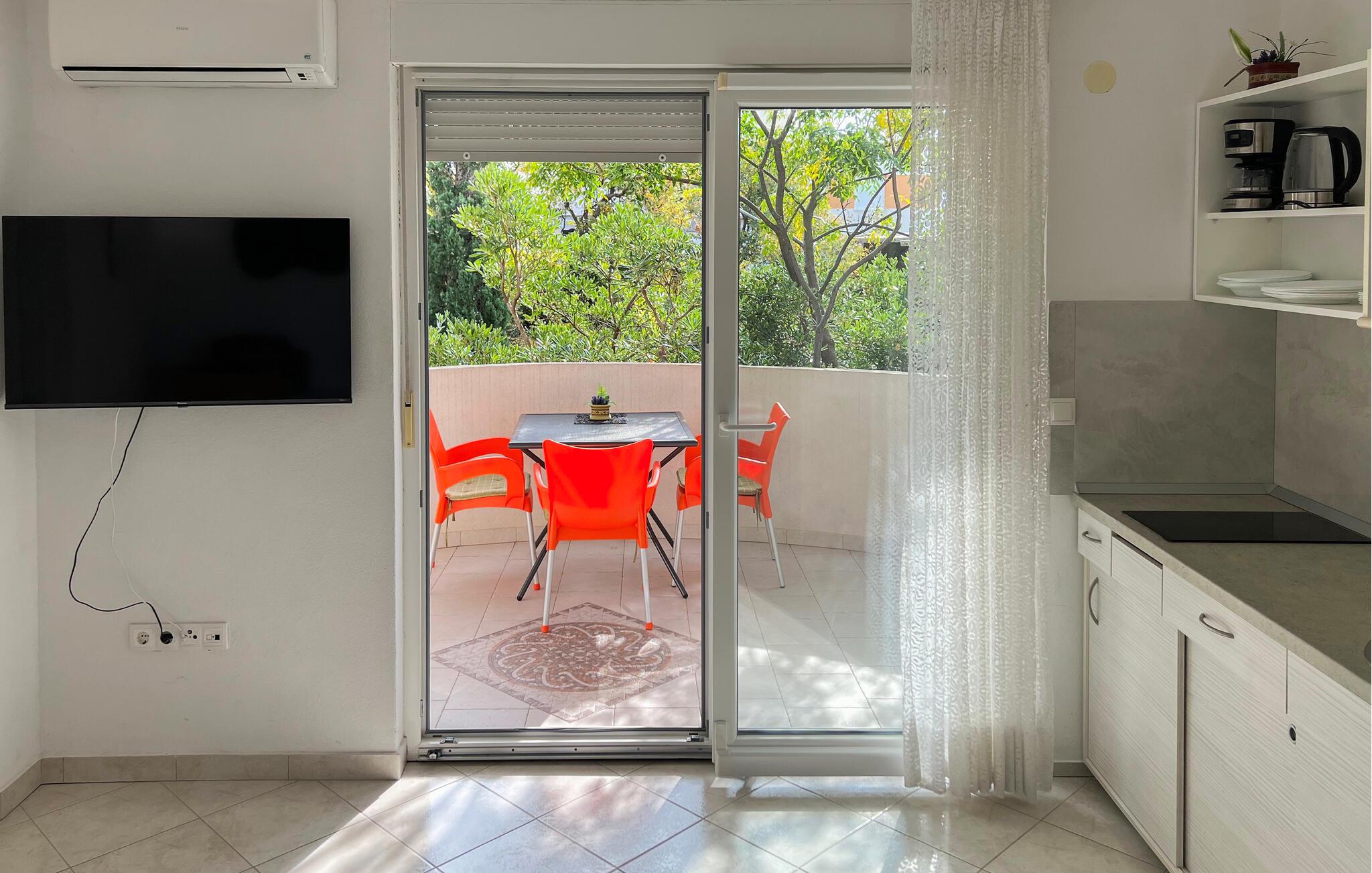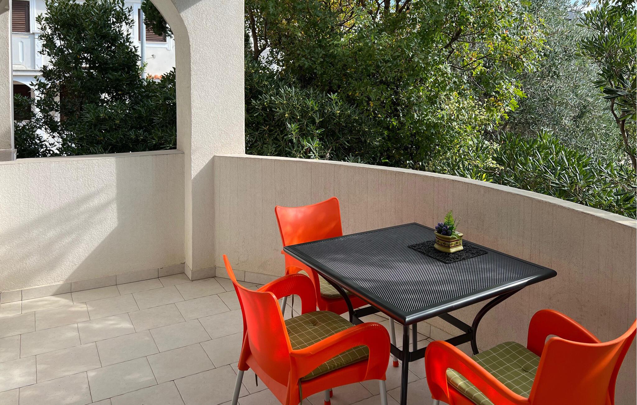 Auf Ihrer Terrasse können Sie die mediterrane Atmosphäre bei einem Frühstück im Freien auf sich wirken lassen. Nutzen Sie den Gemeinschaftsgrill, um sich ein leckeres Abendessen zuzubereiten, und plaudern Sie bei einem Glas Wein in die lauen Sommernächte hinein.