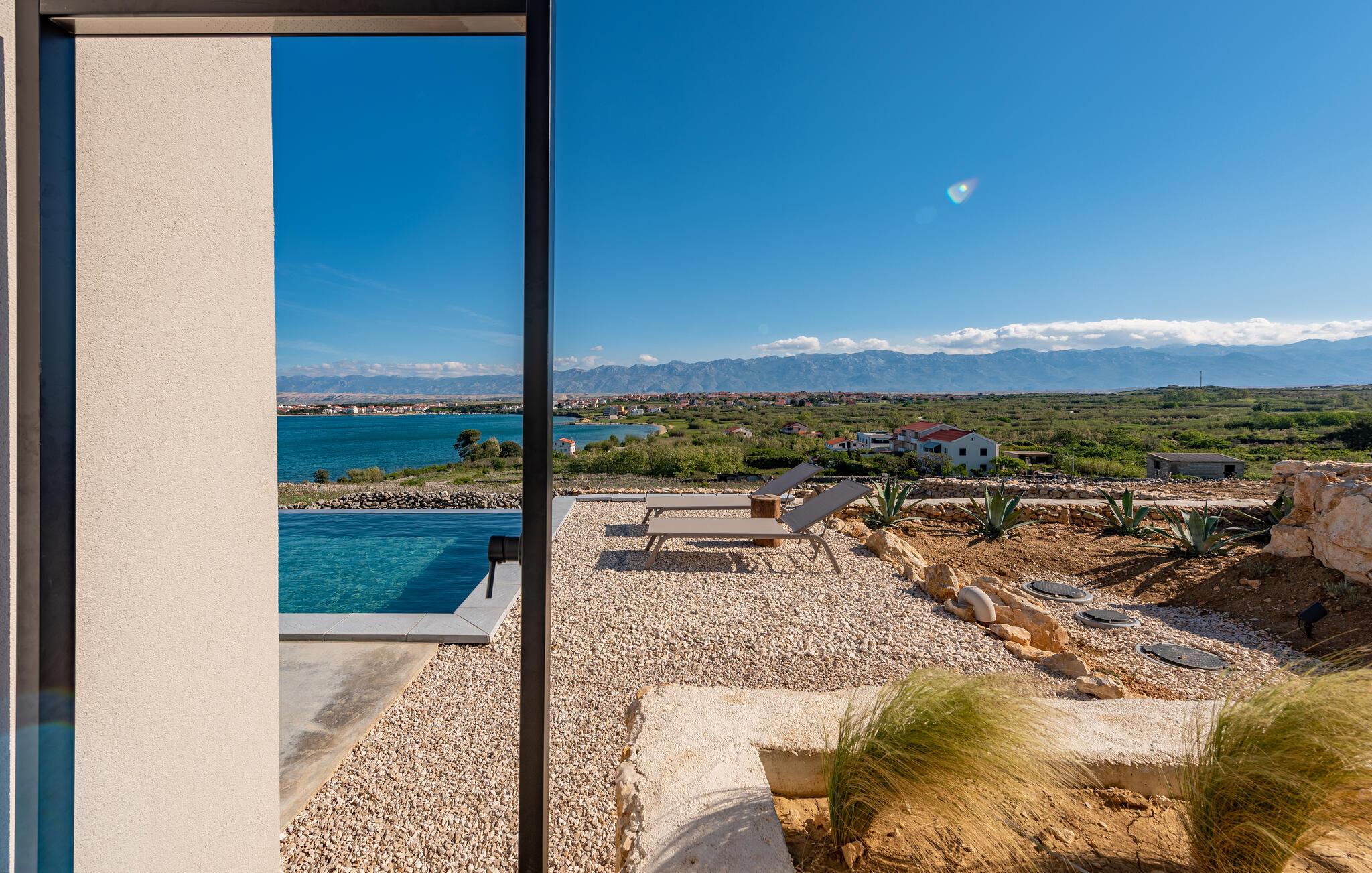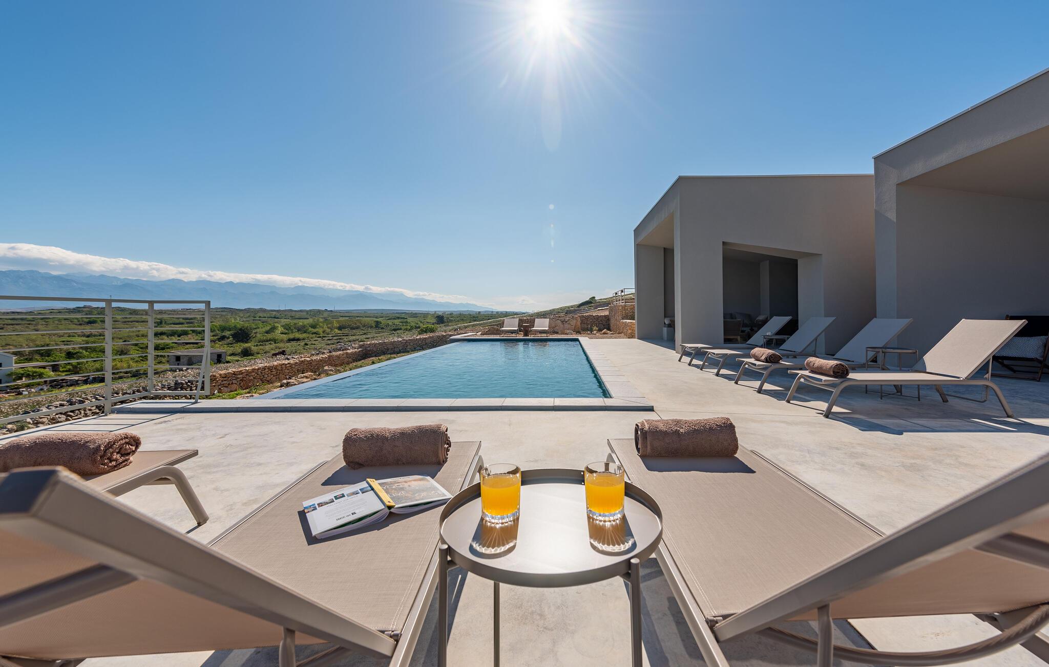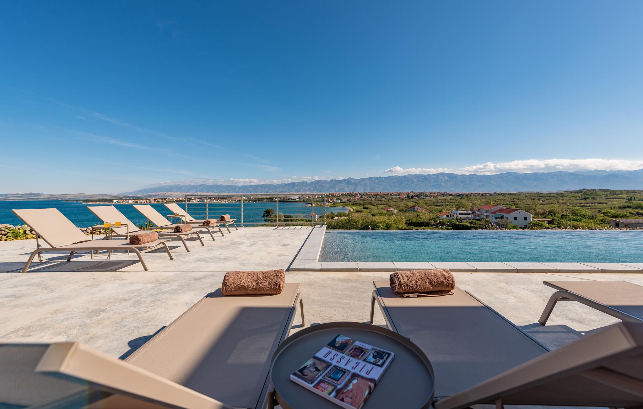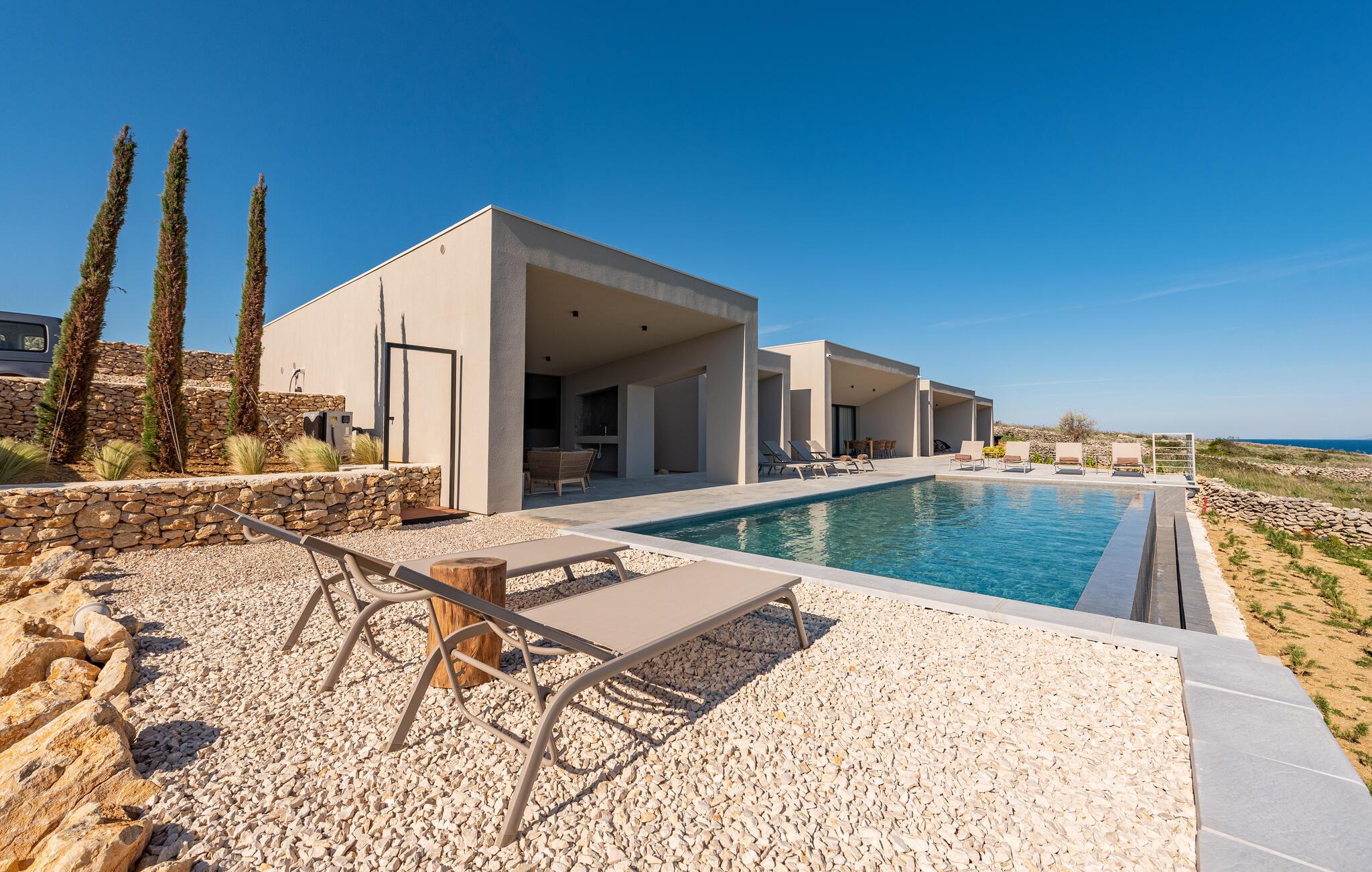 In diesem fantastischen Ferienhaus auf der Insel Pag wird es Ihnen an nichts fehlen. Das luxuriöse, moderne Ambiente, die komplette Ausstattung und die vielen Aktivitätsmöglichkeiten sorgen hier für einen gelungenen Wohlfühlurlaub. Genießen Sie gleich morgens die atemberaubende Panoramaaussicht auf das Meer durch die großflächigen Fensterfronten Ihrer Schlafzimmer. Auch beim gemeinsamen Frühstück am stilvollen Esstisch im Innenbereich oder auf einer der vielen Terrassen Ihres Ferienhauses haben Sie Meerblick. Planen Sie danach die Ausflüge des Tages. Oder spielen Sie im Entertainment-Bereich Ihres Ferienhaus eine Partie Billard oder ein Spiel auf der Spielkonsole. Auch mit Meerblick können Sie draußen im Pool planschen oder auf den Sonnenliegen ein kühles Getränk genießen. In der voll ausgestatteten, stilvollen Küche können Sie lokale Zutaten zu köstlichen Gerichten verarbeiten. Der offene Raum ist eine Oase der Gemütlichkeit und lädt dazu ein, gemeinsam zu kochen und zu gemeinsamen Familienabenden zusammenzukommen.