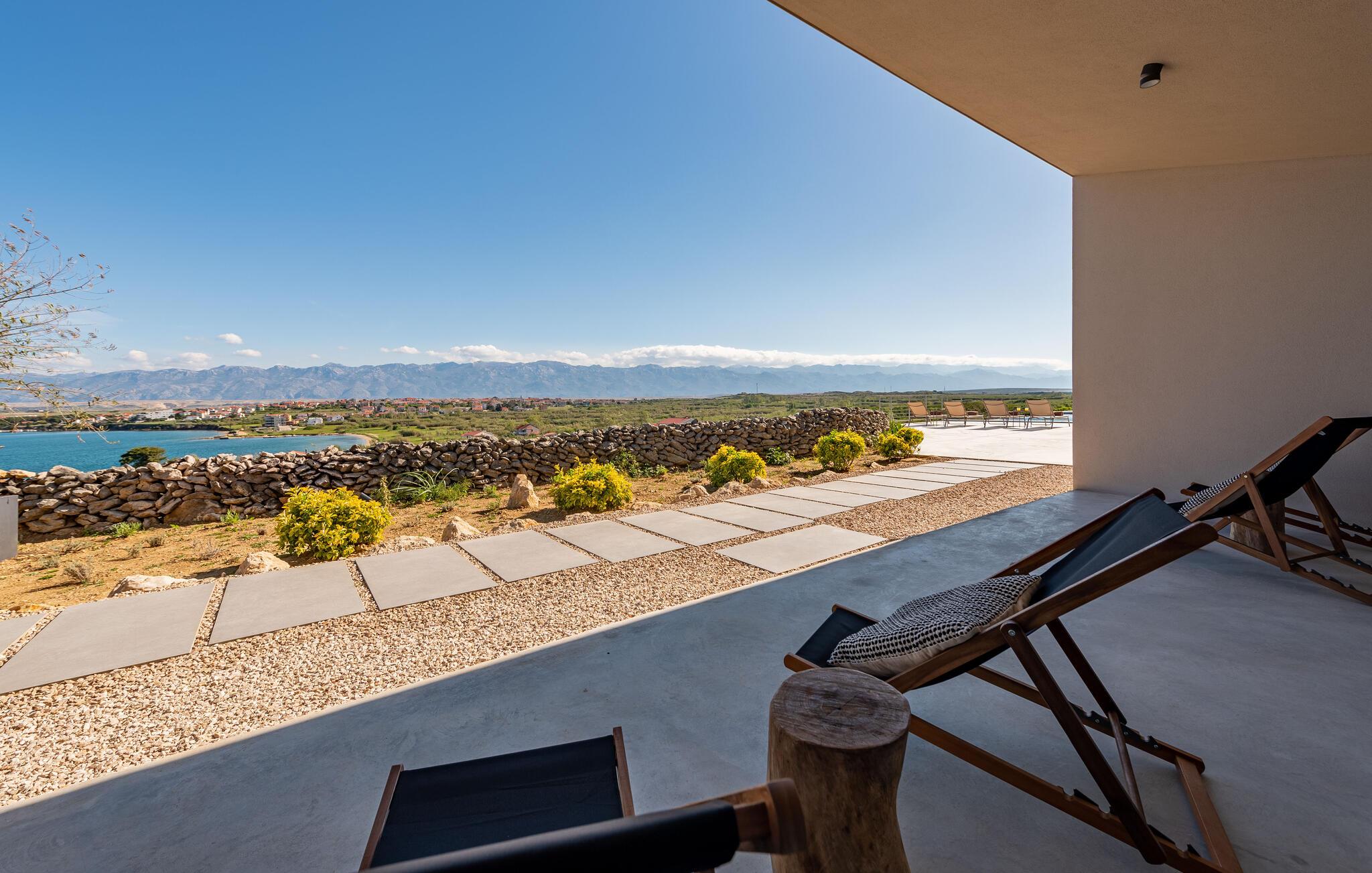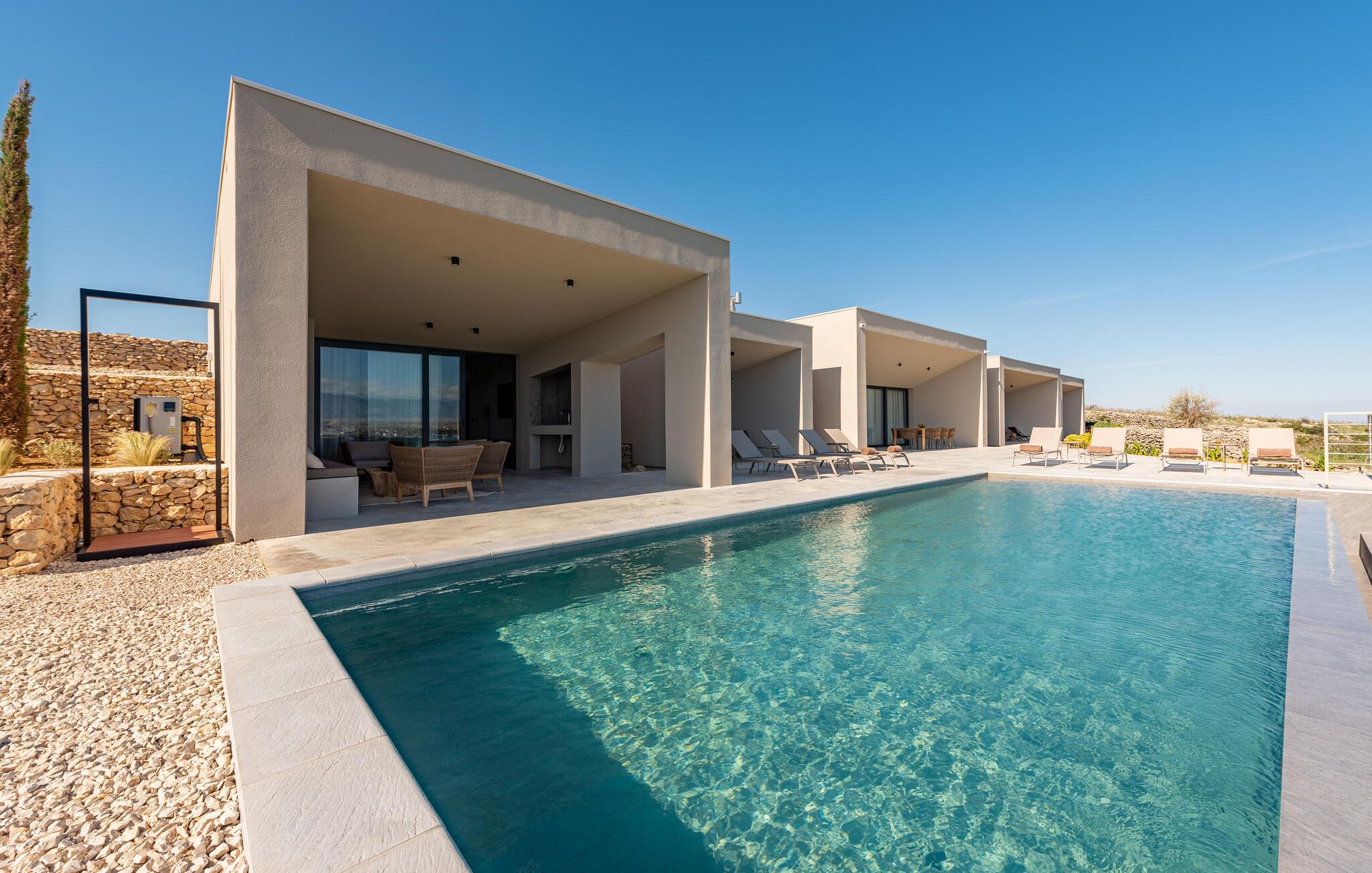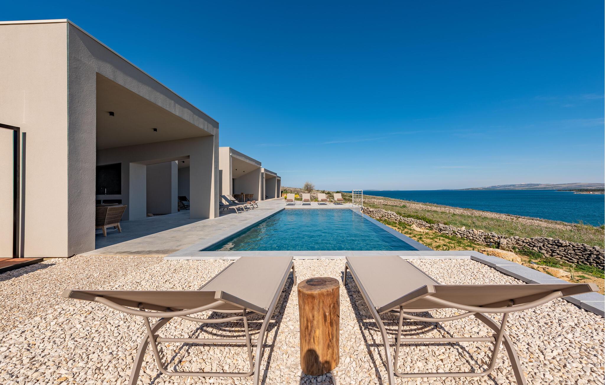 In diesem fantastischen Ferienhaus auf der Insel Pag wird es Ihnen an nichts fehlen. Das luxuriöse, moderne Ambiente, die komplette Ausstattung und die vielen Aktivitätsmöglichkeiten sorgen hier für einen gelungenen Wohlfühlurlaub. Genießen Sie gleich morgens die atemberaubende Panoramaaussicht auf das Meer durch die großflächigen Fensterfronten Ihrer Schlafzimmer. Auch beim gemeinsamen Frühstück am stilvollen Esstisch im Innenbereich oder auf einer der vielen Terrassen Ihres Ferienhauses haben Sie Meerblick. Planen Sie danach die Ausflüge des Tages. Oder spielen Sie im Entertainment-Bereich Ihres Ferienhaus eine Partie Billard oder ein Spiel auf der Spielkonsole. Auch mit Meerblick können Sie draußen im Pool planschen oder auf den Sonnenliegen ein kühles Getränk genießen. In der voll ausgestatteten, stilvollen Küche können Sie lokale Zutaten zu köstlichen Gerichten verarbeiten. Der offene Raum ist eine Oase der Gemütlichkeit und lädt dazu ein, gemeinsam zu kochen und zu gemeinsamen Familienabenden zusammenzukommen.