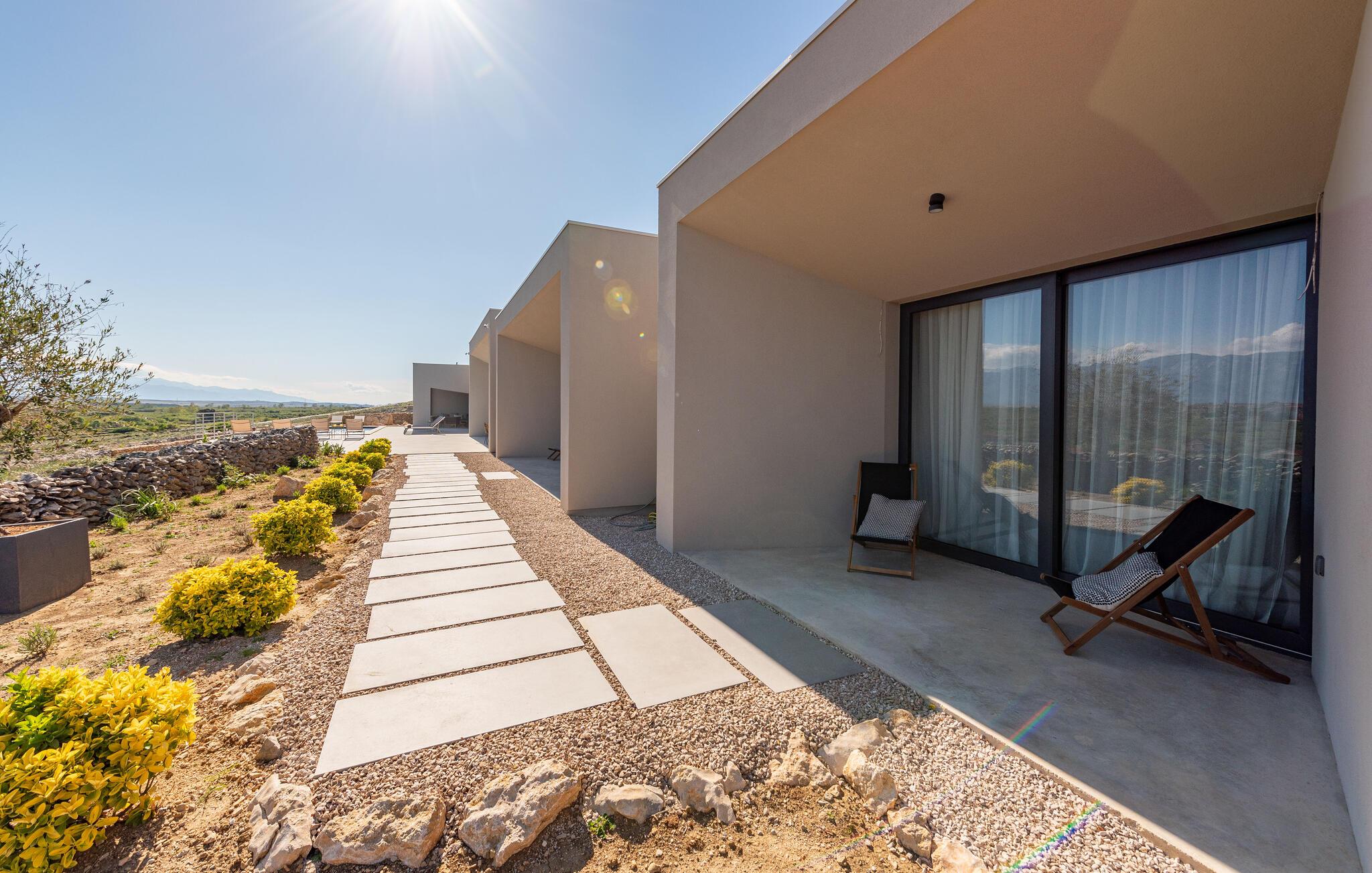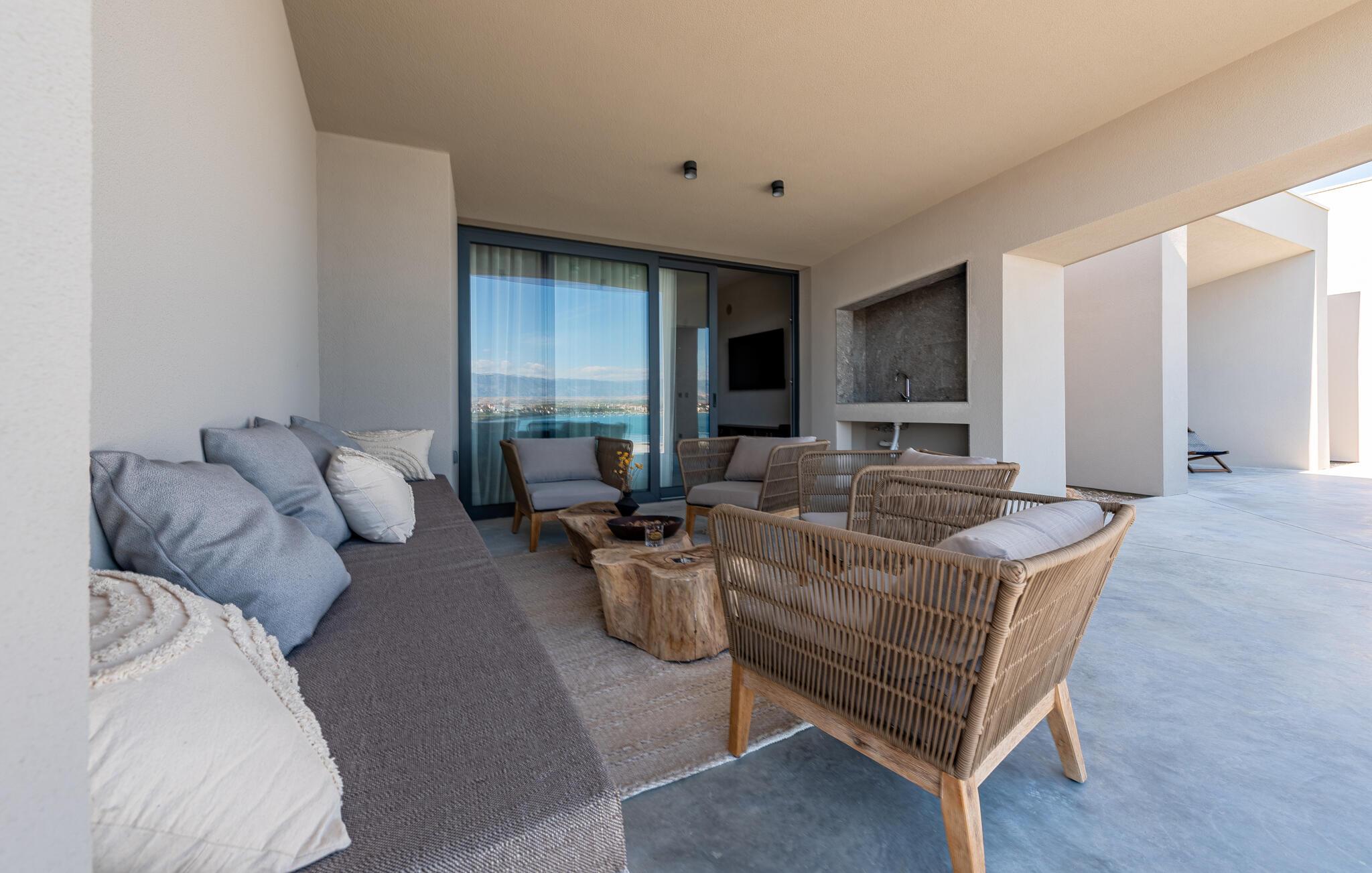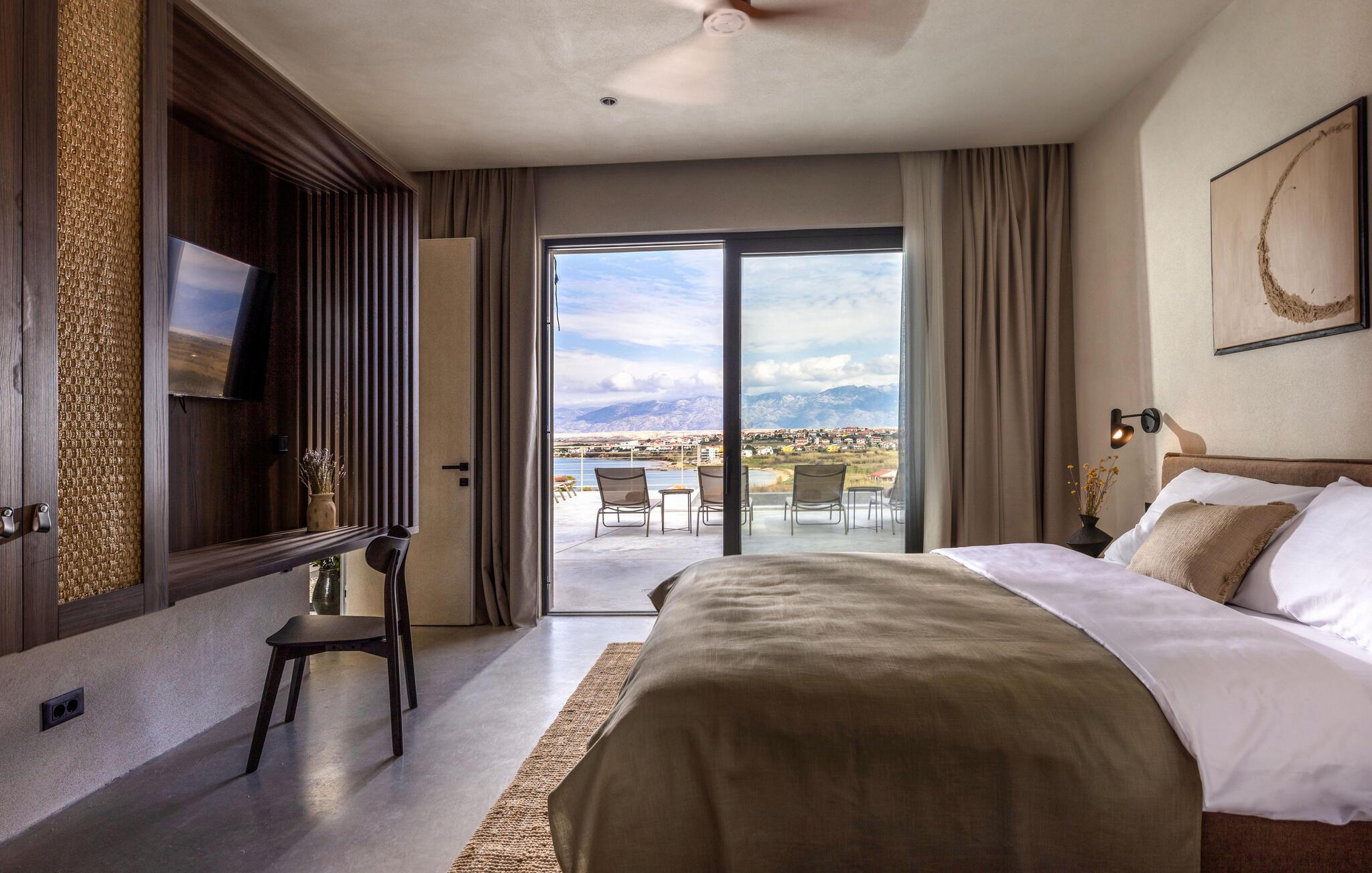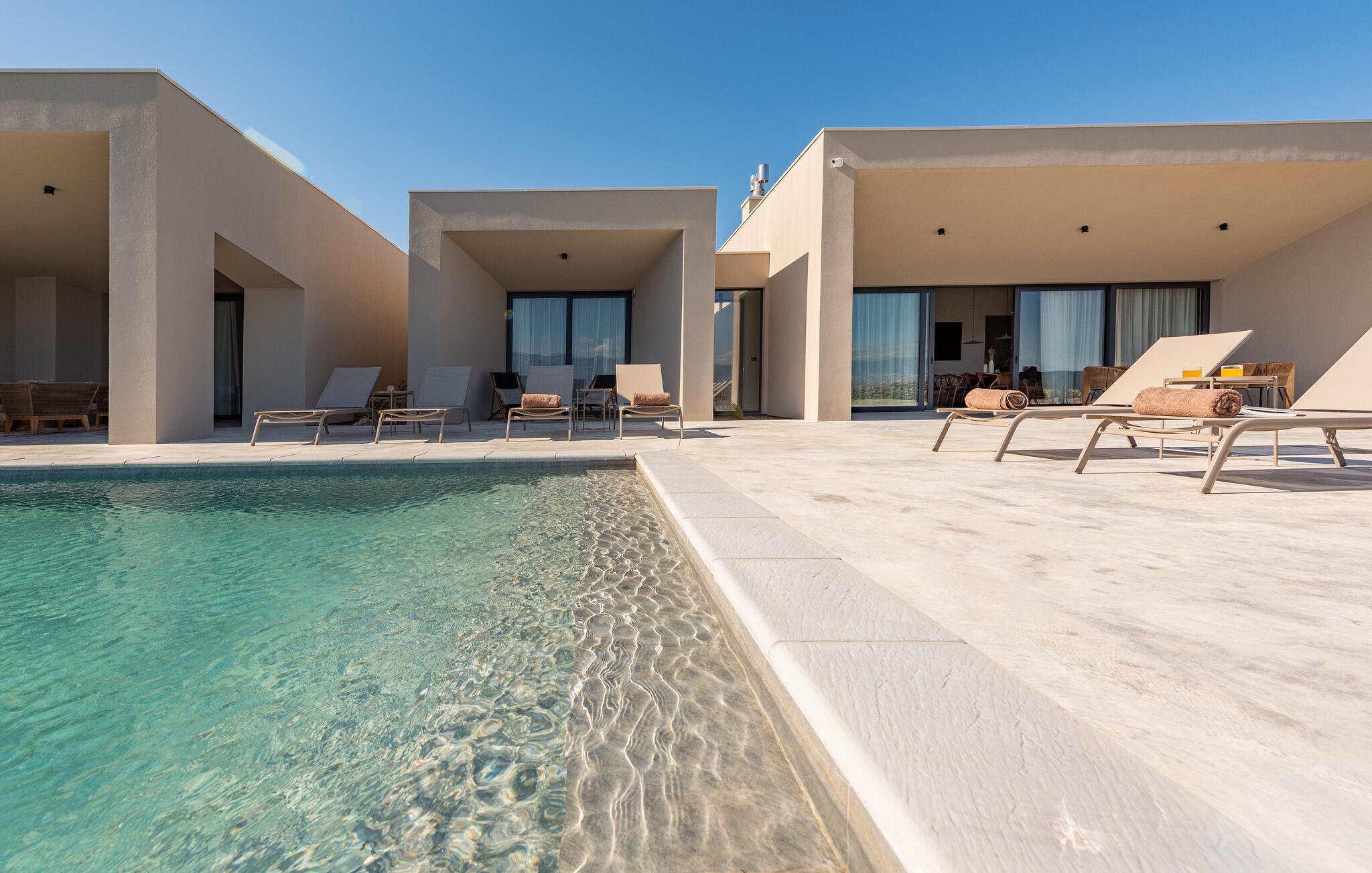 In diesem fantastischen Ferienhaus auf der Insel Pag wird es Ihnen an nichts fehlen. Das luxuriöse, moderne Ambiente, die komplette Ausstattung und die vielen Aktivitätsmöglichkeiten sorgen hier für einen gelungenen Wohlfühlurlaub. Genießen Sie gleich morgens die atemberaubende Panoramaaussicht auf das Meer durch die großflächigen Fensterfronten Ihrer Schlafzimmer. Auch beim gemeinsamen Frühstück am stilvollen Esstisch im Innenbereich oder auf einer der vielen Terrassen Ihres Ferienhauses haben Sie Meerblick. Planen Sie danach die Ausflüge des Tages. Oder spielen Sie im Entertainment-Bereich Ihres Ferienhaus eine Partie Billard oder ein Spiel auf der Spielkonsole. Auch mit Meerblick können Sie draußen im Pool planschen oder auf den Sonnenliegen ein kühles Getränk genießen. In der voll ausgestatteten, stilvollen Küche können Sie lokale Zutaten zu köstlichen Gerichten verarbeiten. Der offene Raum ist eine Oase der Gemütlichkeit und lädt dazu ein, gemeinsam zu kochen und zu gemeinsamen Familienabenden zusammenzukommen.