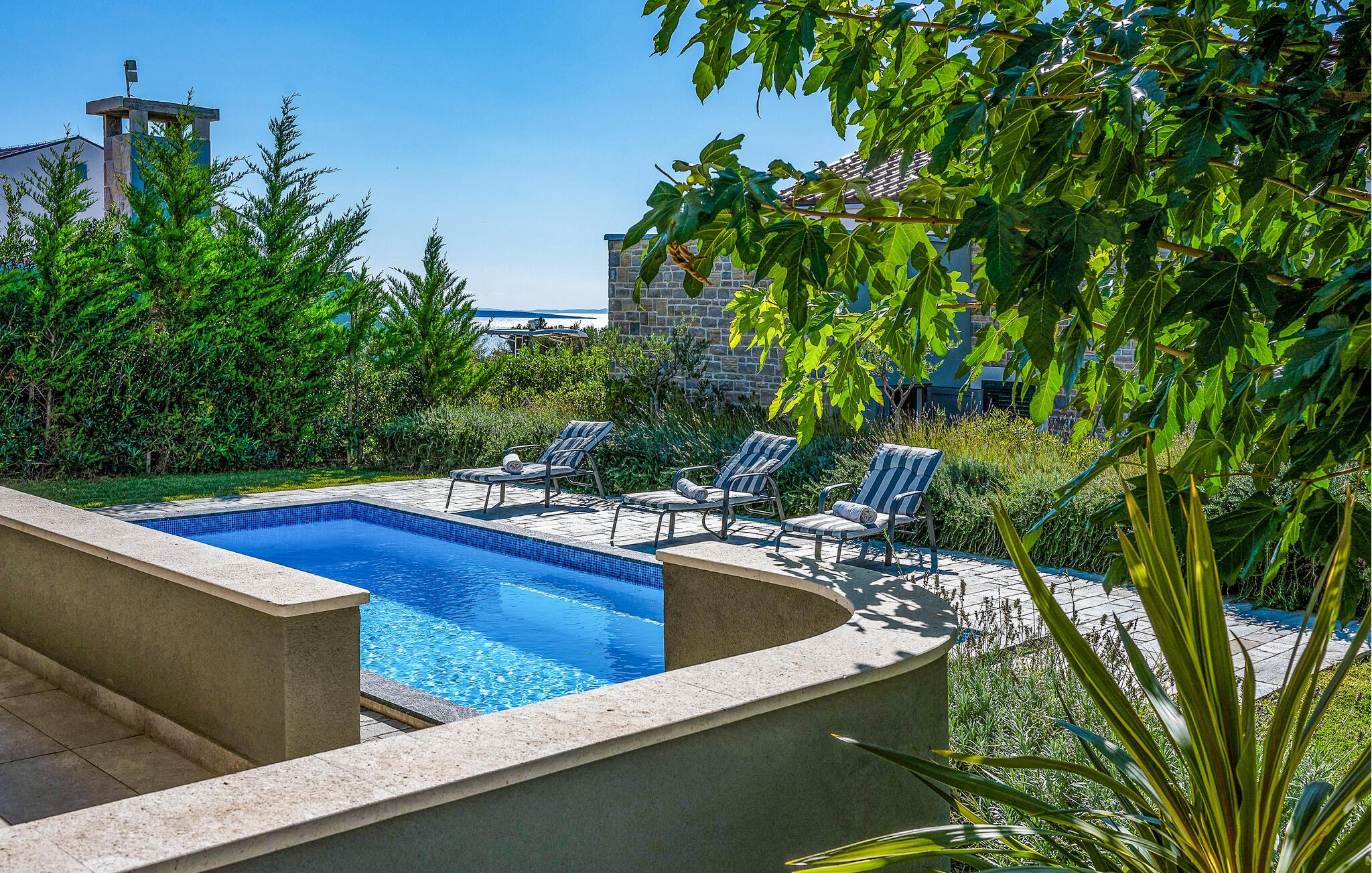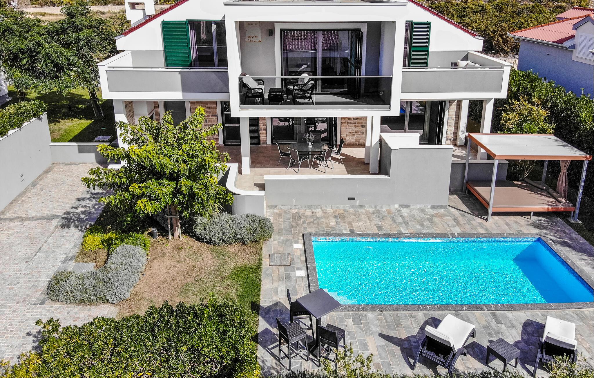Reisen Sie auf die Insel Pag und freuen sich auf Ihren Aufenthalt in diesem großen und modernen Ferienhaus, das keine Ihrer Wünsche offenlässt. Genießen Sie die schönen Räume, die sich über zwei Stockwerke verteilen und Ihnen Komfort und eine ansprechende Einrichtung versprechen. Gehen Sie nach dem Aufstehen von Ihrem Schlafzimmer direkt auf Ihren Balkon und trinken Ihren Morgenkaffee im Freien oder entspannen sich bei Ihren Yogaübungen. Kommen Sie anschließend im offenen Wohnraum zum Frühstück zusammen und verbringen die anschließenden Stunden beim Baden im Pool oder sonnen auf dem Sonnenbett und -liegen.