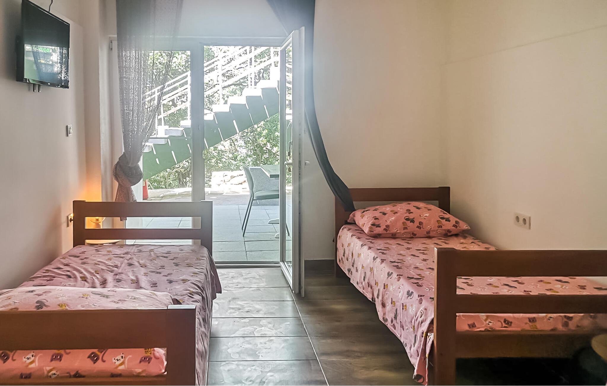 Treten Sie schon morgens ins Freie und genießen Sie den weiten Blick über das kristallklare Meer. Wenn Sie Lust auf eine Erfrischung haben, führen Sie schmale Wege und Stufen durch einen Pinienwald direkt zum naturbelassenen Kies- und Sandstrand. Wer Lust auf sportliche Betätigung hat, spielt eine Runde Tischtennis oder Badminton auf dem großen Naturgrundstück.