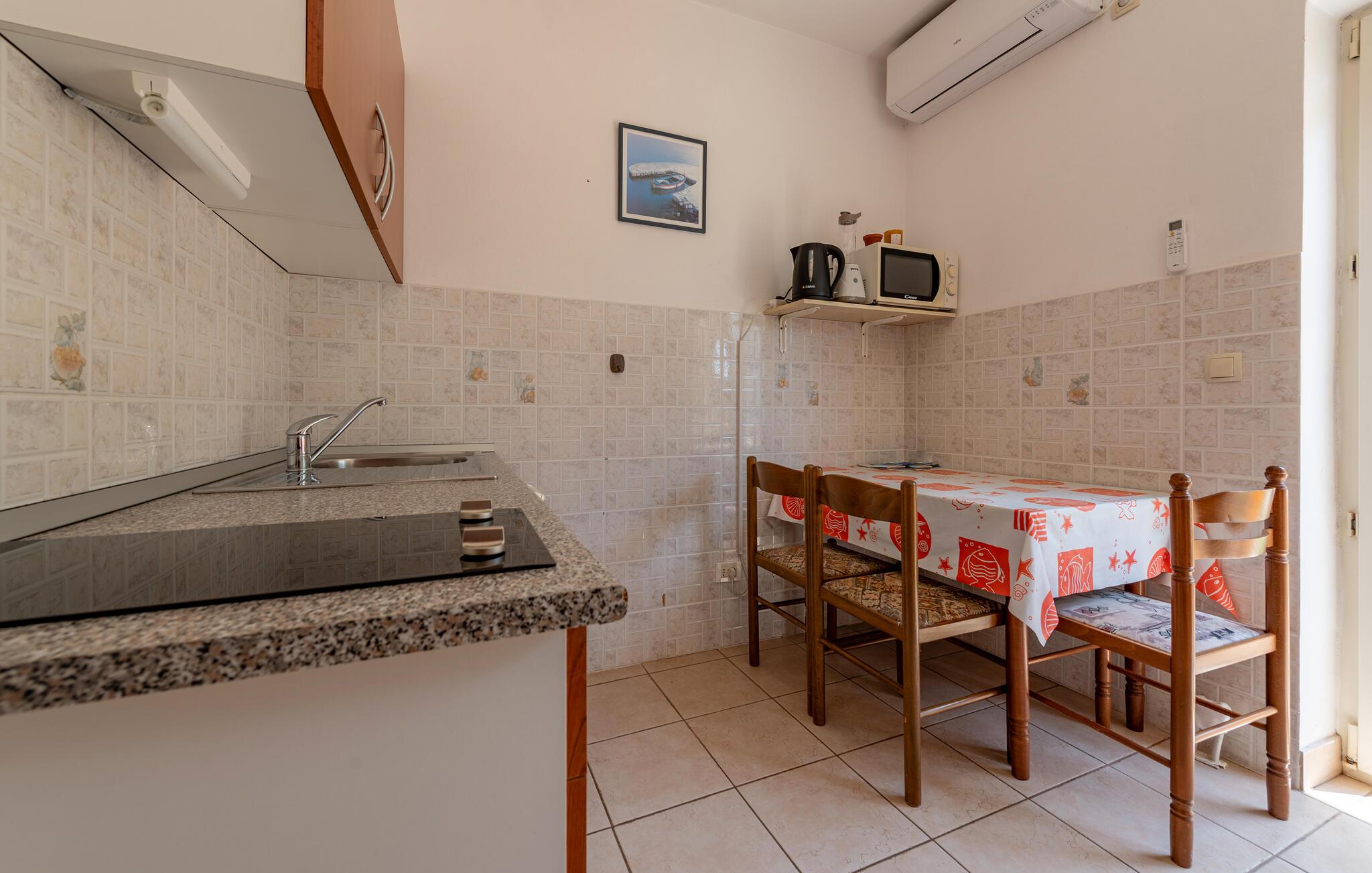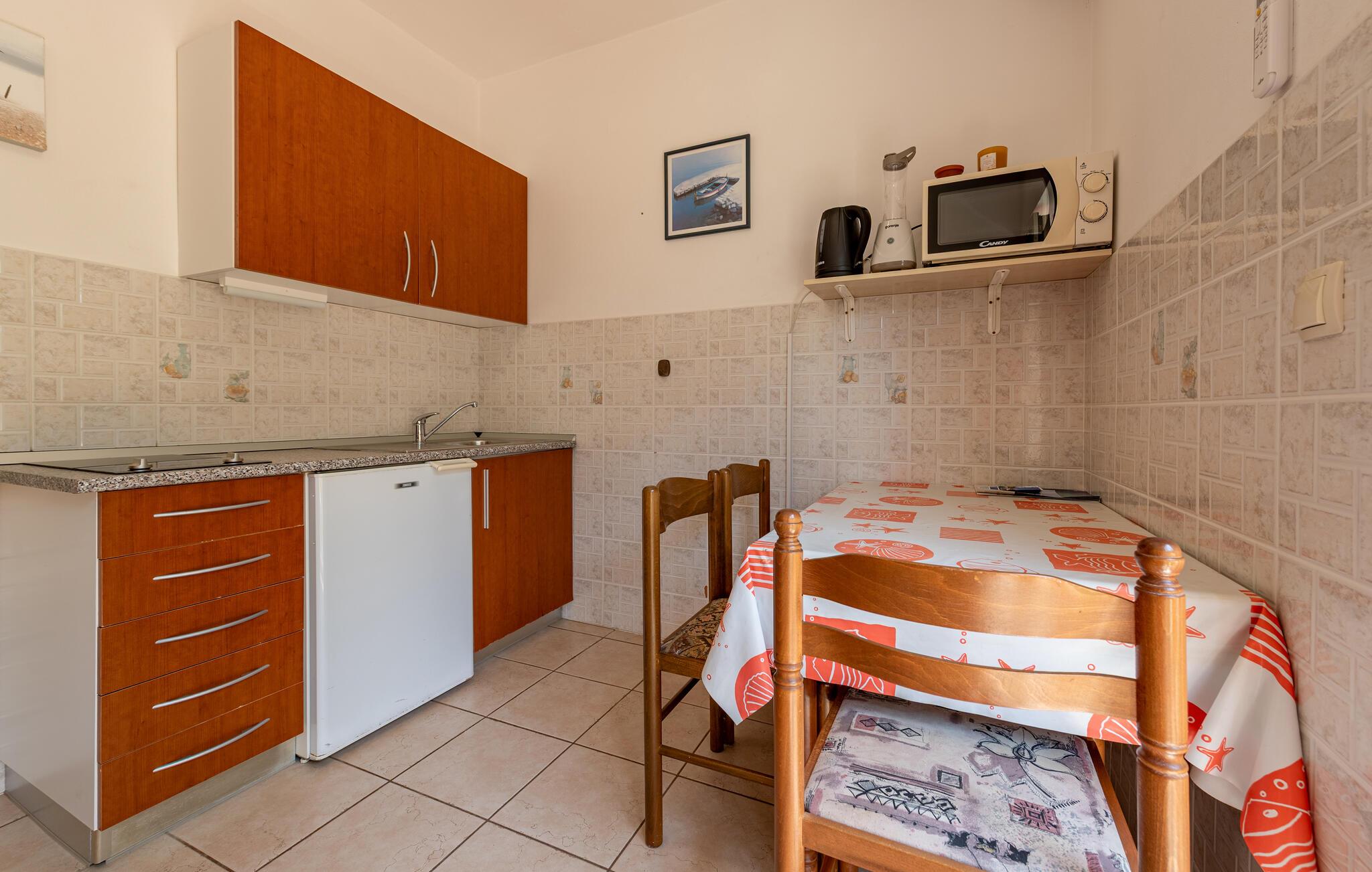 Freuen Sie sich auf ruhige Stunden auf Ihrem einladenden Balkon, wo Sie in vertrauter Zweisamkeit einen kroatischen Wein genießen und den Tag mit einem Frühstück im Freien beginnen können. Nutzen Sie die gemeinschaftlichen Grillmöglichkeiten für gesellige Abende, knüpfen Sie Kontakte an der Außenküche oder spielen Sie eine Runde Tischtennis.