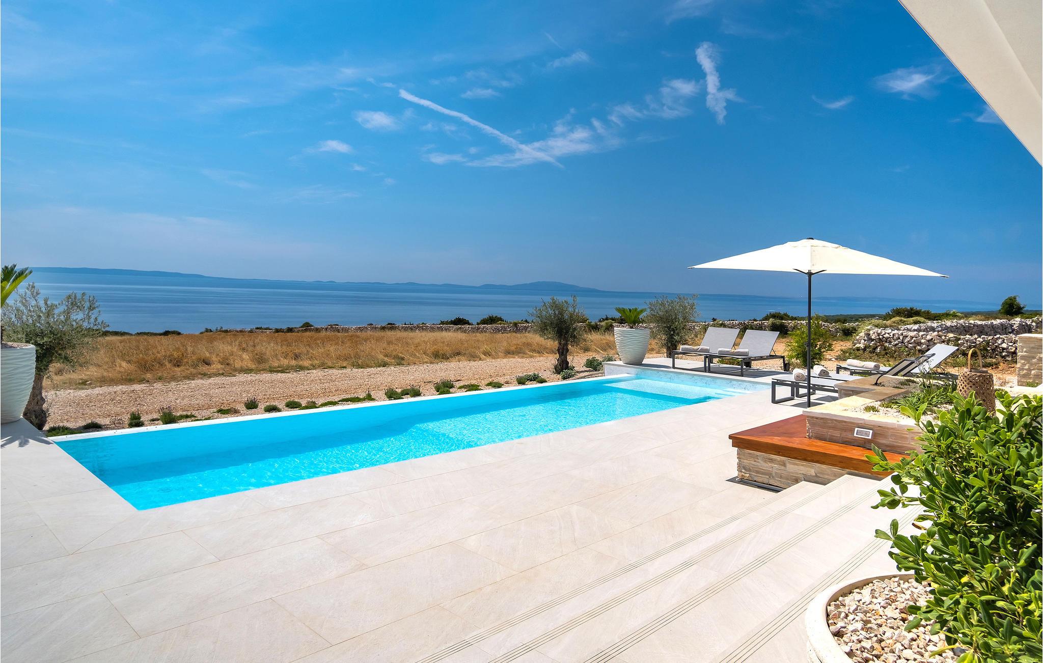 Auf der Insel Pag begrüßt Sie dieses großartige Haus in traumhafter Lage. Im Innenraum erwarten Sie hochwertig eingerichtete Zimmer, die einen sehr stilvollen Eindruck machen. Überall besticht das Haus durch bedachte Lösungen und Materialien von hoher Qualität. Bereiten Sie in der ansprechenden Küche Ihre Köstlichkeiten beim Blick auf die Umgebung zu oder entspannen Sie im Sofa bei der Urlaubslektüre, von wo aus Sie eine schöne Aussicht auf die Umgebung genießen und nur wenige Schritte Sie von einem Sprung in den Außenpool trennen. Der Aktivitätsraum lädt zu einer Runde Billard ein, und wenn Sie lieber zusehen möchten, können Sie sich es im Sofa bei einem abgekühlten Getränk Ihrer Wahl bequem machen.