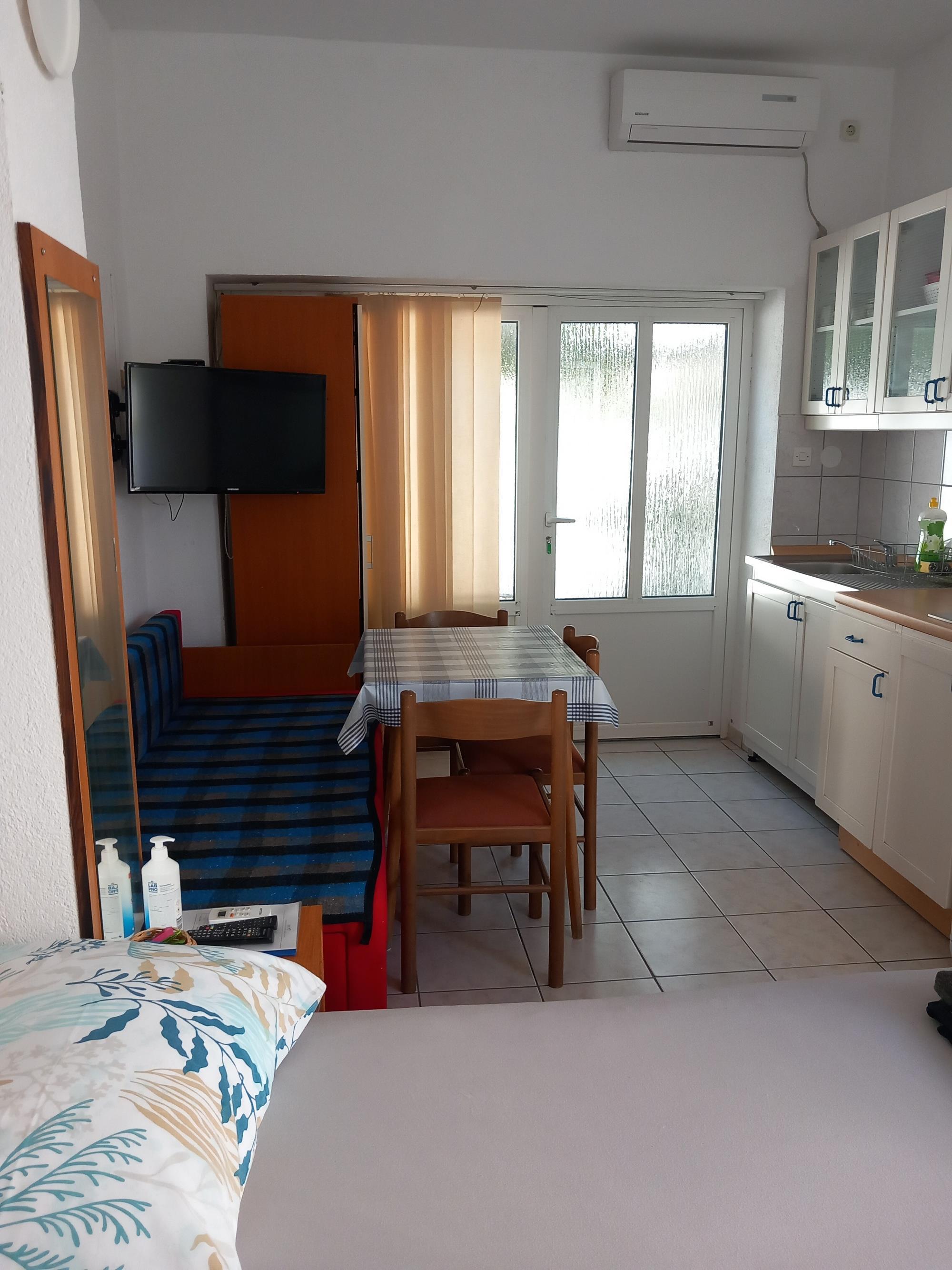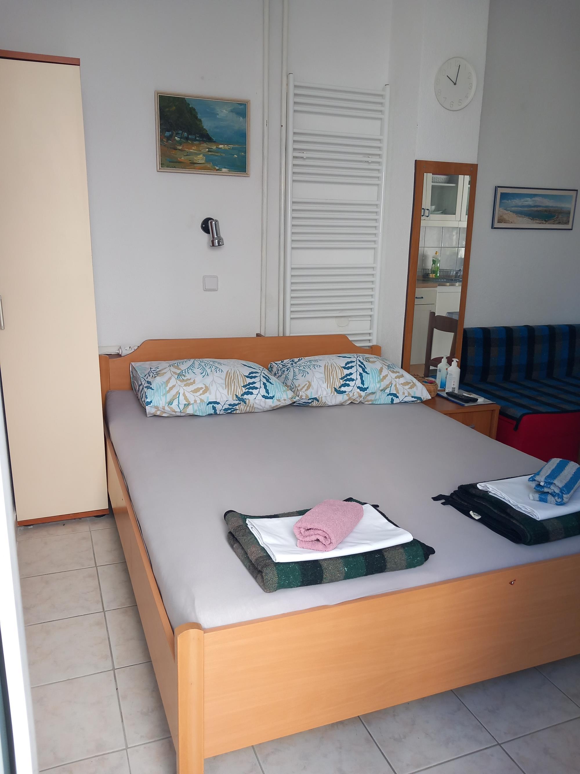 Studio flat can accommodate 2 guests. Beds are situated in 1 sleeping rooms, within 24m2. Guests can use a private terrace to enjoy the warm summer evenings. The studio offers the sea view. Food can be prepared using barbecue which is shared with other guests too. This accommodation unit welcomes pets at no additional costs.