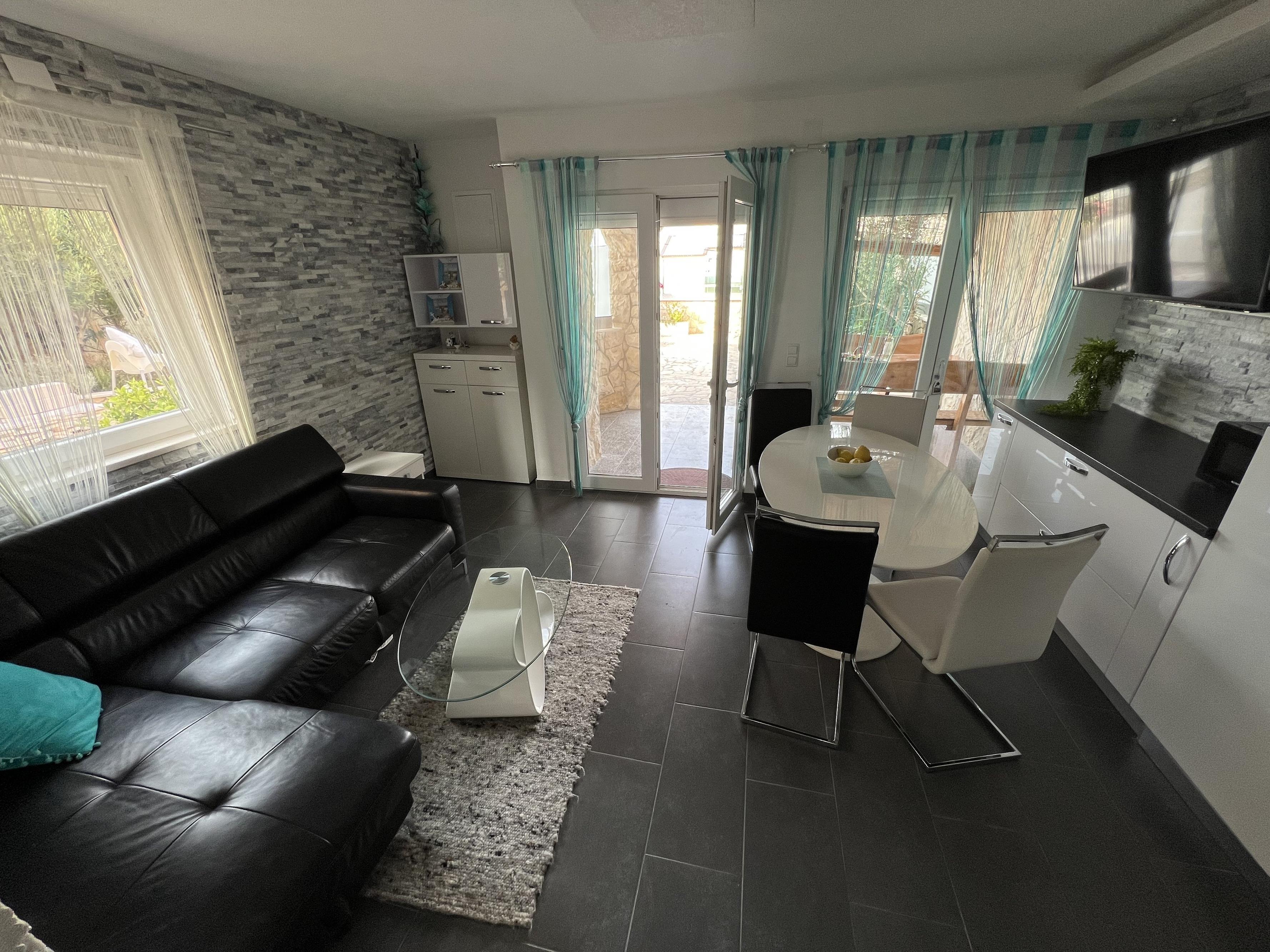 Apartment can accommodate 5 guests. Beds are situated in 2 sleeping rooms, but also in the living room, within 50m2. Guests can use a private terrace to enjoy the warm summer evenings. The apartment offers the sea view. Food can be prepared using barbecue which is shared with other guests too. Shared pool is on disposal during stay.